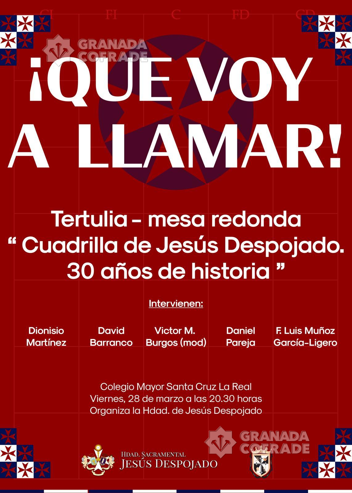 La cofradía de Nuestro Padre Jesús Despojado de sus Vestiduras convoca para estos próximos días distintas actividades. De esta manera, hoy viernes 28 de marzo a las 20:30 h. en el Colegio Mayor de Santa Cruz la Real, habrá una tertulia mesa-redonda bajo el título «¡Que voy a llamar!» por el 30 aniversario de la cuadrilla de Jesús Despojado. Participan en la misma Dionisio Martínez, David Barranco, Daniel Pareja, Francisco Luis Muñoz García-Ligero y será moderada por Víctor Manuel Burgos.