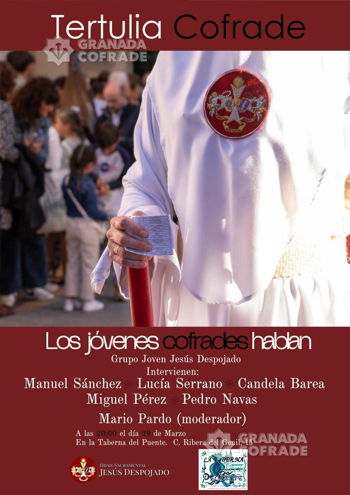 Al siguiente día, sábado 29, en la Taberna del Puente, en Ribera del Genil, una tertulia cofrade organizada por el Grupo Joven de la hermandad, «Los jóvenes cofrades hablan». Está convocada a las ocho de la noche y se cuenta con la participación de Manuel Sánchez, Lucía Serrano, Candela Barea, Miguel Pérez y Pedro Navas, estando moderada por Mario Pardo. Ese mismo día y en la parroquia de San Emilio, se celebra a las 11.15 horas, la «Escuela de Nazarenos» que es un lugar para la reflexión, el debate y la convivencia «entre quienes vestimos la túnica de nazareno».