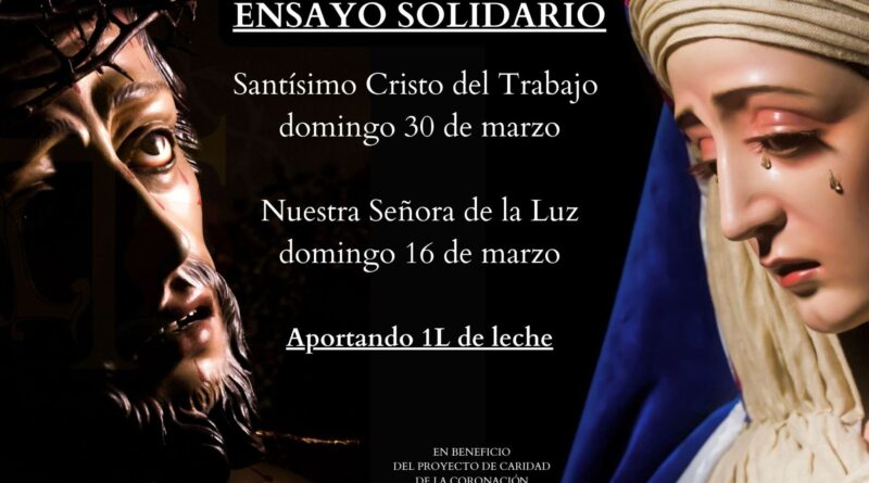 La Vocalía de Caridad de la hermandad del Santísimo Cristo del Trabajo organiza una actividad solidaria para el último ensayo de la cuadrilla de costaleros de Nuestra Señora de la Luz y el último ensayo de la cuadrilla de costaleras del Santísimo Cristo del Trabajo tendrán un carácter solidario. La idea es que ambas cuadrillas aporten 1 litro de leche y todos los recaudados irán destinados en beneficio al proyecto de Caridad de la Coronación Canónica de la Virgen de la Luz.