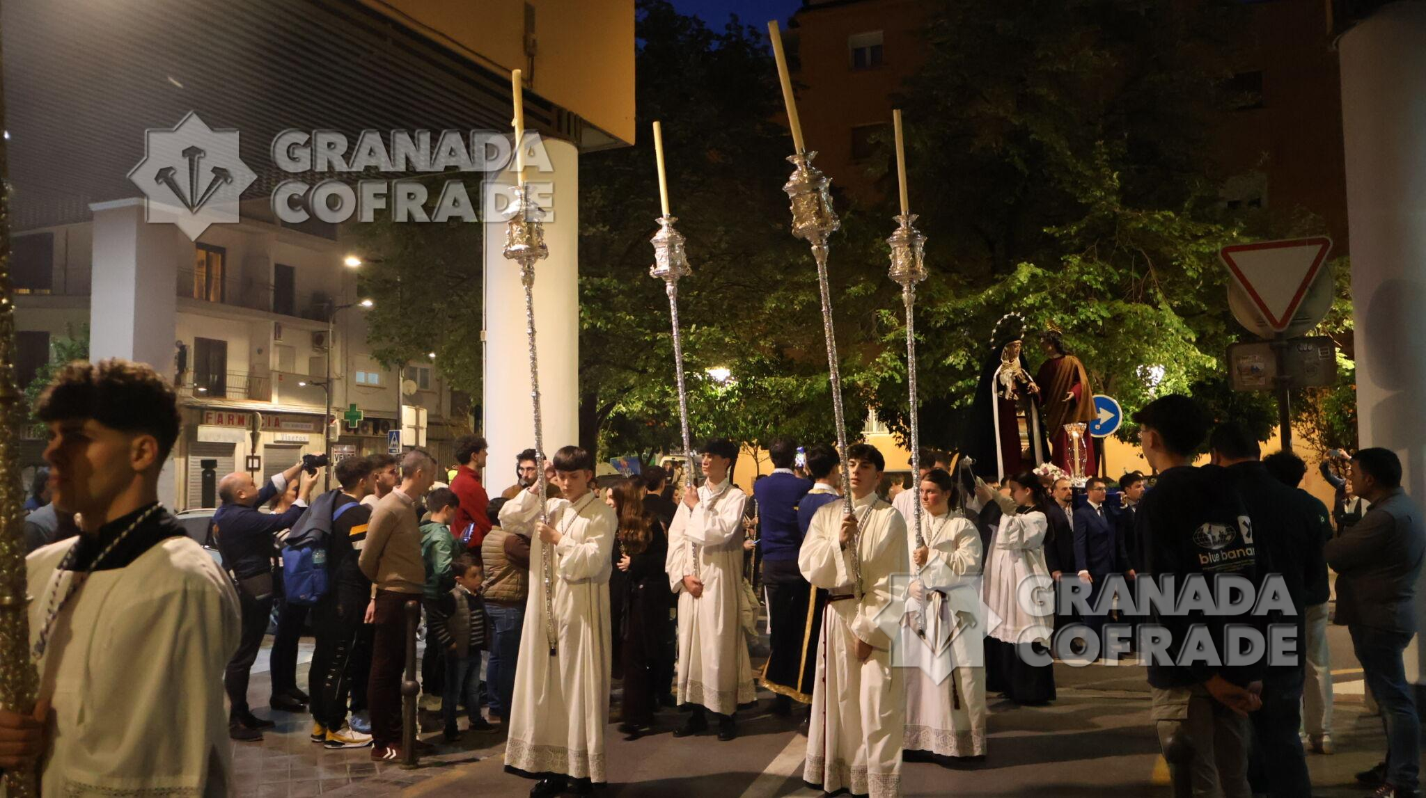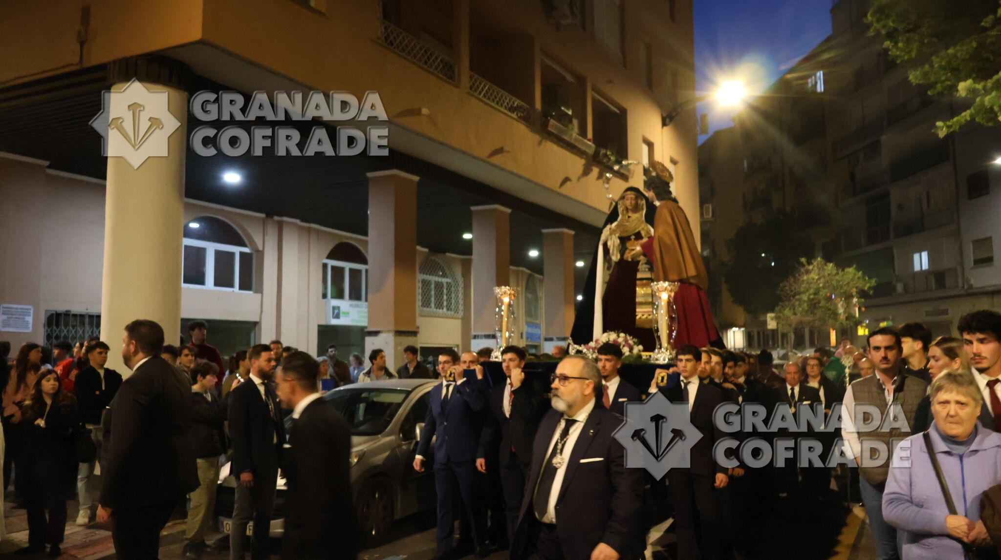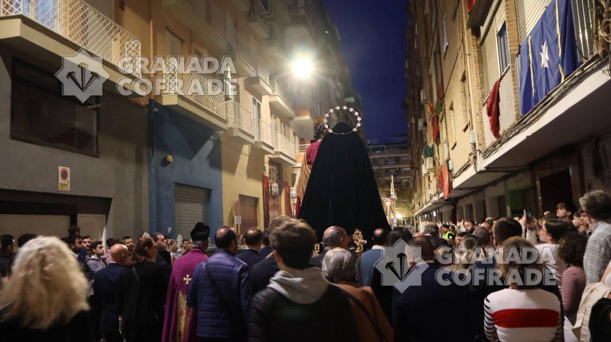Un recorrido breve desde la calle Lecuona hasta la casa de hermandad de Jesús Despojado fue el recorrido anoche para el traslado de María Santísima del Dulce Nombre y San Juan Evangelista de cara a la preparación de la salida del Domingo de Ramos. Un cortejo sencillo, con cruz alzada y ciriales seguido del cuerpo litúrgico formaba la comitiva que estuvo en todo momento acompañado por agentes de la Policía Local para el normal desarrollo del traslado.