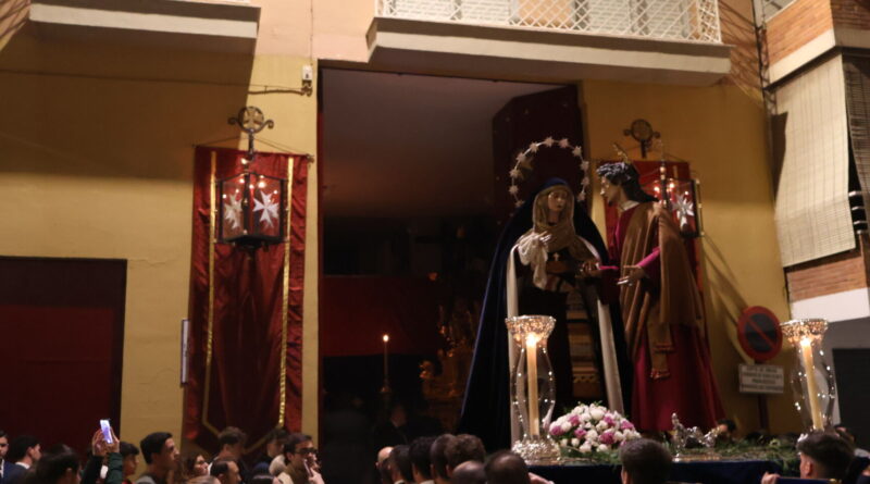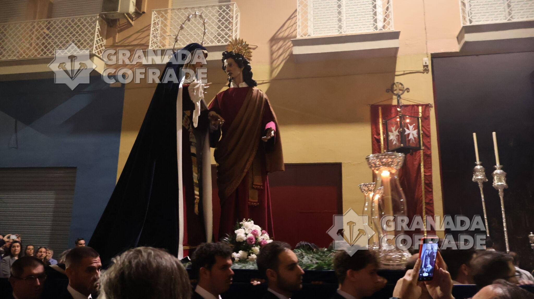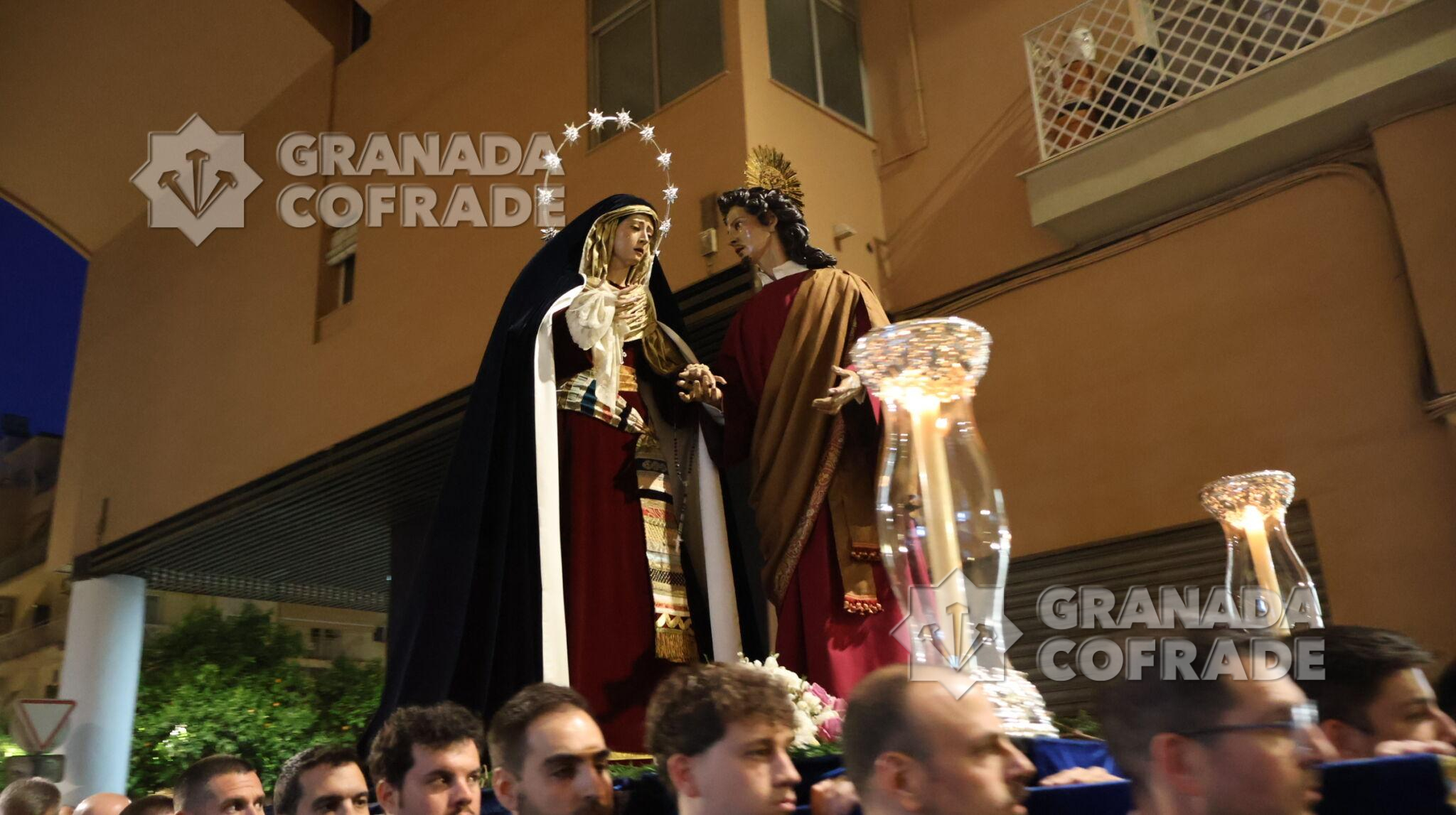 Un recorrido breve desde la calle Lecuona hasta la casa de hermandad de Jesús Despojado fue el recorrido anoche para el traslado de María Santísima del Dulce Nombre y San Juan Evangelista de cara a la preparación de la salida del Domingo de Ramos. Un cortejo sencillo, con cruz alzada y ciriales seguido del cuerpo litúrgico formaba la comitiva que estuvo en todo momento acompañado por agentes de la Policía Local para el normal desarrollo del traslado.