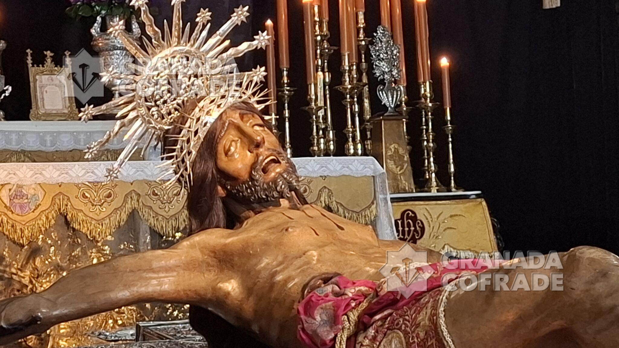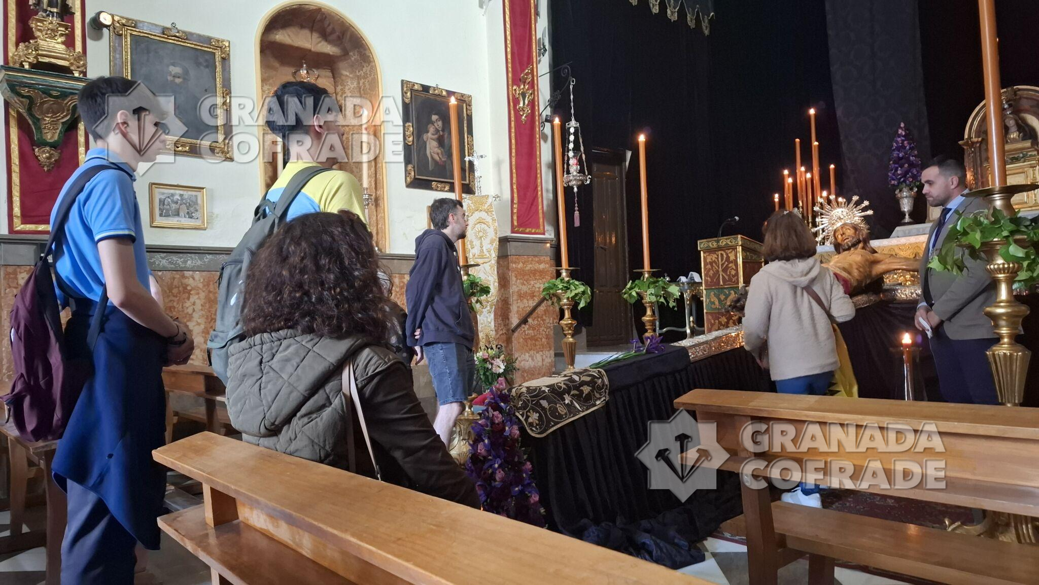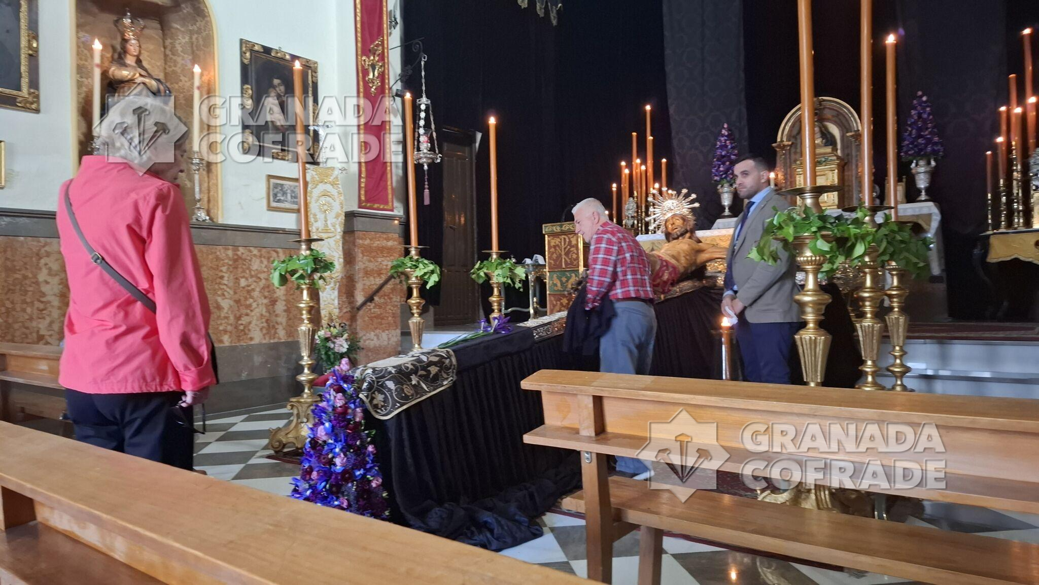 El Sagrado Protector de Granada recibió ayer cuantiosas visitas de hermanos y devotos que quisieron acompañarlo en estos últimos días de la cuaresma de 2025 ya próxima su subida al paso procesional para presidir la estación penitencial del Lunes Santo. La venerada imagen del Crucificado de Jacobo Torni se presenta a los pies del presbiterio, vistiendo sudario bocado en sedas con un centro de lirios a los pies y seis blandones dorados custodiándolo, en una estampa típica de cada Jueves de Pasión.