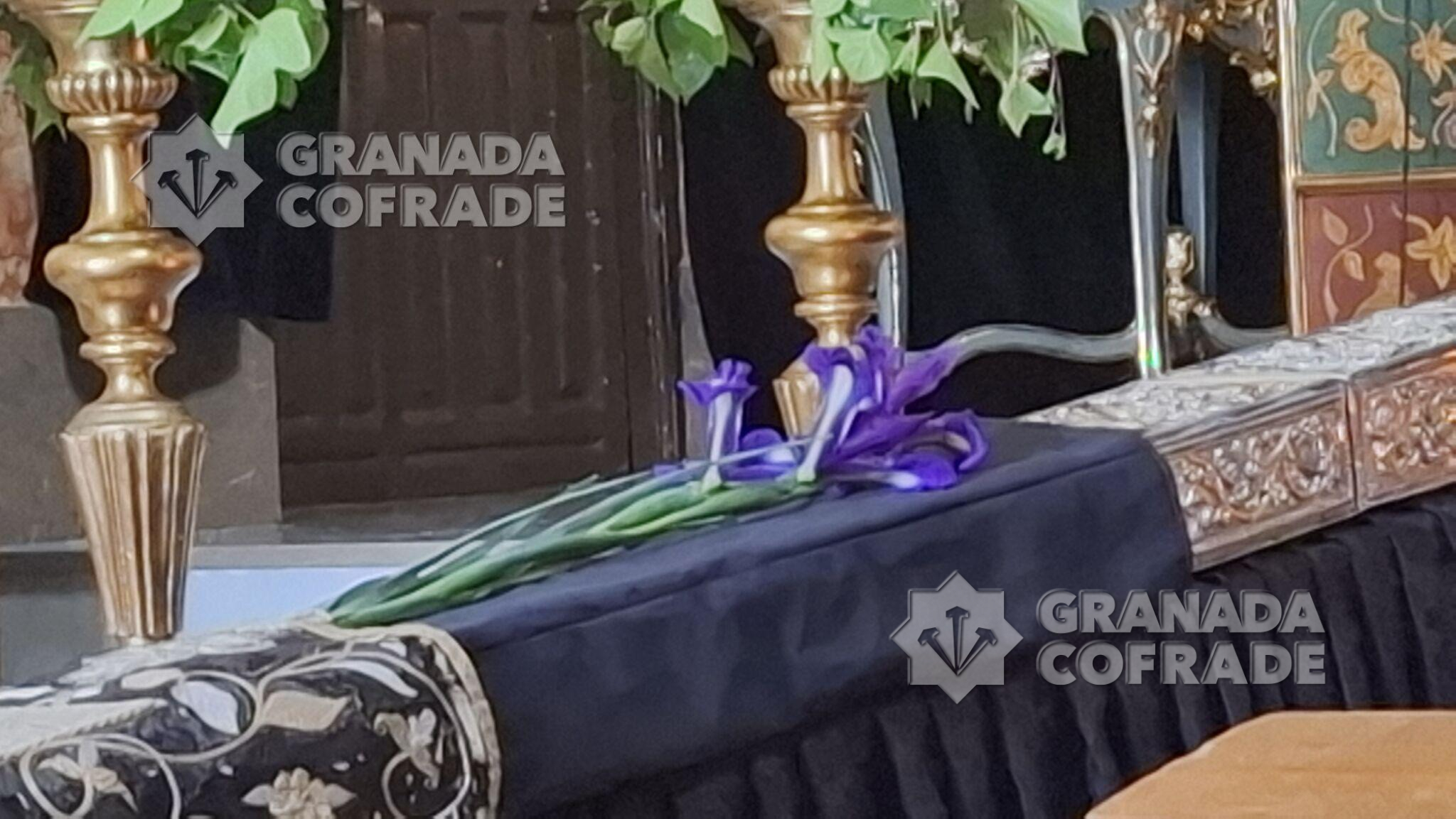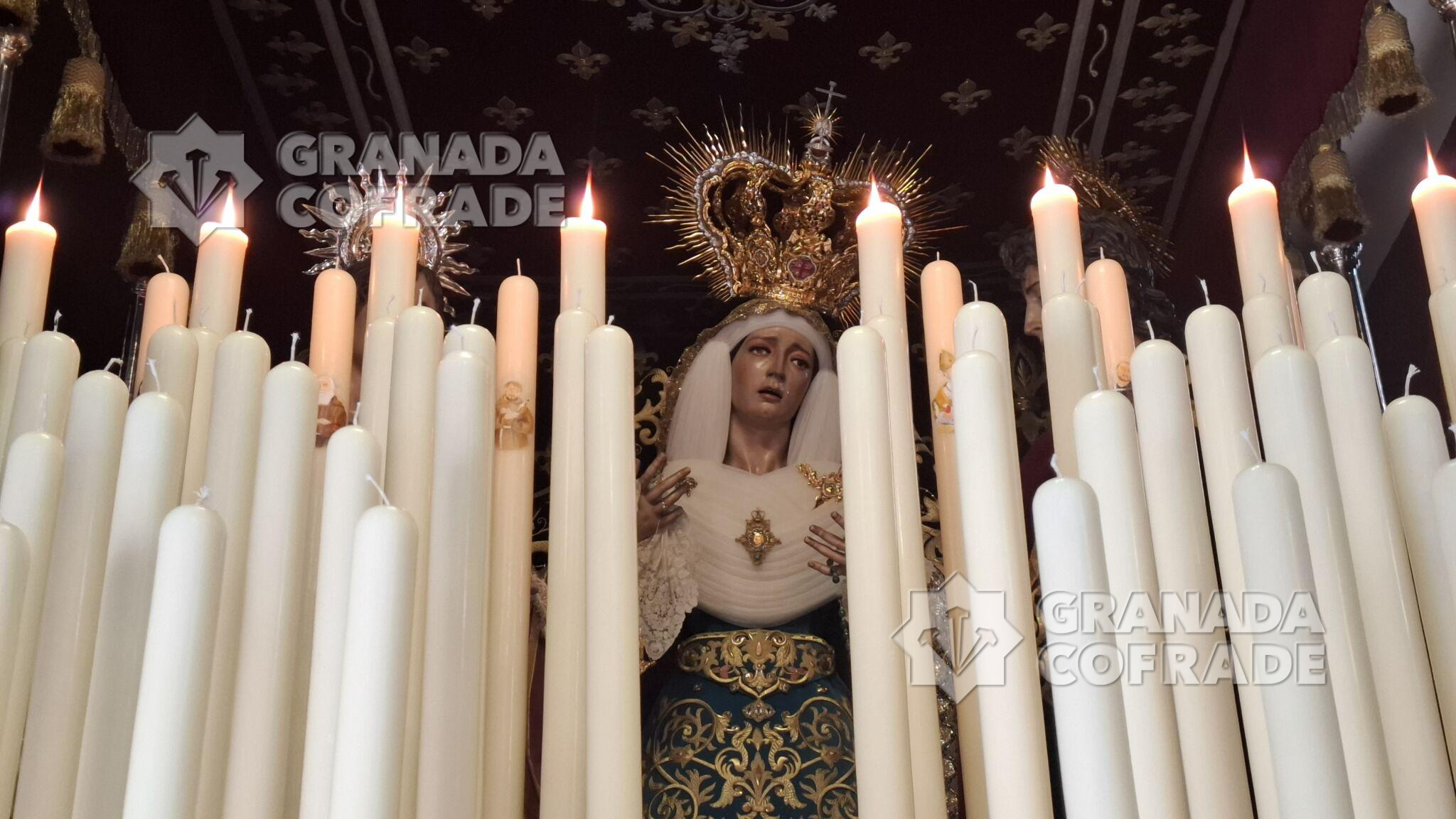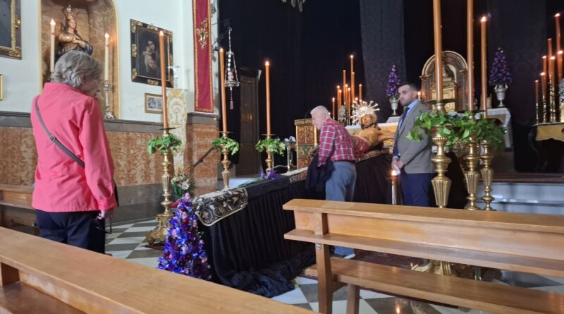 El Sagrado Protector de Granada recibió ayer cuantiosas visitas de hermanos y devotos que quisieron acompañarlo en estos últimos días de la cuaresma de 2025 ya próxima su subida al paso procesional para presidir la estación penitencial del Lunes Santo. La venerada imagen del Crucificado de Jacobo Torni se presenta a los pies del presbiterio, vistiendo sudario bocado en sedas con un centro de lirios a los pies y seis blandones dorados custodiándolo, en una estampa típica de cada Jueves de Pasión.