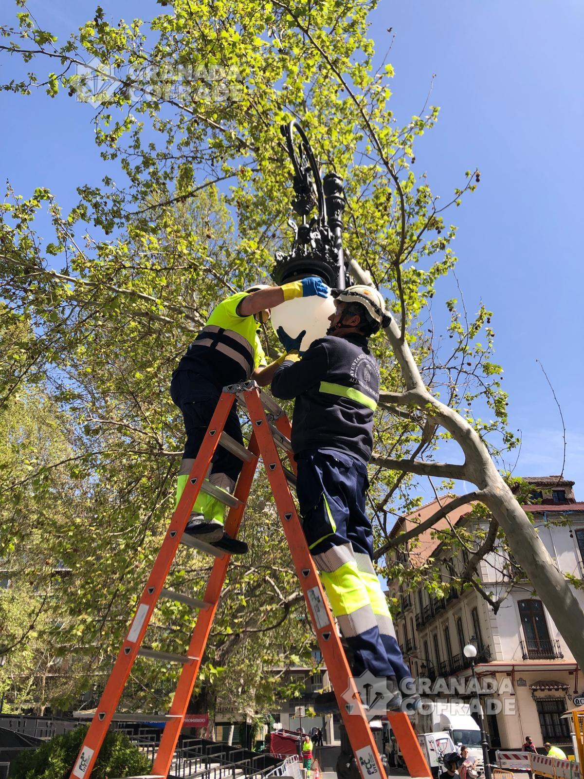 Ya está el alumbrado público de plaza de las Pasiegas y entorno de la Catedral programado para que encienda al cien por cien de su iluminación de cara a la próxima Semana Santa. Desde el Área de Mantenimiento y Participación Ciudadana que coordina el edil Francis Almohalla, se ha dispuesto todo lo necesario para proceder a la reposición de luminarias que fortalezcan la imagen de las hermandades en este entorno del casco histórico de la ciudad. De la misma manera se ha procedido a la limpieza de las farolas artísticas de la calle Ganivet, situadas en los soportales de esta calle granadina que tanto gusta a los vecinos, viandantes y visitantes.