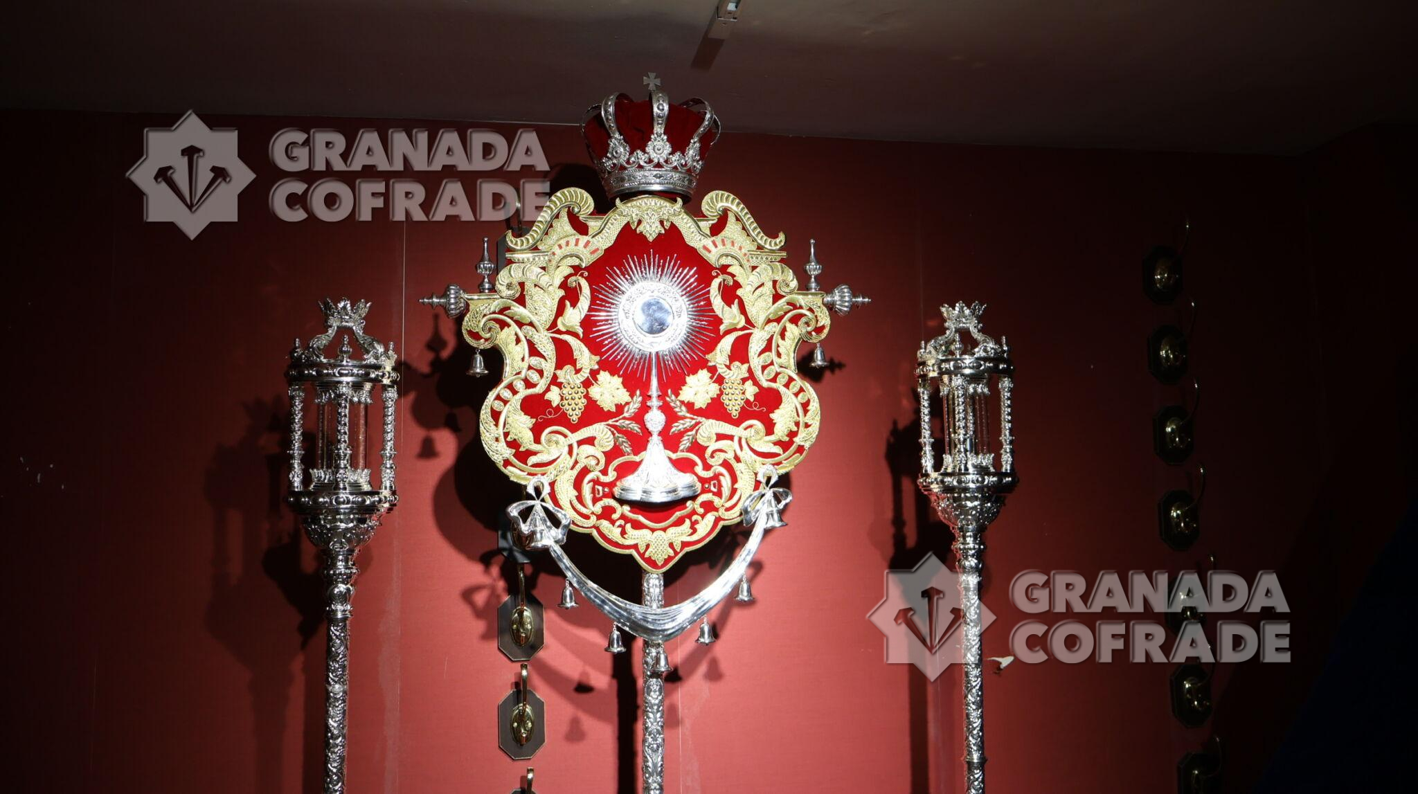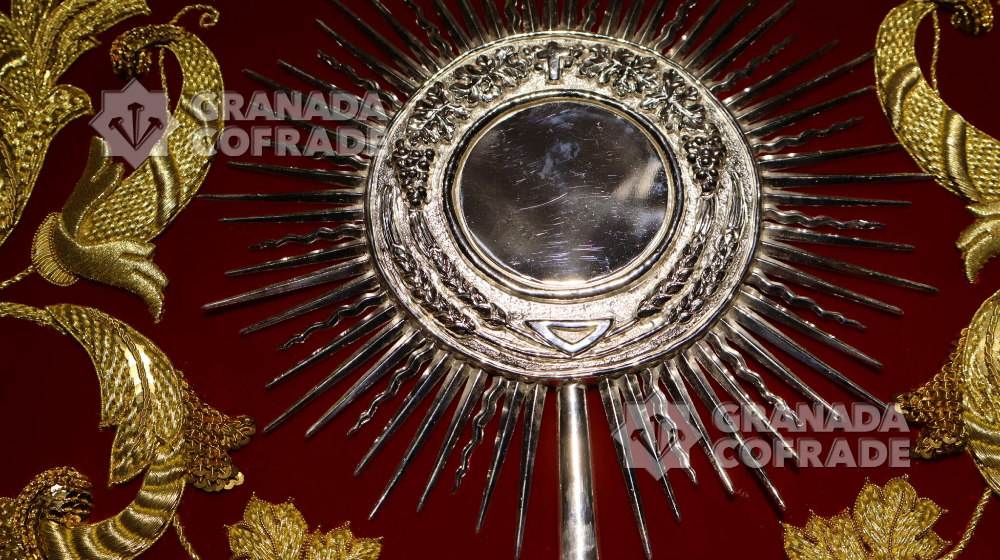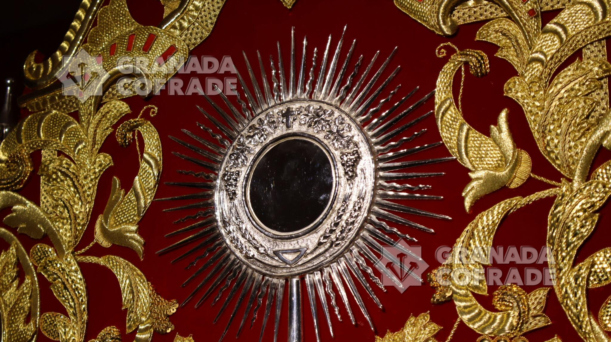 El guion incorpora elementos simbólicos del carácter sacramental, como racimos de uvas y espigas, así como una cuidada presencia de la orfebrería representada en guirnaldas, campanillas, pináculos y una corona de realeza que cobija la custodia. Todo ello en sintonía con el cromatismo y estilo del futuro paso de palio. Los faroles de acompañamiento fueron diseñados por el orfebre sevillano Emilio Méndez. Destacan por su estilo barroco con columnas salomónicas remarcadas con hojarasca, con detalles ornamentales y arquitectónicos con un punto central de luz para cera.