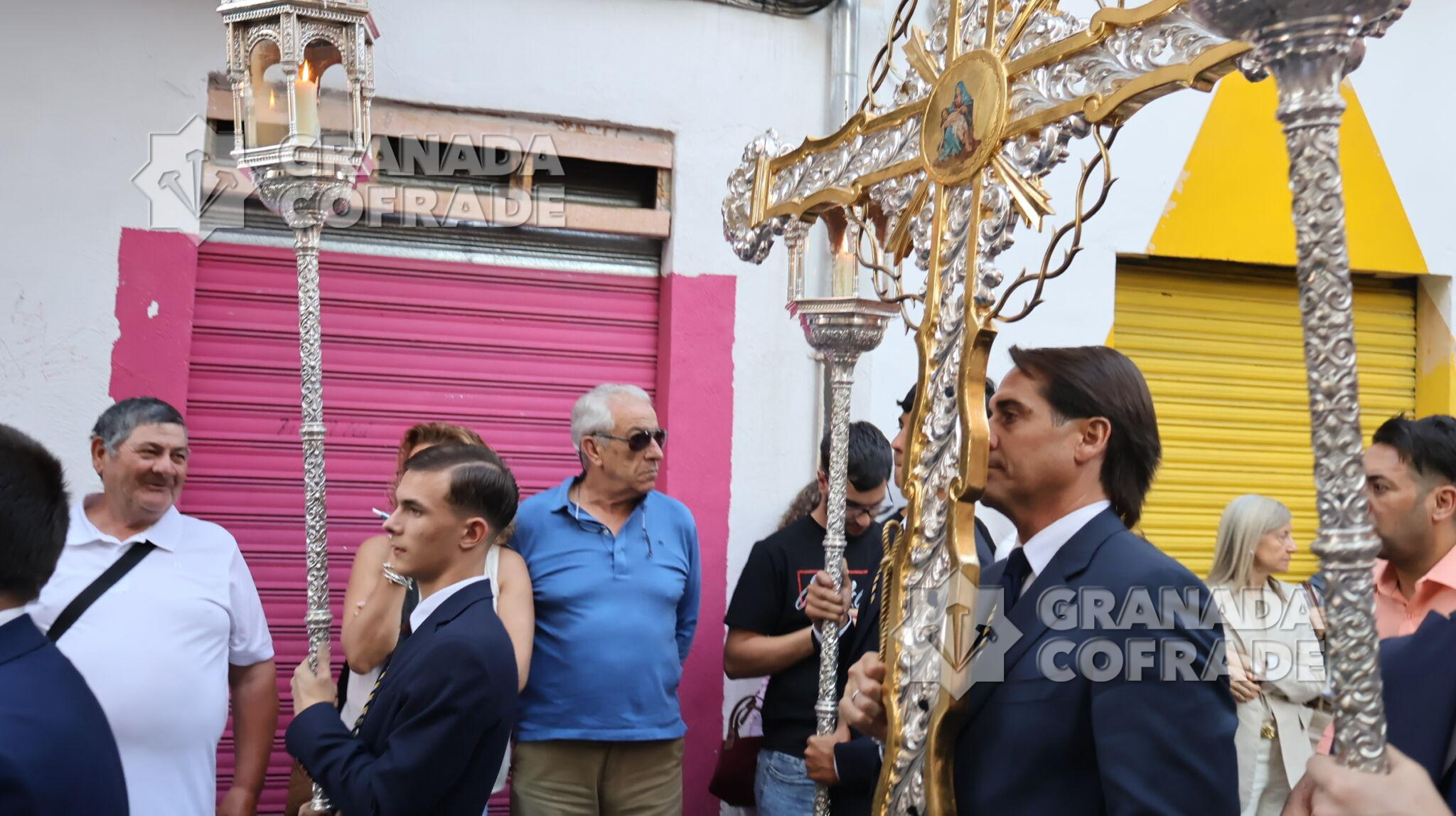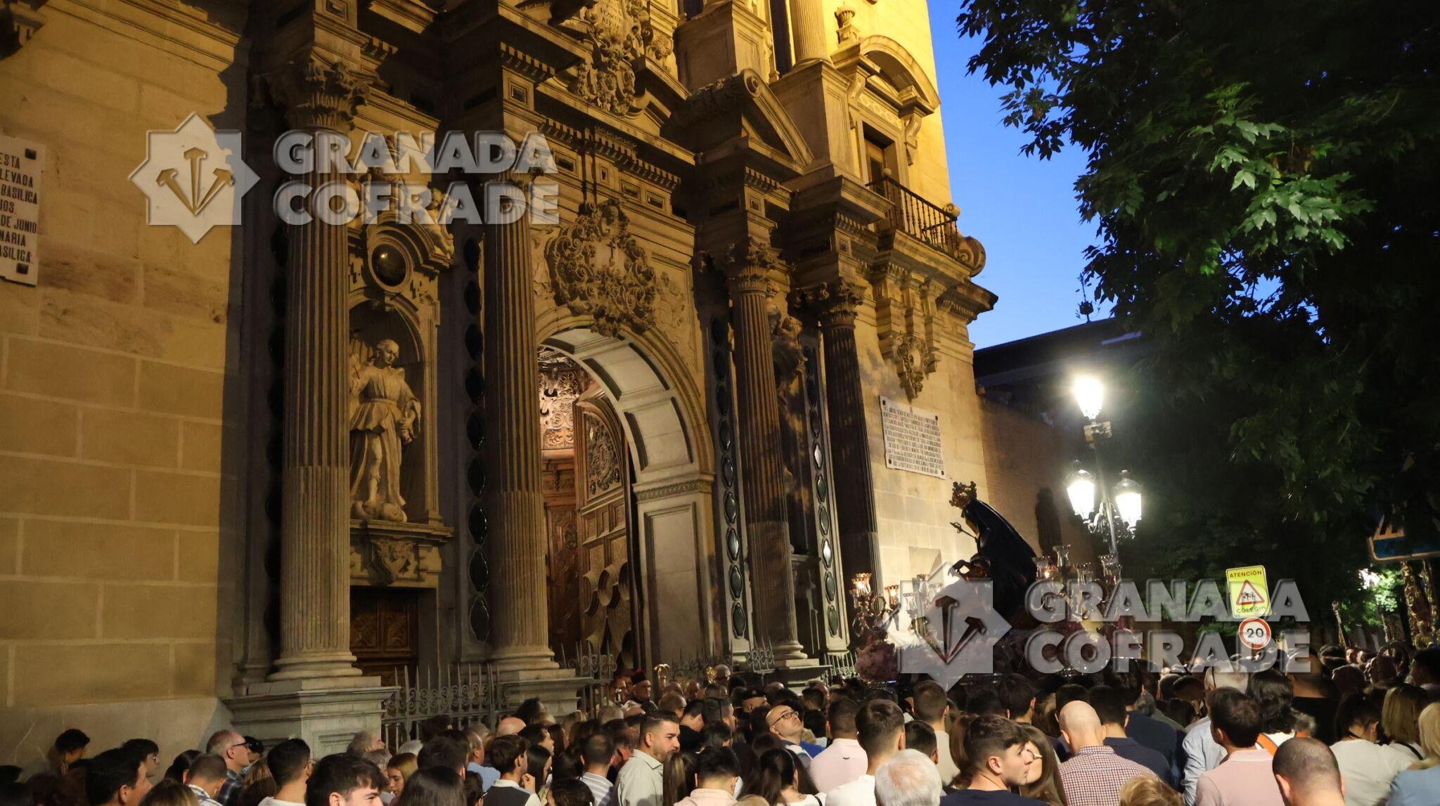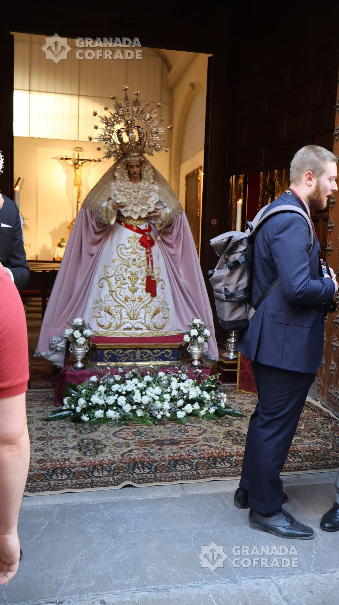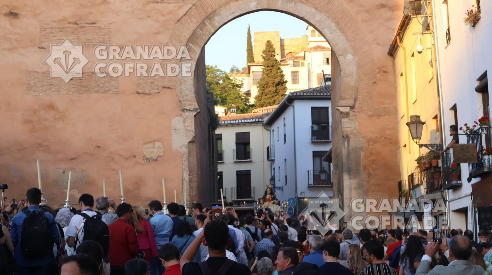 Cercanas las diez de la noche se adentró la imagen de Santa María de la Alhambra en la basílica de San Juan de Dios, después de su salida a las cinco menos diez de la tarde desde su sede de la parroquia de la Encarnación, de la Alhambra. Un itinerario singular y único por el que discurrió el cortejo integrado por más de cuarenta parejas de hermanos y con la participación también de hermanos y hermanas que formaron parte de la junta de gobierno de hace veinticinco años. Cruz de Guía, estandarte de la ciudad, guion de coronación y Simpecado formaron parte de esta comitiva como insignias significativas en este traslado hasta la basílica de San Juan de Dios, donde a partir de hoy miércoles se celebra el triduo conmemorativo de la coronación canónica de la Santísima Virgen, ocurrida el 21 de mayo del año 2000.