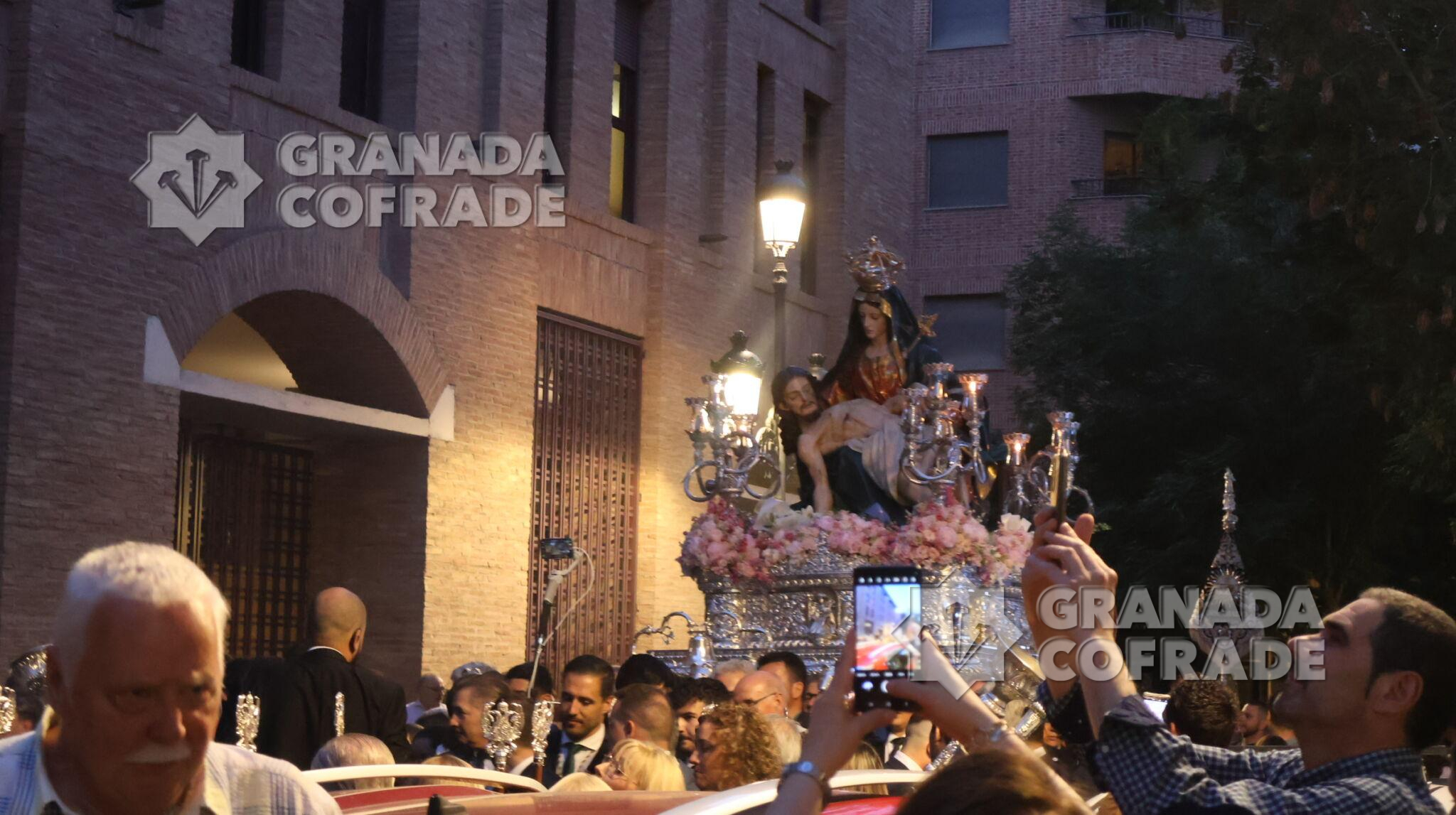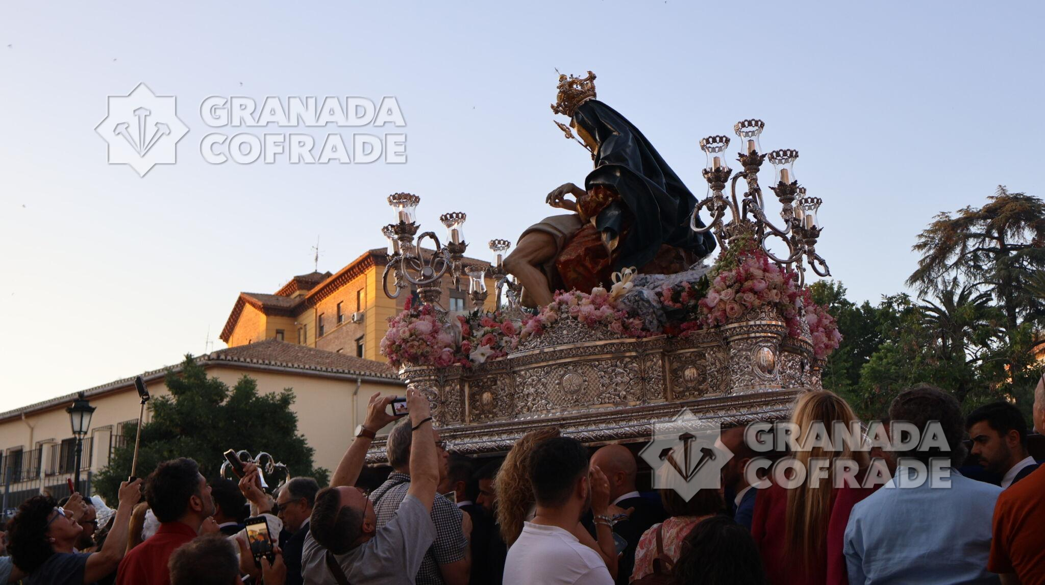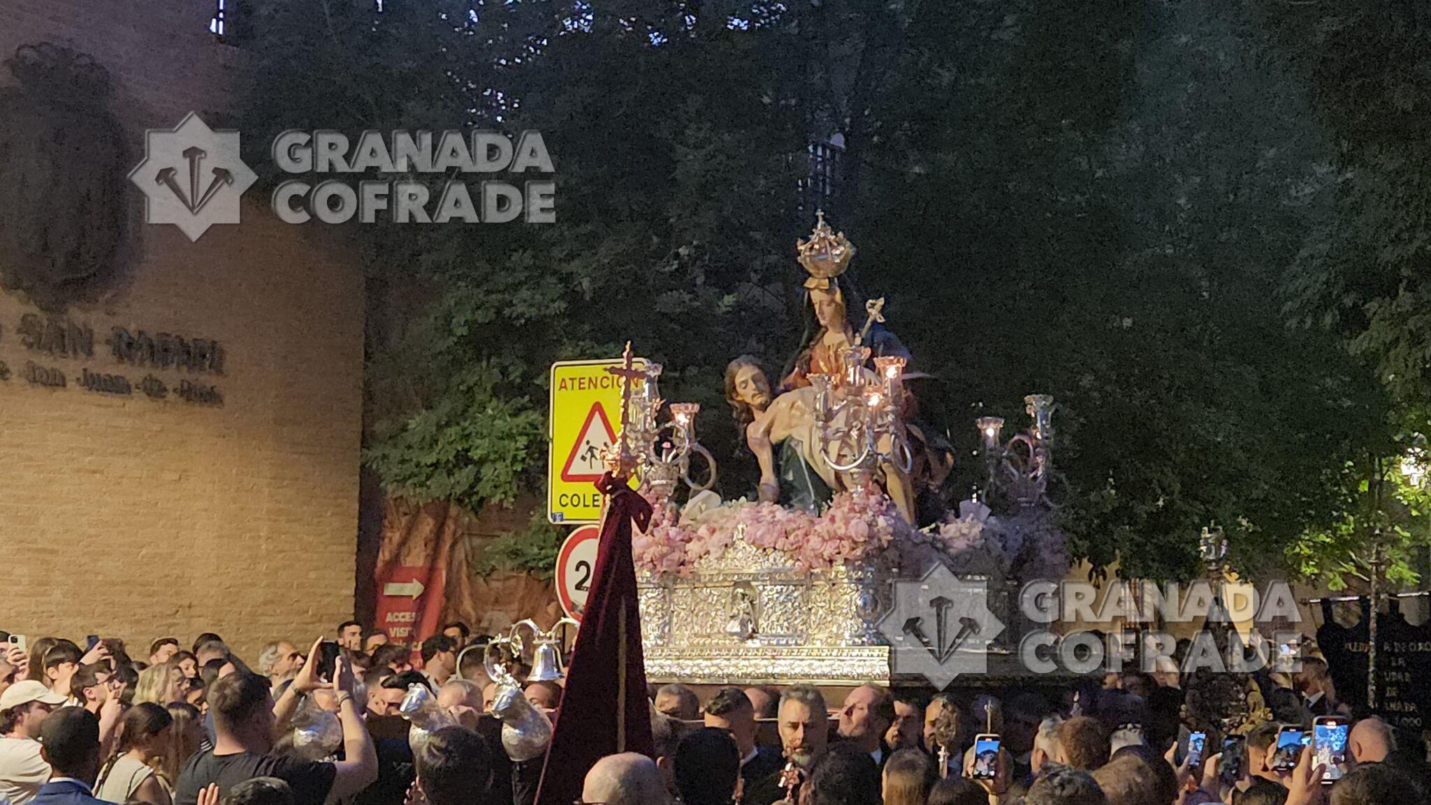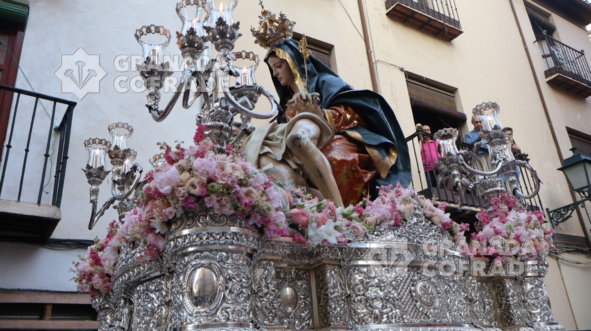 Comenzó el traslado a las cuatro y media de la tarde. Se reencontraba con su ciudad Santa María de las Angustias de la Alhambra, para iniciar su descenso hasta la Basílica de San Juan de Dios, con motivo del XXV Aniversario de la Coronación Canónica de esta titular mariana. La imagen se situaba sobre las andas procesionales de la Divina Pastora del municipio de Gójar, que había sido cedido para la ocasión, que se encontraba exornado con un conjunto floral en tonos rosados pastel, compuesto delphinium consolida, peonías, rosa inglesa, flor de arroz, fresia, escabiosa, rosa de ecuador y rosa holandesa.
