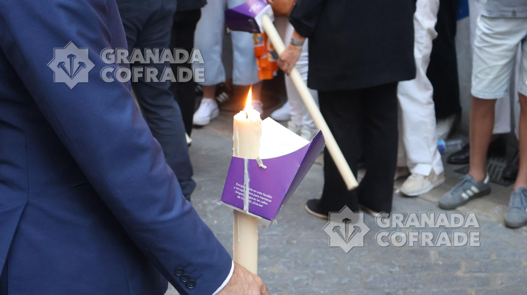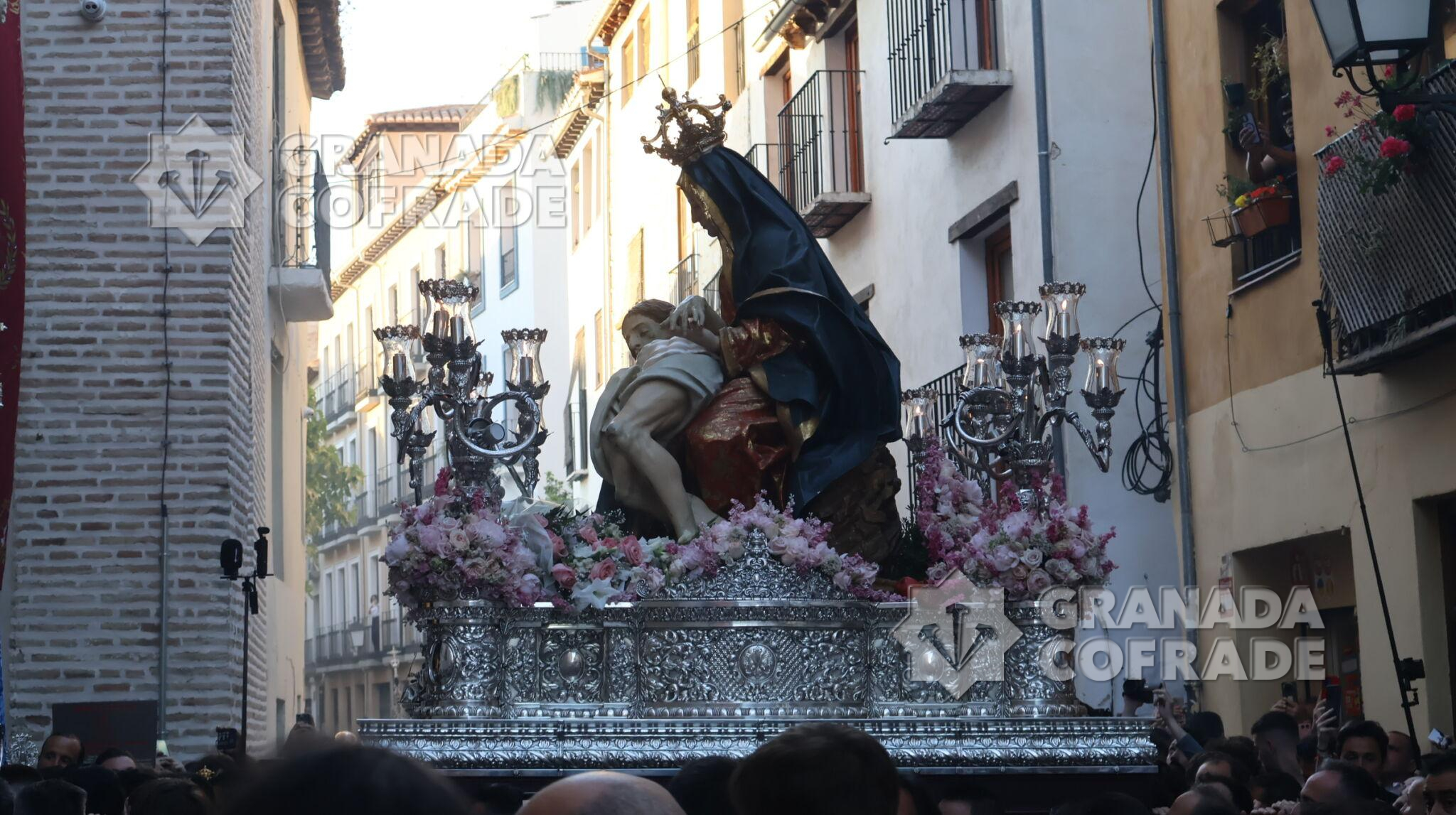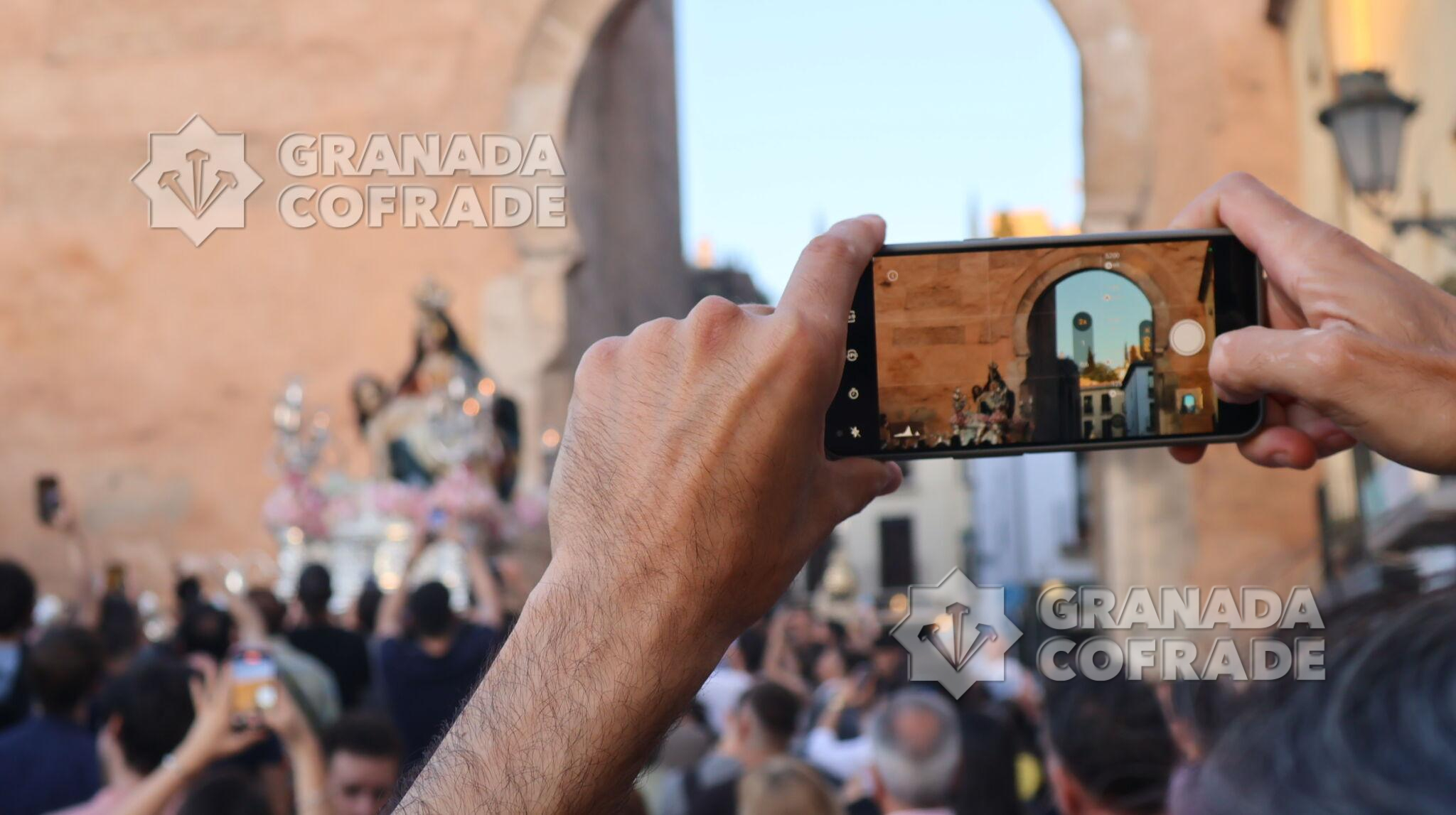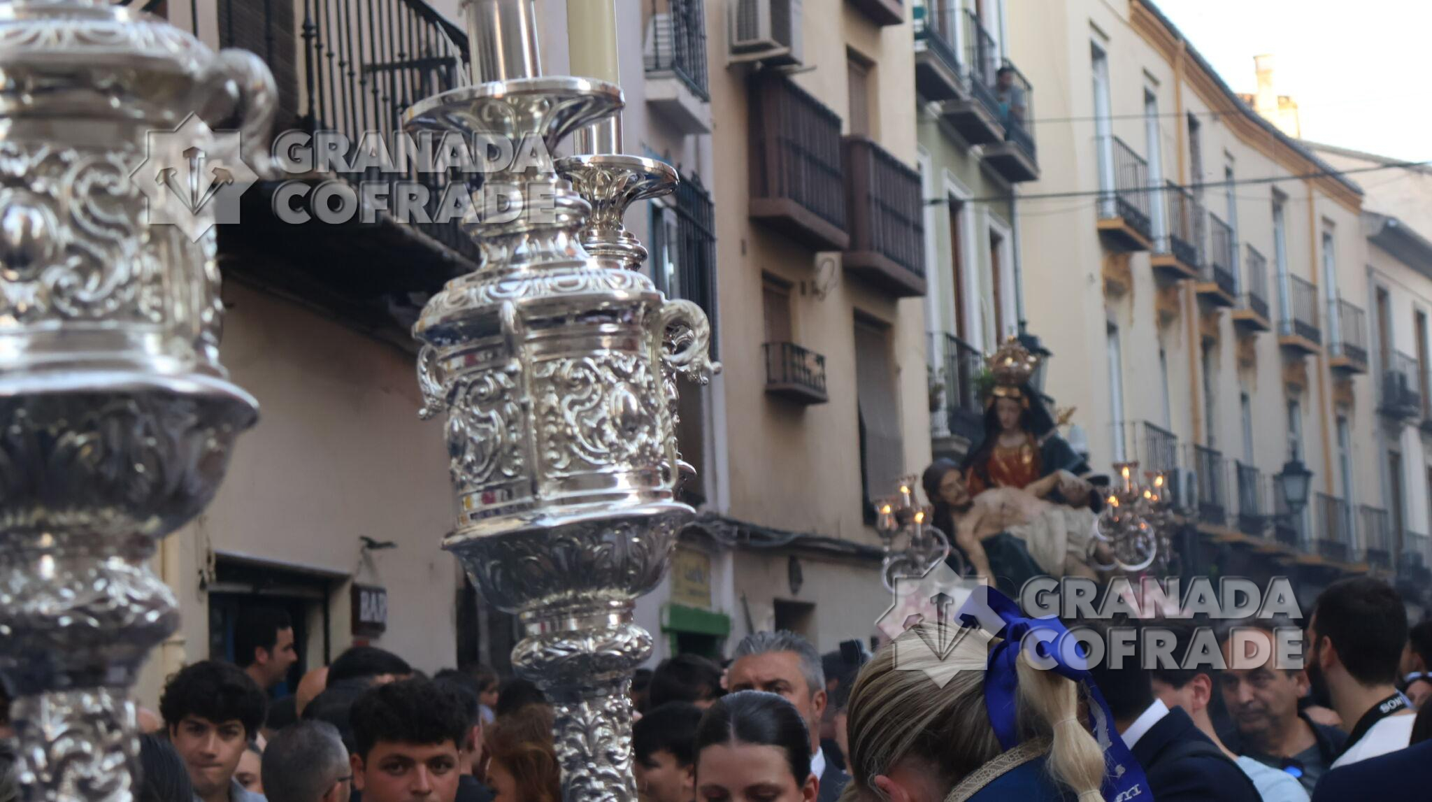 Comenzó el traslado a las cuatro y media de la tarde. Se reencontraba con su ciudad Santa María de las Angustias de la Alhambra, para iniciar su descenso hasta la Basílica de San Juan de Dios, con motivo del XXV Aniversario de la Coronación Canónica de esta titular mariana. La imagen se situaba sobre las andas procesionales de la Divina Pastora del municipio de Gójar, que había sido cedido para la ocasión, que se encontraba exornado con un conjunto floral en tonos rosados pastel, compuesto delphinium consolida, peonías, rosa inglesa, flor de arroz, fresia, escabiosa, rosa de ecuador y rosa holandesa.