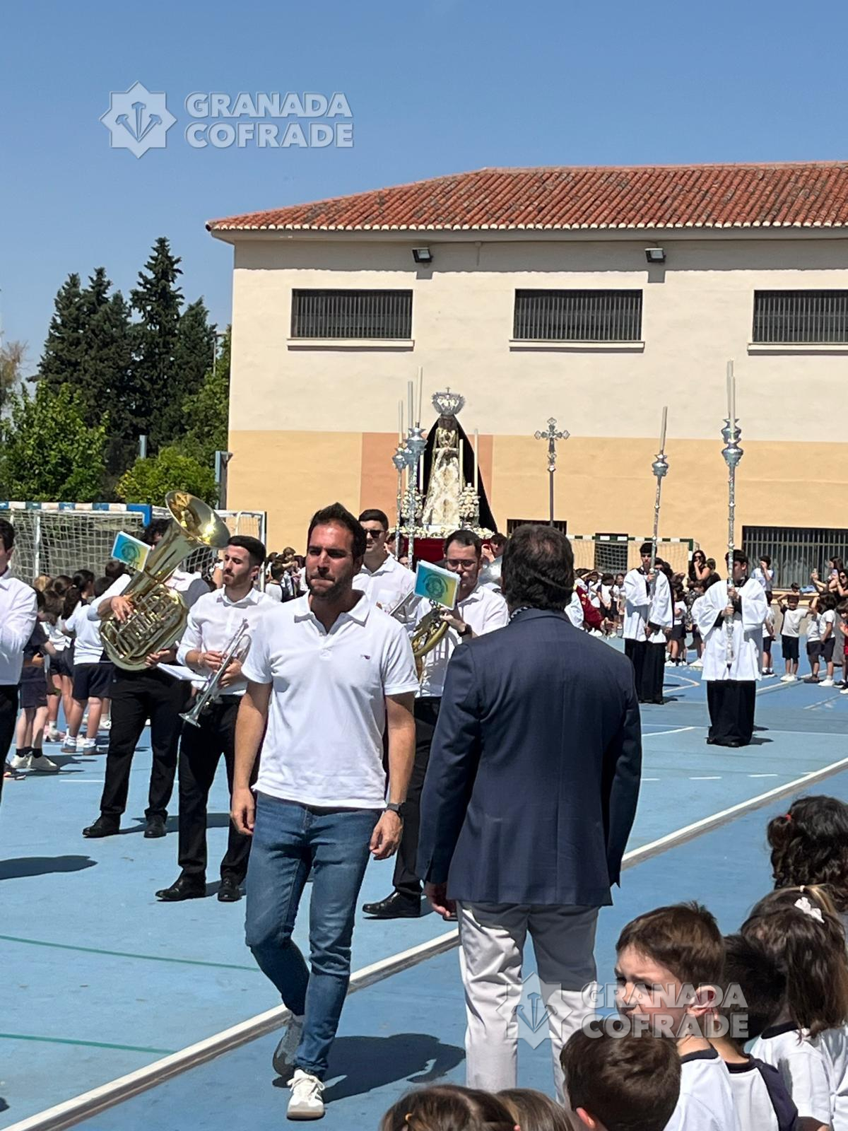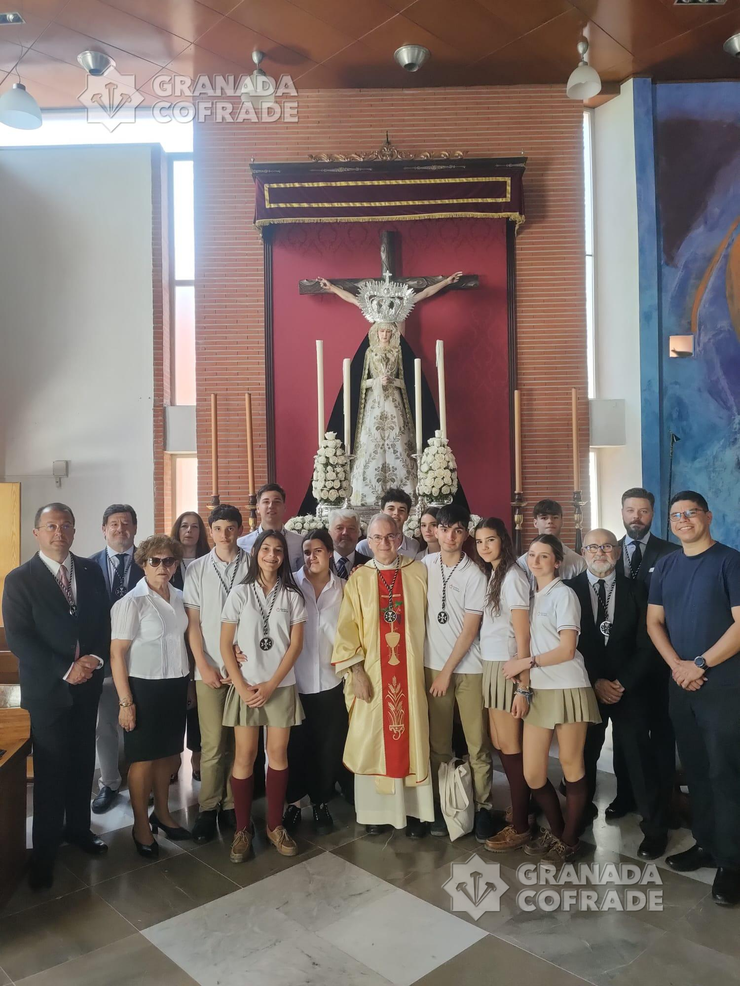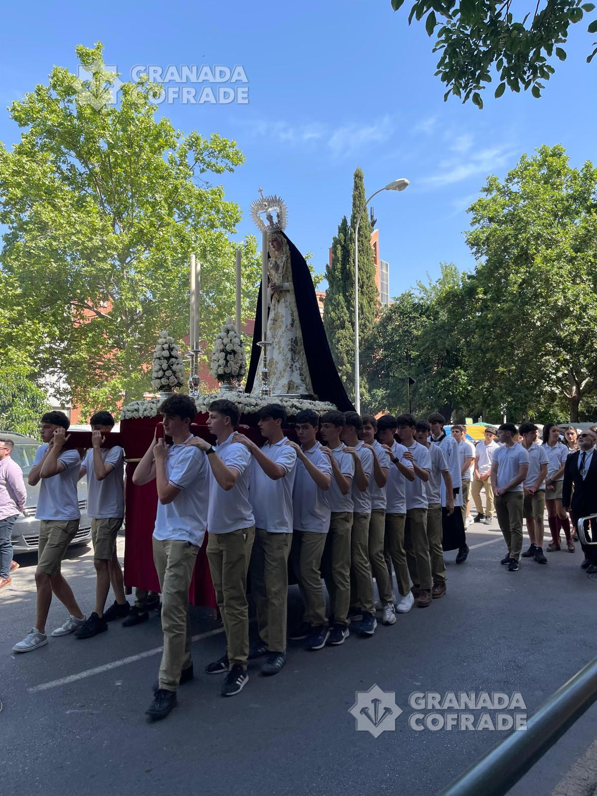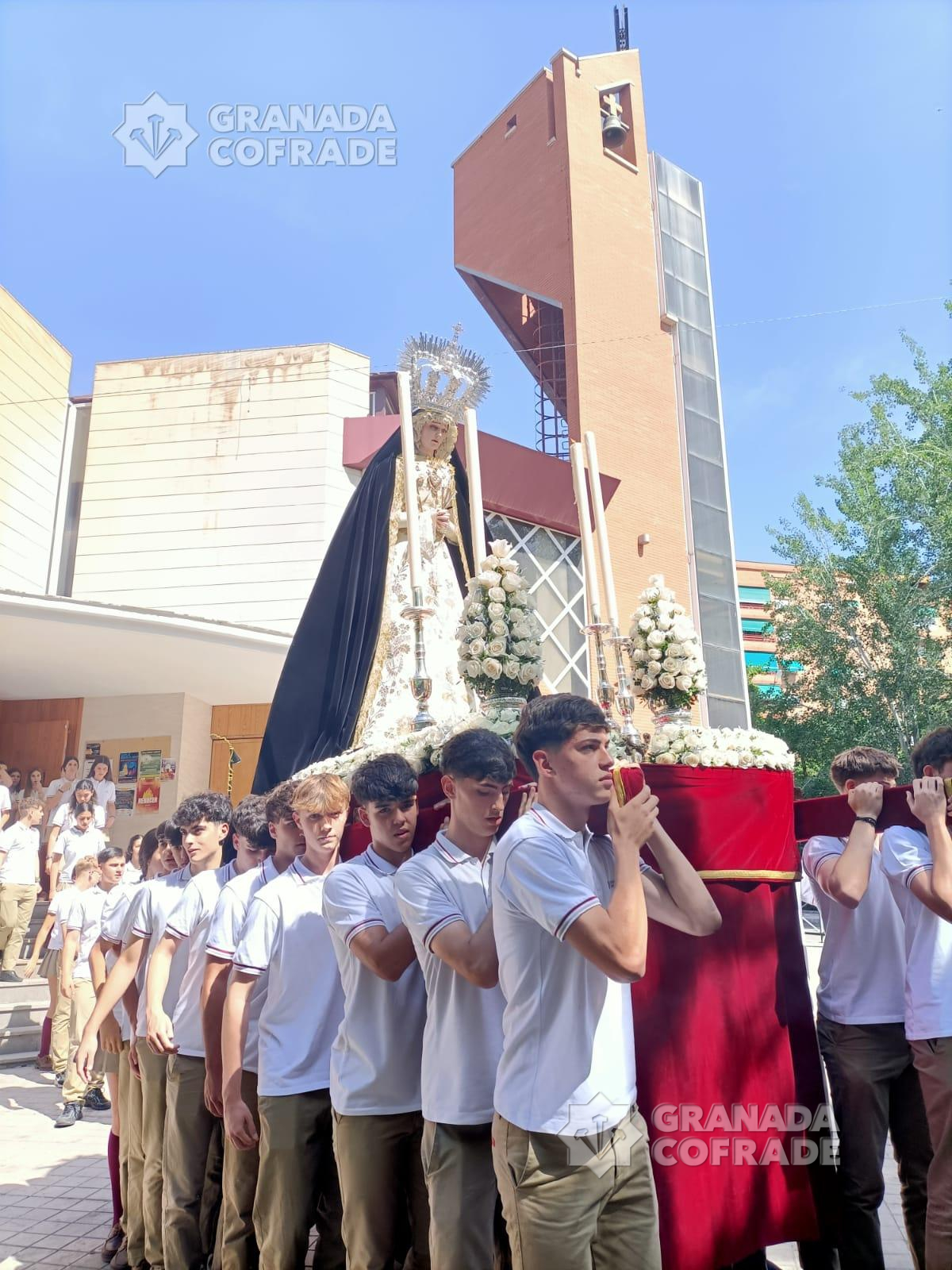 Profesores y alumnos participaron en la celebración y en el traslado de la Virgen desde la parroquia de Santo Tomás de Villanueva hasta el colegio donde en el pabellón de deportes se celebró la Eucaristía. Fue presidida por el párroco y director del colegio Angel Antonio García Cuadrado. En el traslado hasta el centro educativo acompañó a la Virgen el grupo GranaMusic al igual que en regreso que se desarrolló por un itinerario breve desde la calle Santo Tomás de Villanueva y por calle Recoletos hasta su sede parroquial.