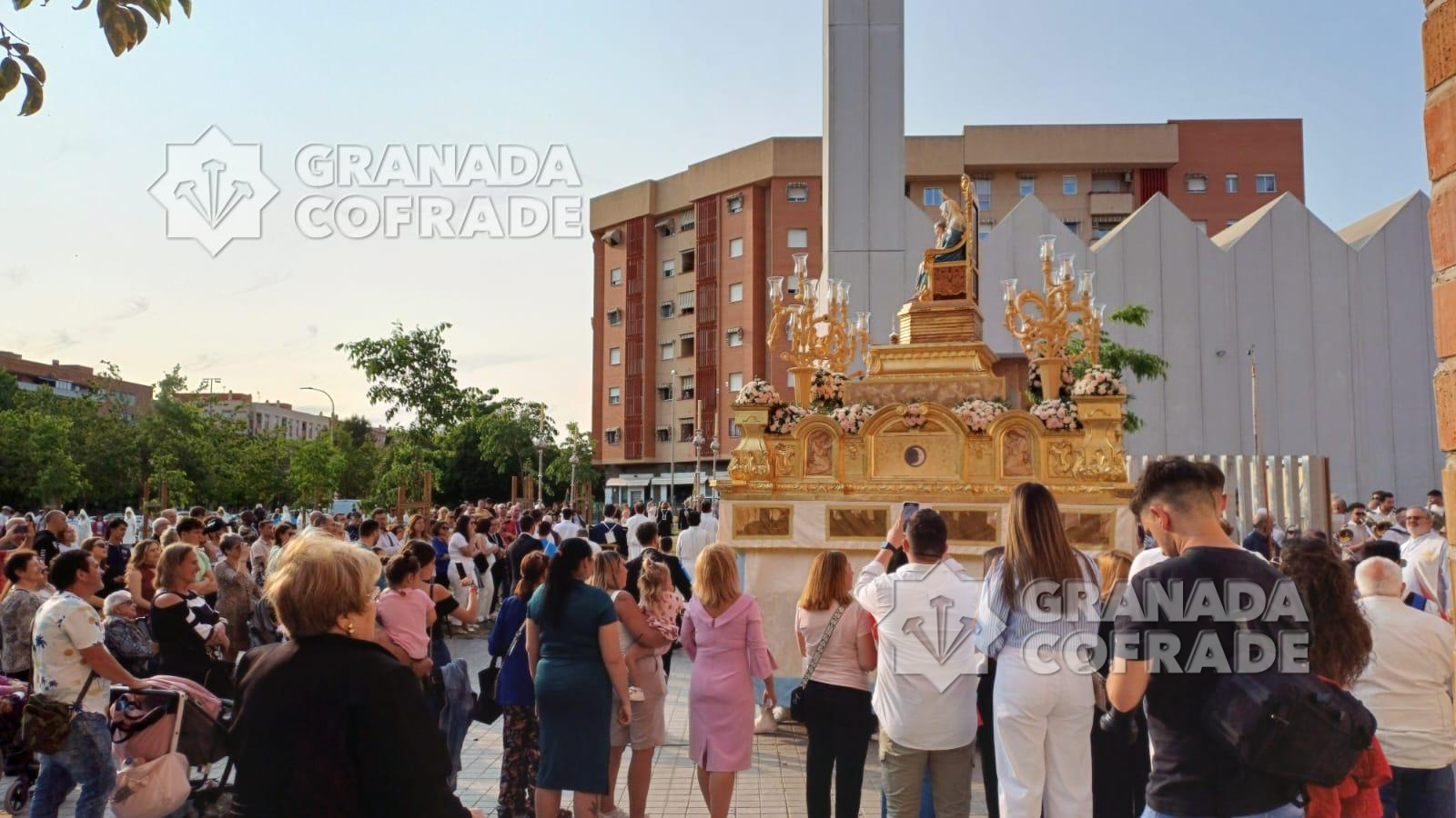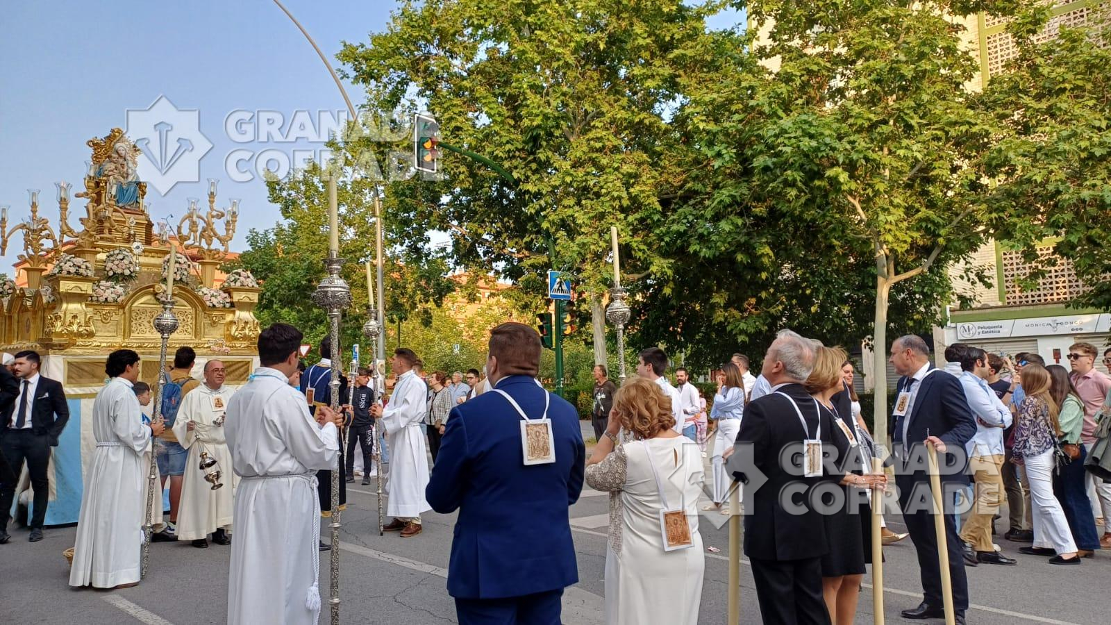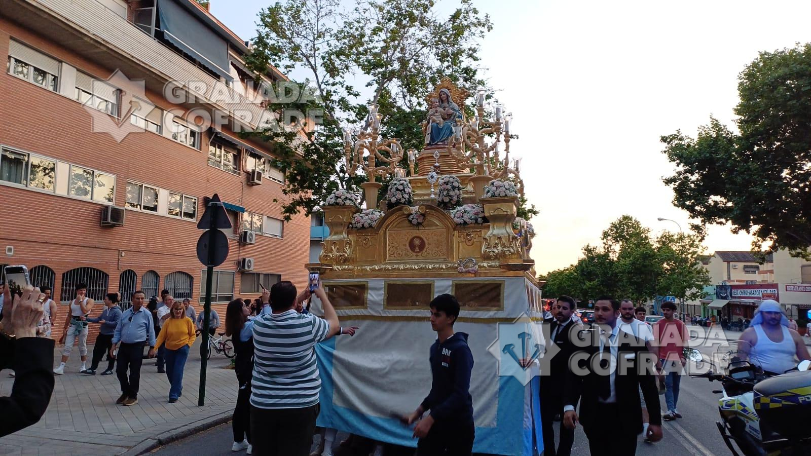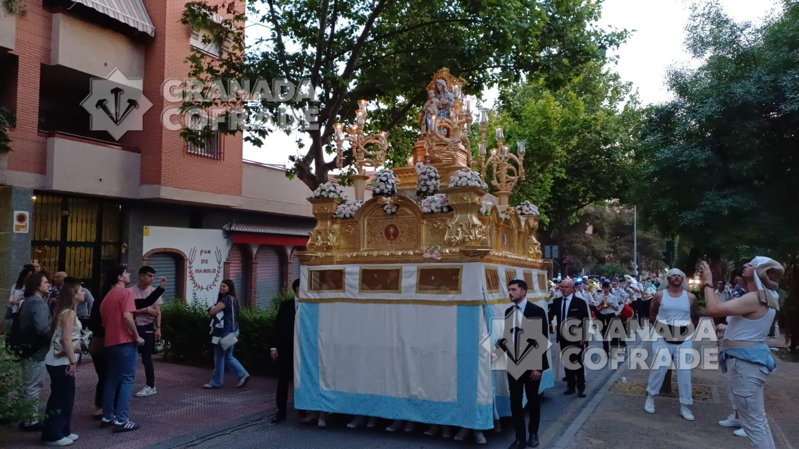 La imagen del Inmaculado Corazón de María que se venera en el Teologado Claretiano de Granada, presidió ayer tarde la procesión gloriosa que organiza su Archicofradía. En la última semana la imagen ha presidido el altar de cultos situado en el presbiterio del templo del Espíritu Santo, de la calle Joaquina Eguaras, del barrio de Almanjáyar y ayer realizó su salida procesional. Primero fue la celebración de la Eucaristía presidida por el párroco Juan Jesús Gea, quien después acompañó al cortejo que marchó por las calles Arzobispo Pedro de Castro para continuar en dirección a Iznájar y calle Izmail. El cortejo estuvo formado por varias filas de hermanos y feligreses y la participación de la banda de música Los Ángeles, de nuestra capital, dirigida por Manuel Elvira.