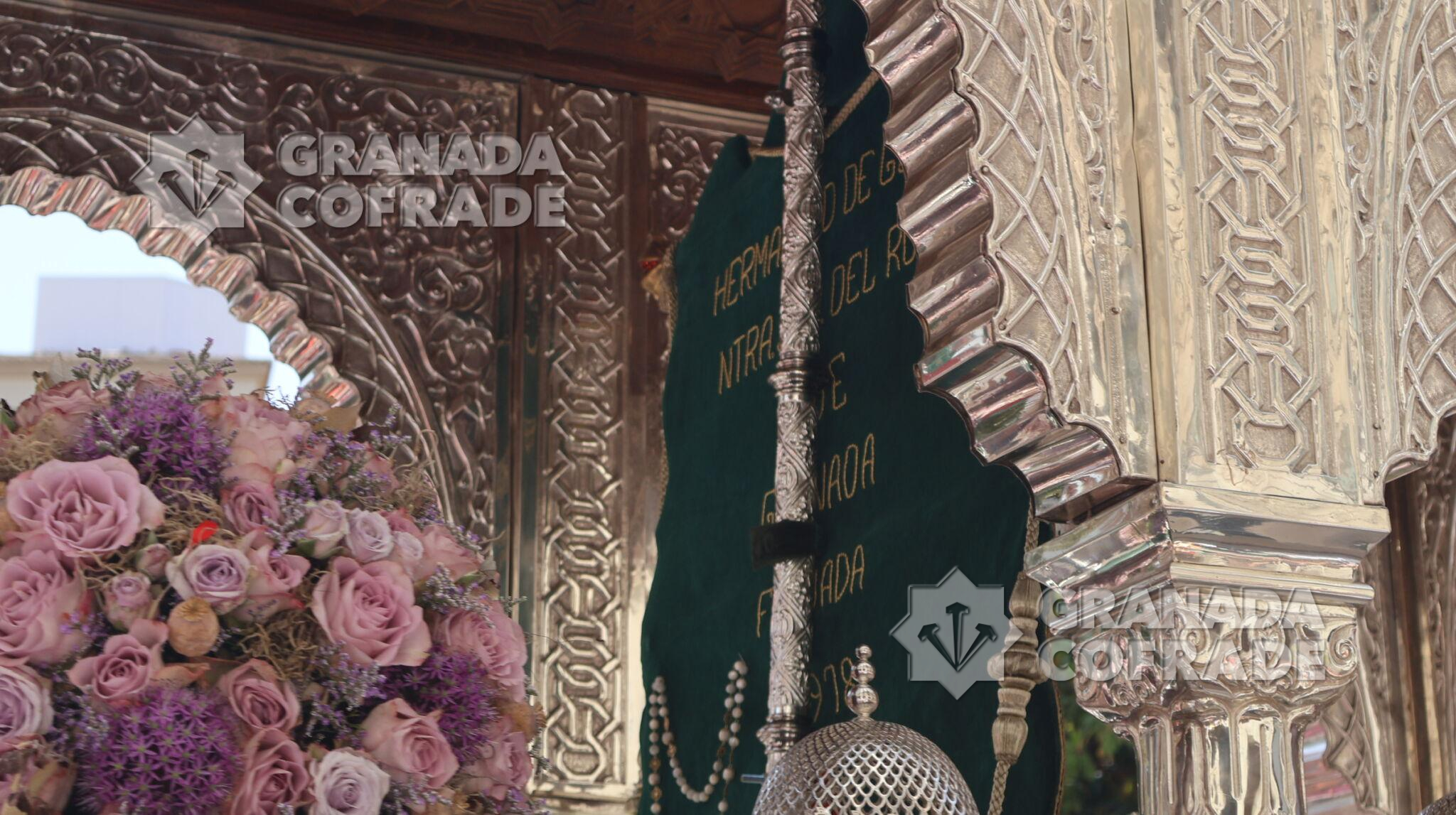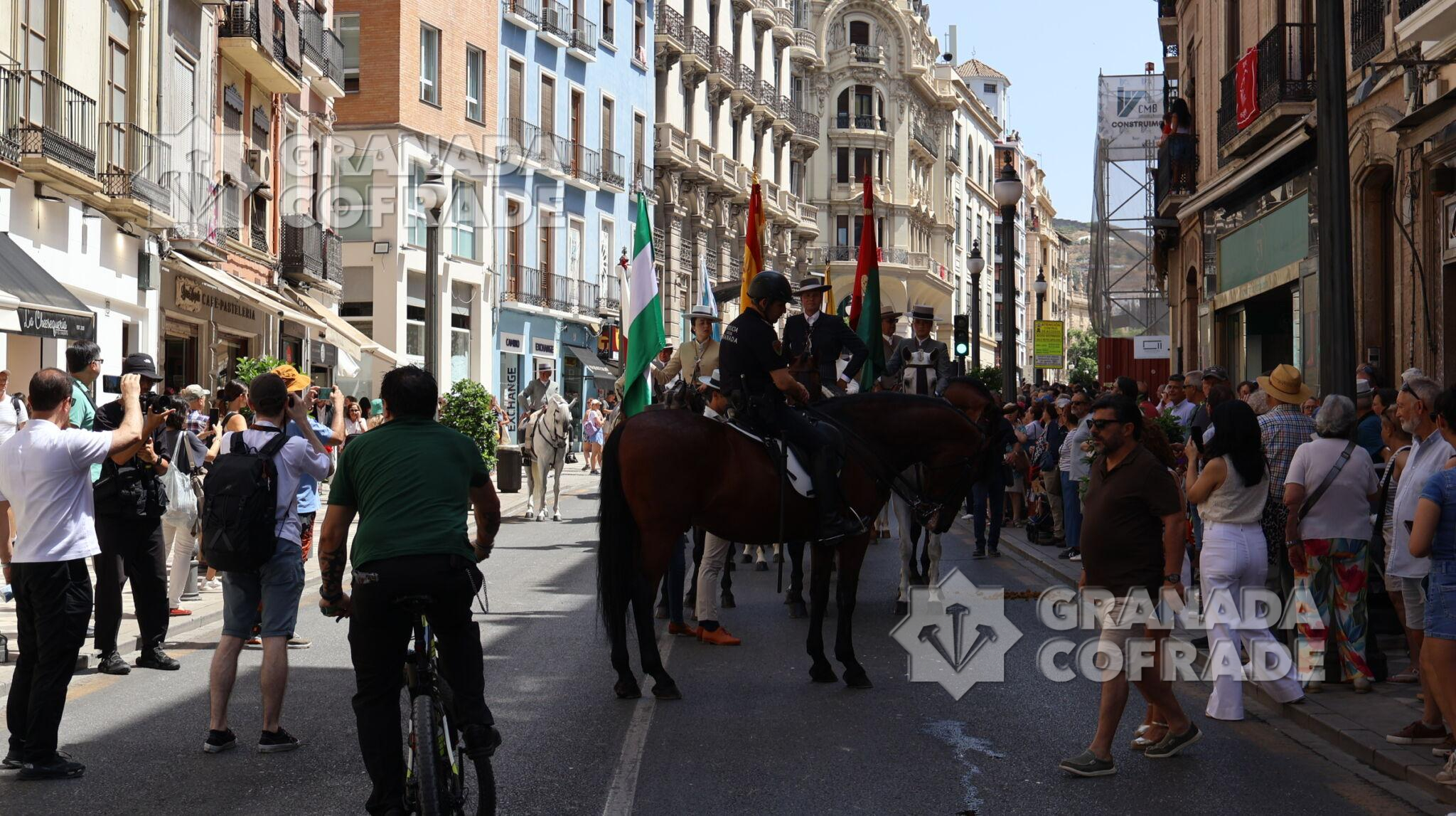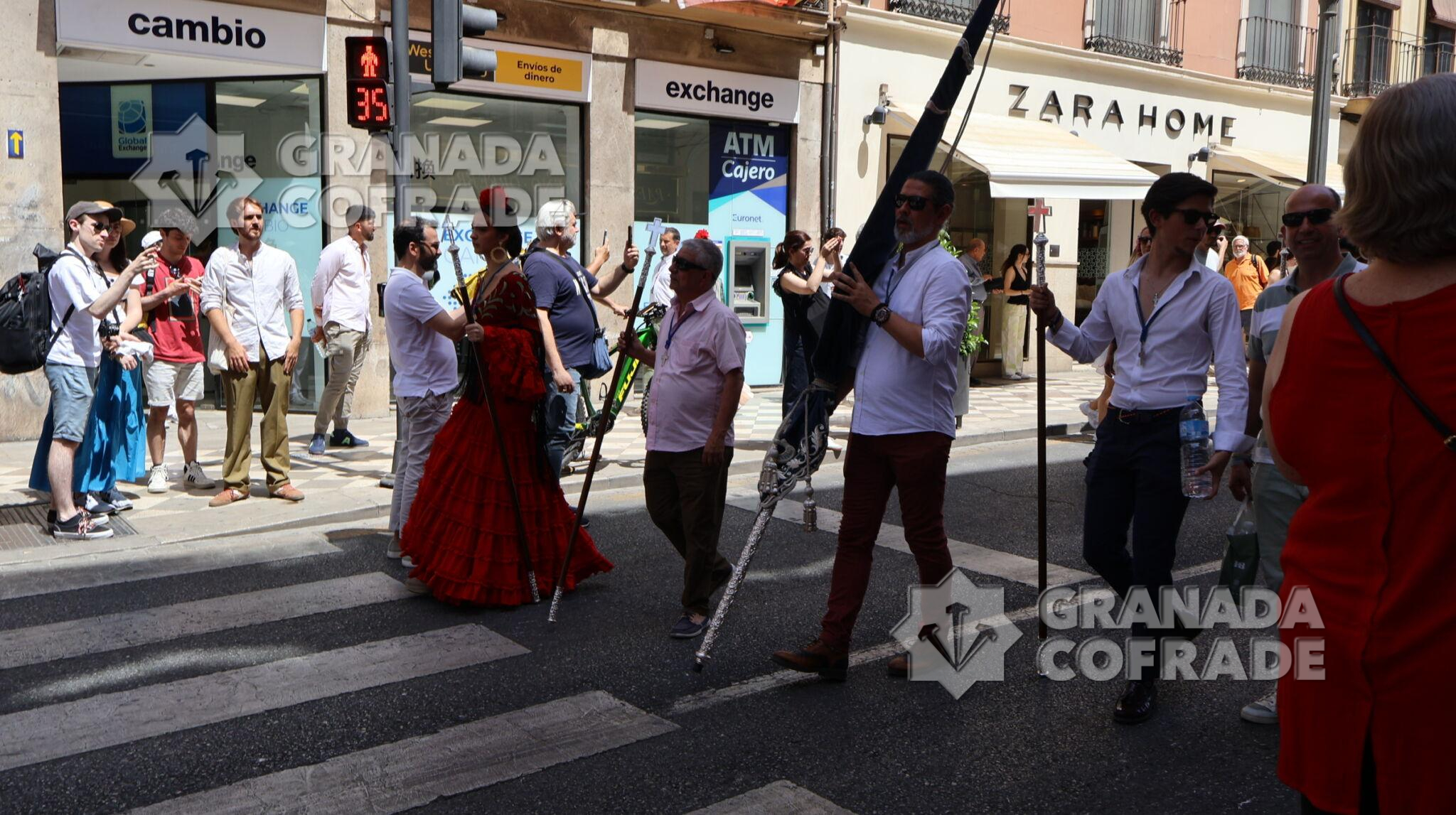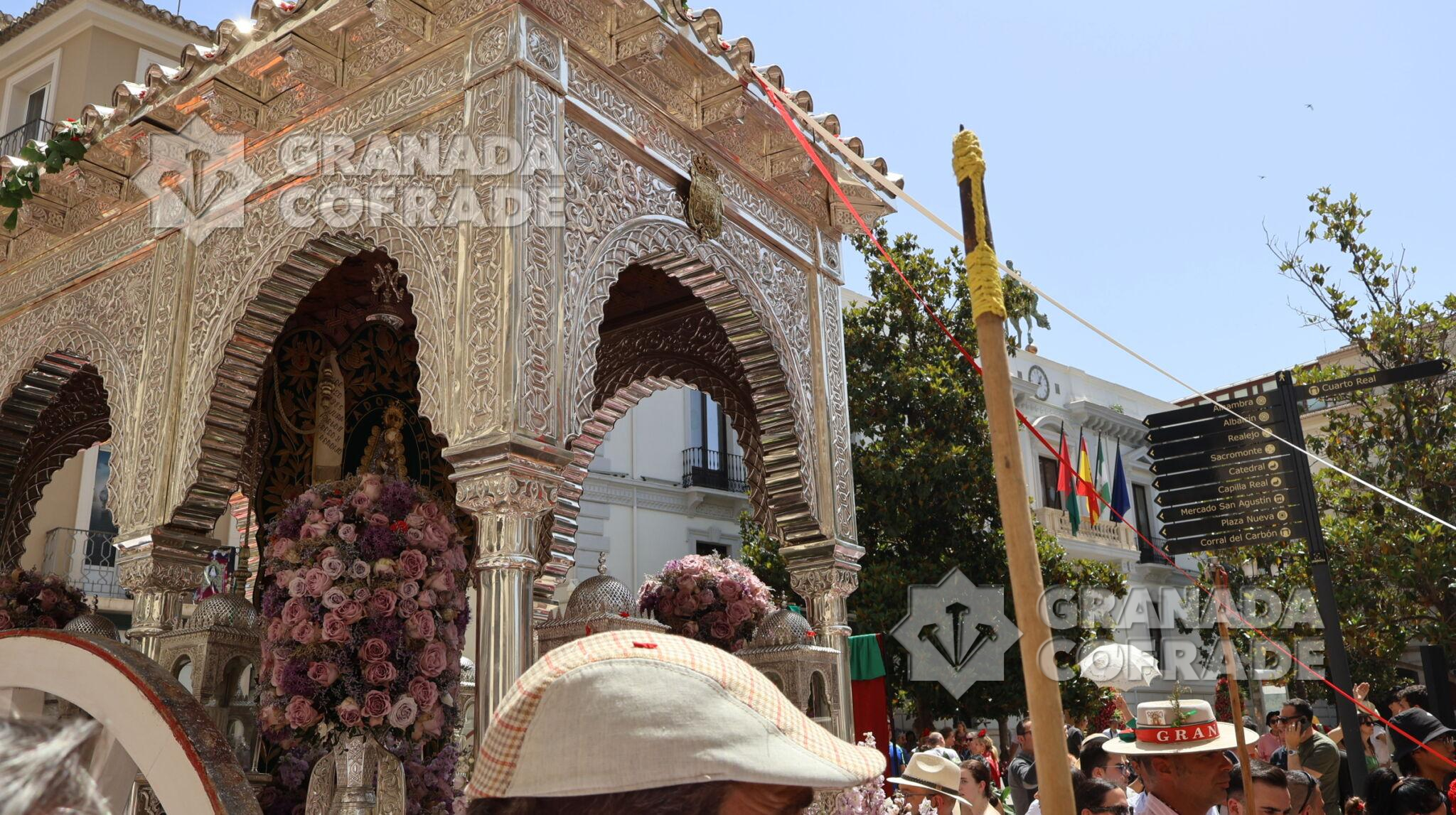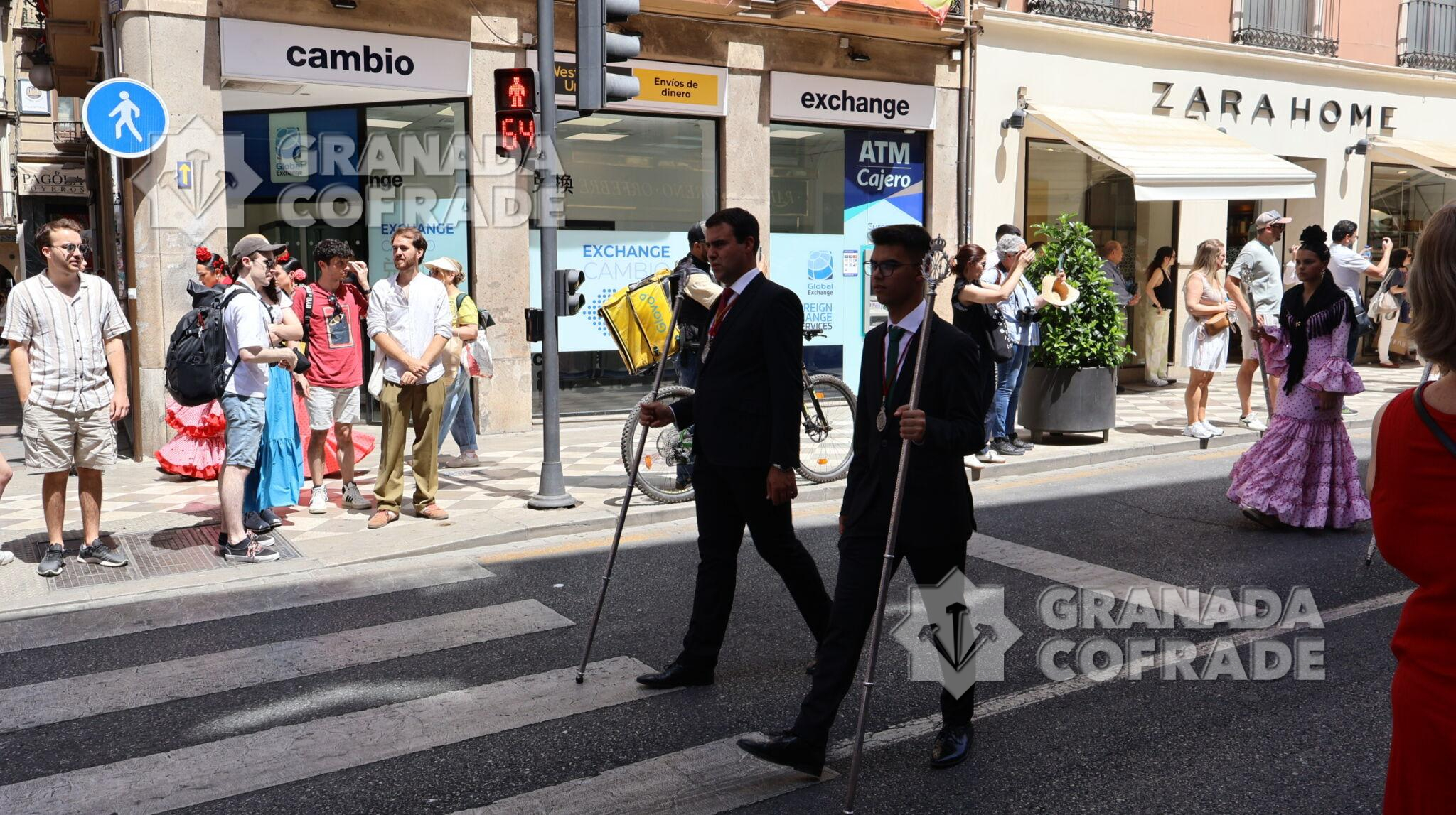 Mañana de vistosidad y colorido acompañando al Simpecado granadino que bordaron las Monjas de la Piedad, con sus veinticinco granadas y que fue acompañado por las principales autoridades granadinas. Estaba la Consejera de Fomento de la Junta de Andalucía, Rocío Díaz, y la alcaldesa de Granada, Marifrán Carazo. Estaban delegados de distintas áreas de Consejerías andaluzas y el Delegado de la Junta de Andalucía en Granada, Antonio Granados, junto al hermano mayor, Alfredo Alcalde.