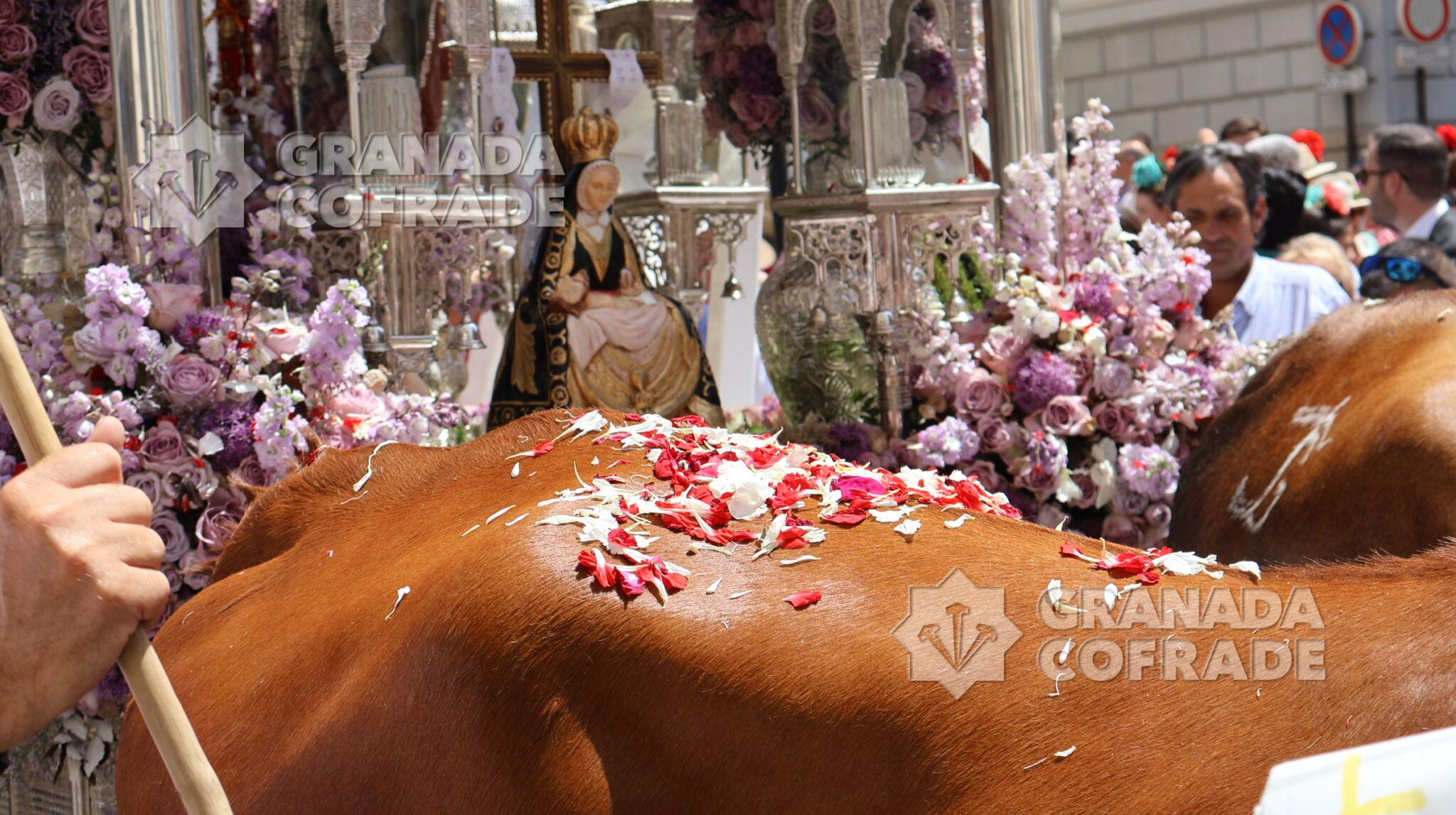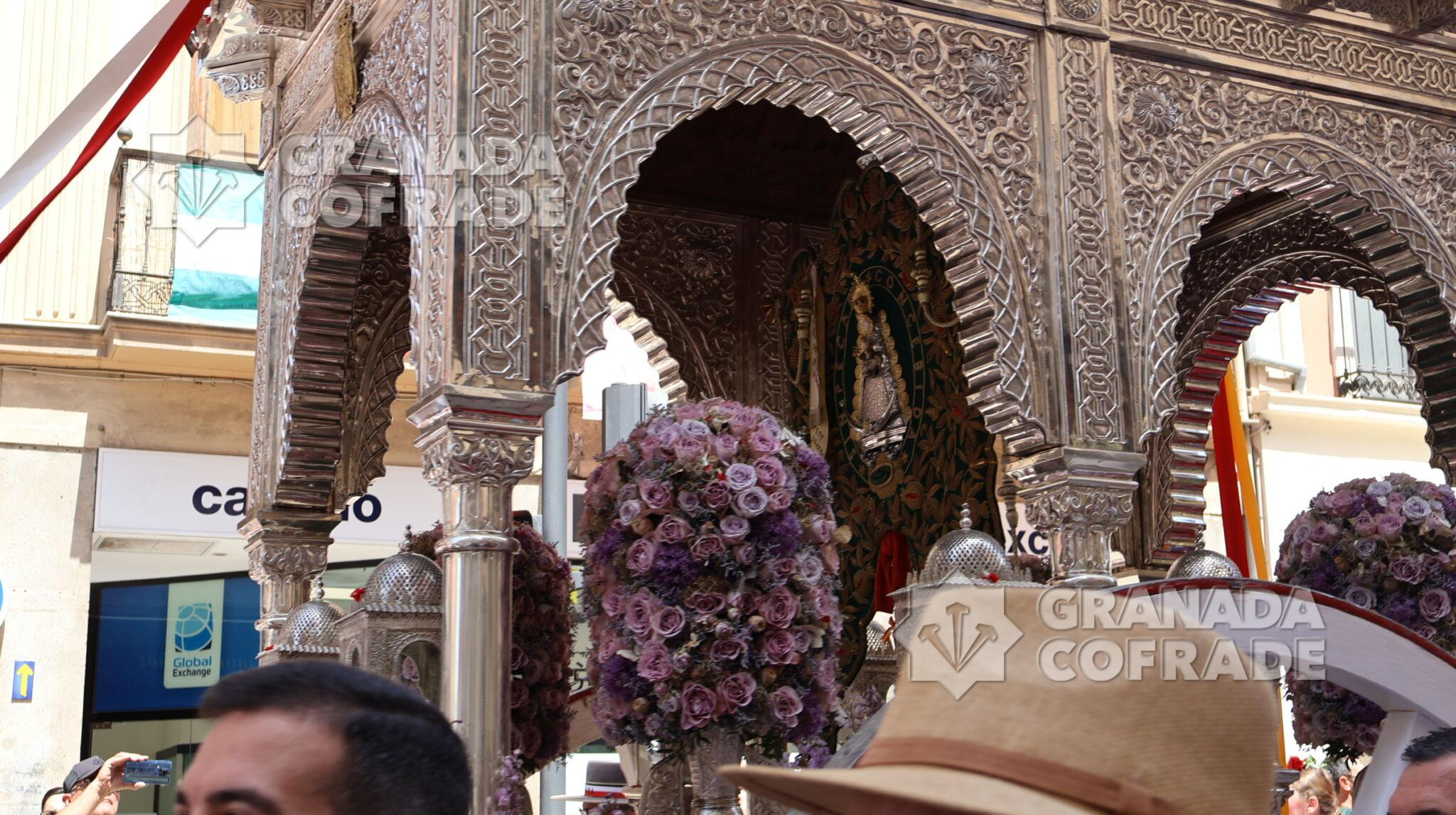Coros y grupos rocieros cantaron al Simpecado en todo el recorrido. La comitiva iba acompañada por gran número de caballos y jinetes y le seguían carriolas que harán también el camino hacia la aldea. En la Plaza del Carmen, en un pequeño lugar decorado con los colores granadinos la alcaldesa deseó «un buen camino a los romeros y que difrutéis estos días en hermandad» entregando un ramo de flores al Simpecado. Después, continuó la comitiva hasta la Virgen de las Angustias para entregar una cesta de flores a la Patrona y despedirse con el canto de la «Salve Rocío, Granada» ante la Patrona, con letra de Alfredo Alcalde y música de Paco Vidal. La hermandad granadina continuó hacia el primer «rengue» y con posterioridad, camino hacia la localidad de Loja, donde hicieron la primera acampada.