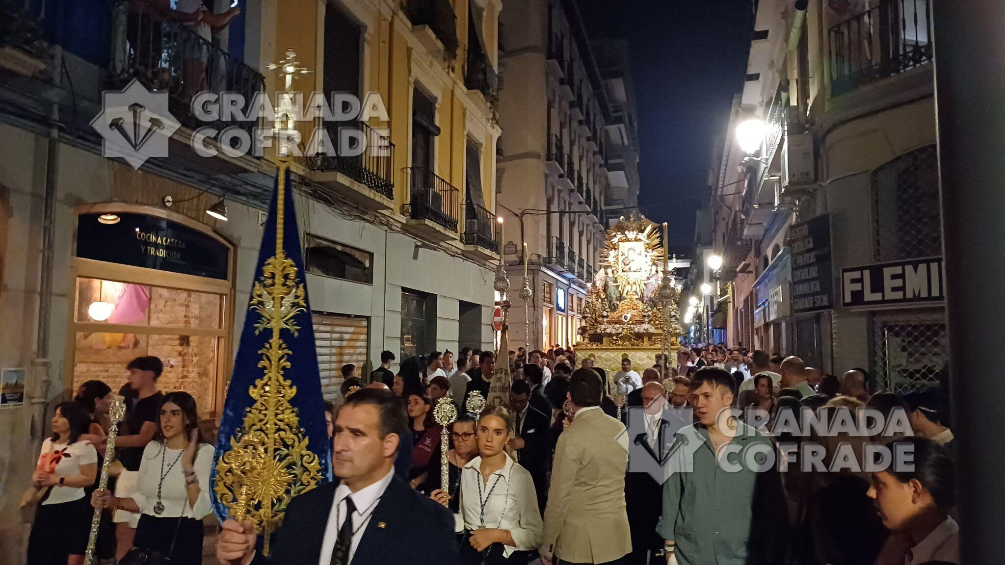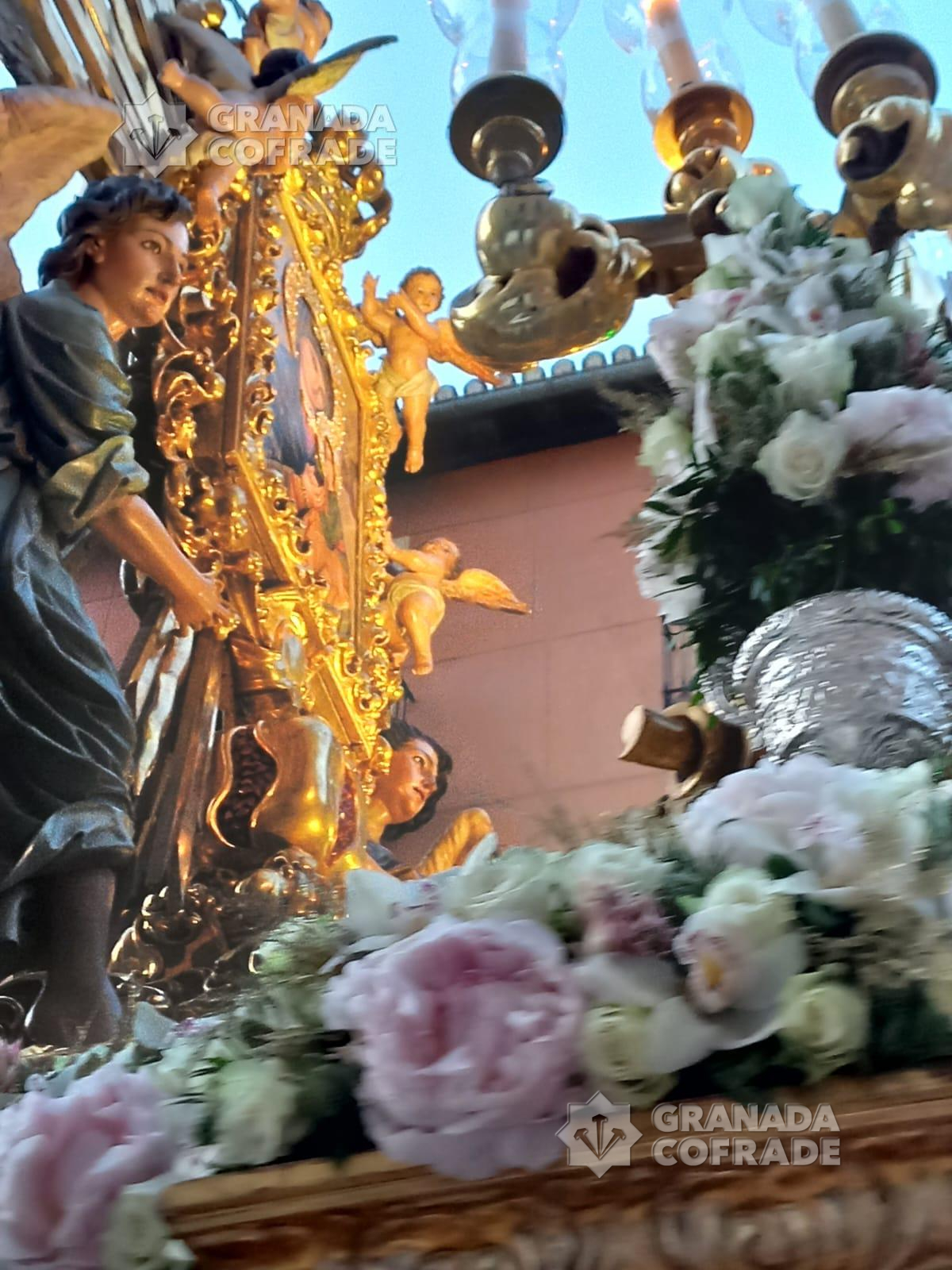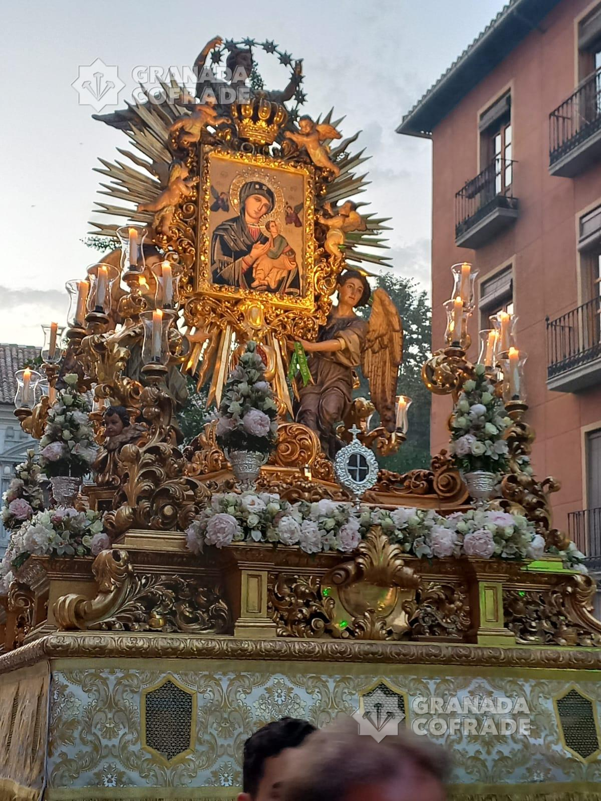 A lo sones del himno nacional se ponía el paso en la calle, adornado con flores blancas de variadas especies, a las órdenes de Dionisio Martínez. La banda de música de San Isidro, de la localidad vecina de Armilla, puso sus partituras al paso de la Virgen partiendo desde la calle San Jerónimo hacia Colegios y Duquesa para buscar así la plaza de la Trinidad, regresando posteriormente por Capuchinas eliminando la parte prevista de paso por el barrio del Boquerón debido a unos cables que obligaron a alterar el tramo final del itinerario previsto inicialmente por la junta de gobierno.