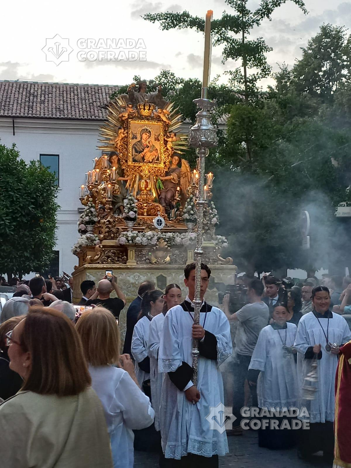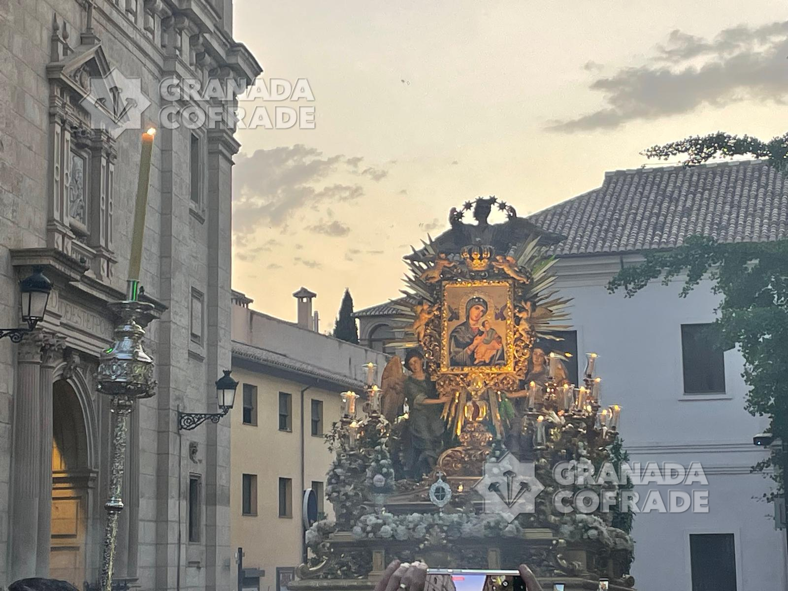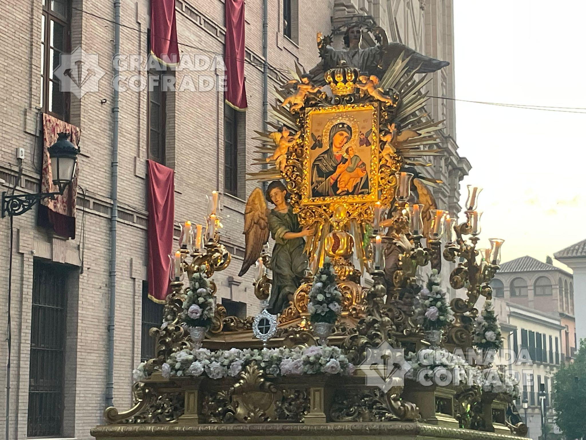 Algo más de dos horas y media duró el recorrido de la procesión de Nuestra Señora del Perpetuo Socorro, que resultó muy arropada de público y fieles que permanecieron junto al venerado Icono de la Virgen en su paso de 1924, obra de Navas Parejo. Tras la celebración del octavo día de Novena en el interior del Santuario Redentorista, partió el cortejo abierto por la cruz alzada del Santuario Mariano. Le seguían devotos del Icono y de la devoción mariana al Perpetuo Socorro, además de niños vistiendo sus trajes de Primera Comunión. El cortejo se veía acompañado también por hermanas de la corporación vestidas con mantilla negra y la participación de la representación de la cofradía de la Entrada de Jesús en Jerusalén, junto con la de las Angustias de Salar. Cerraba la comitiva que precedía al paso procesional la presidencia con su máximo responsable, el presidente de la Archicofradía, Jesús Pulido Chacón, y el superior de la comunidad Redentorista en Granada, Damián Montes, junto miembros de la misma. Estaba presente también una representación de los colegiales del Perpetuo Socorro.