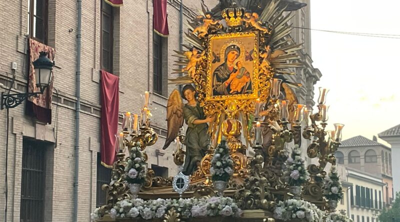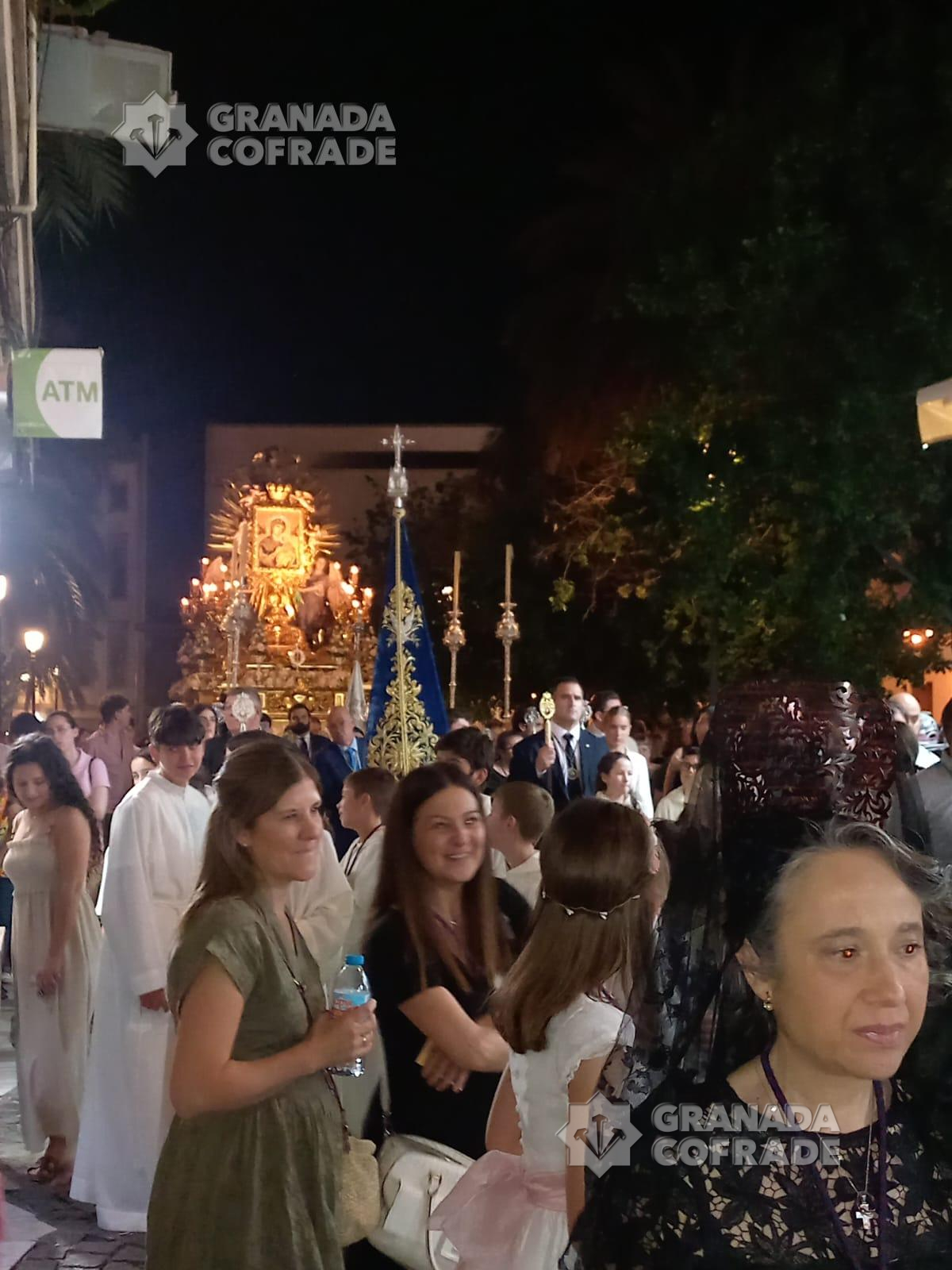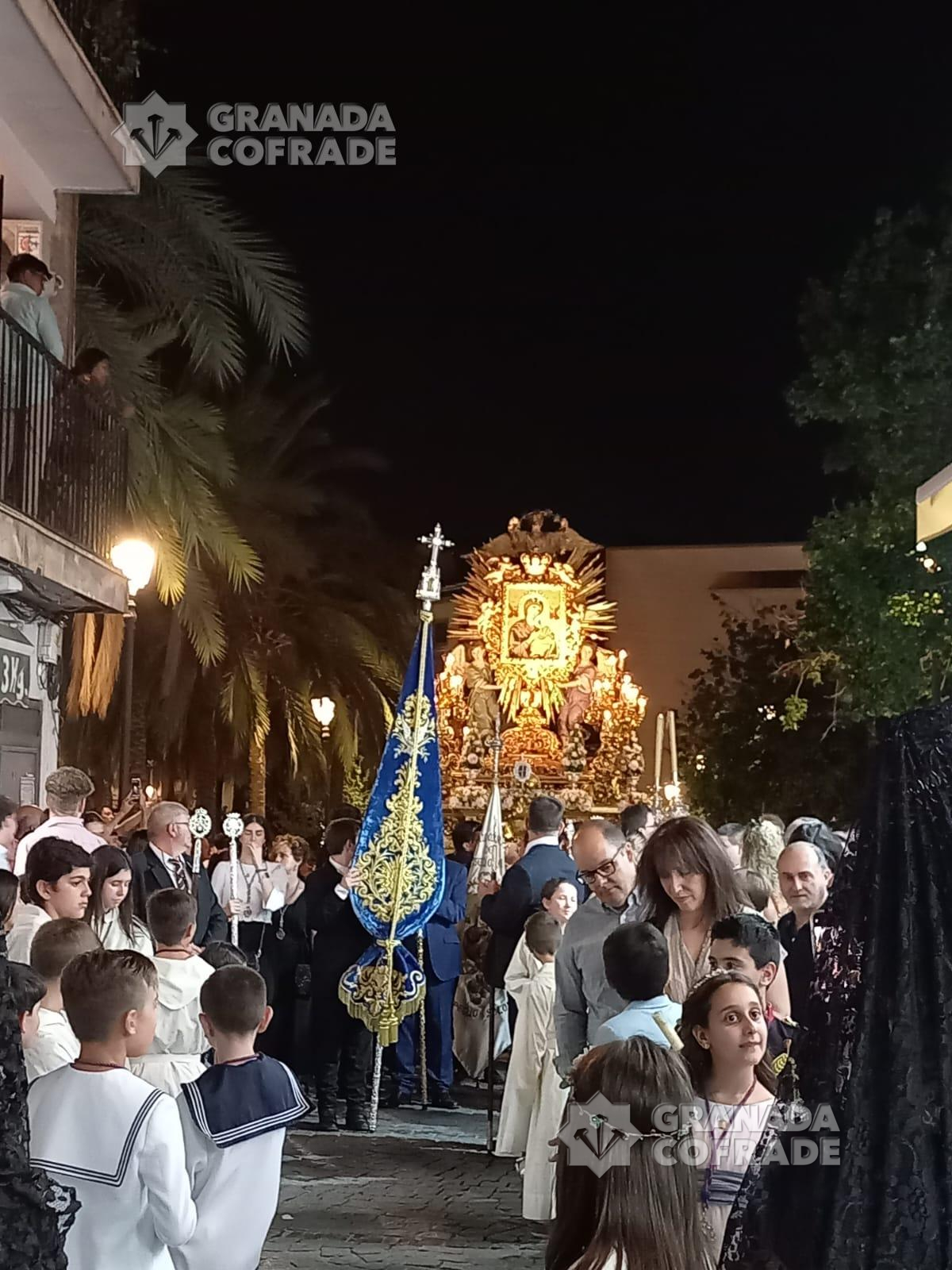 Algo más de dos horas y media duró el recorrido de la procesión de Nuestra Señora del Perpetuo Socorro, que resultó muy arropada de público y fieles que permanecieron junto al venerado Icono de la Virgen en su paso de 1924, obra de Navas Parejo. Tras la celebración del octavo día de Novena en el interior del Santuario Redentorista, partió el cortejo abierto por la cruz alzada del Santuario Mariano. Le seguían devotos del Icono y de la devoción mariana al Perpetuo Socorro, además de niños vistiendo sus trajes de Primera Comunión. El cortejo se veía acompañado también por hermanas de la corporación vestidas con mantilla negra y la participación de la representación de la cofradía de la Entrada de Jesús en Jerusalén, junto con la de las Angustias de Salar. Cerraba la comitiva que precedía al paso procesional la presidencia con su máximo responsable, el presidente de la Archicofradía, Jesús Pulido Chacón, y el superior de la comunidad Redentorista en Granada, Damián Montes, junto miembros de la misma. Estaba presente también una representación de los colegiales del Perpetuo Socorro.