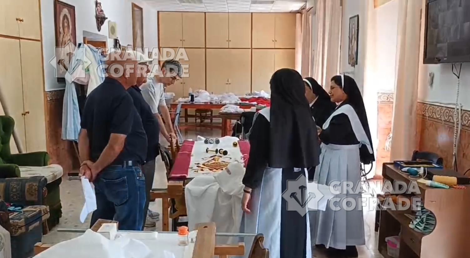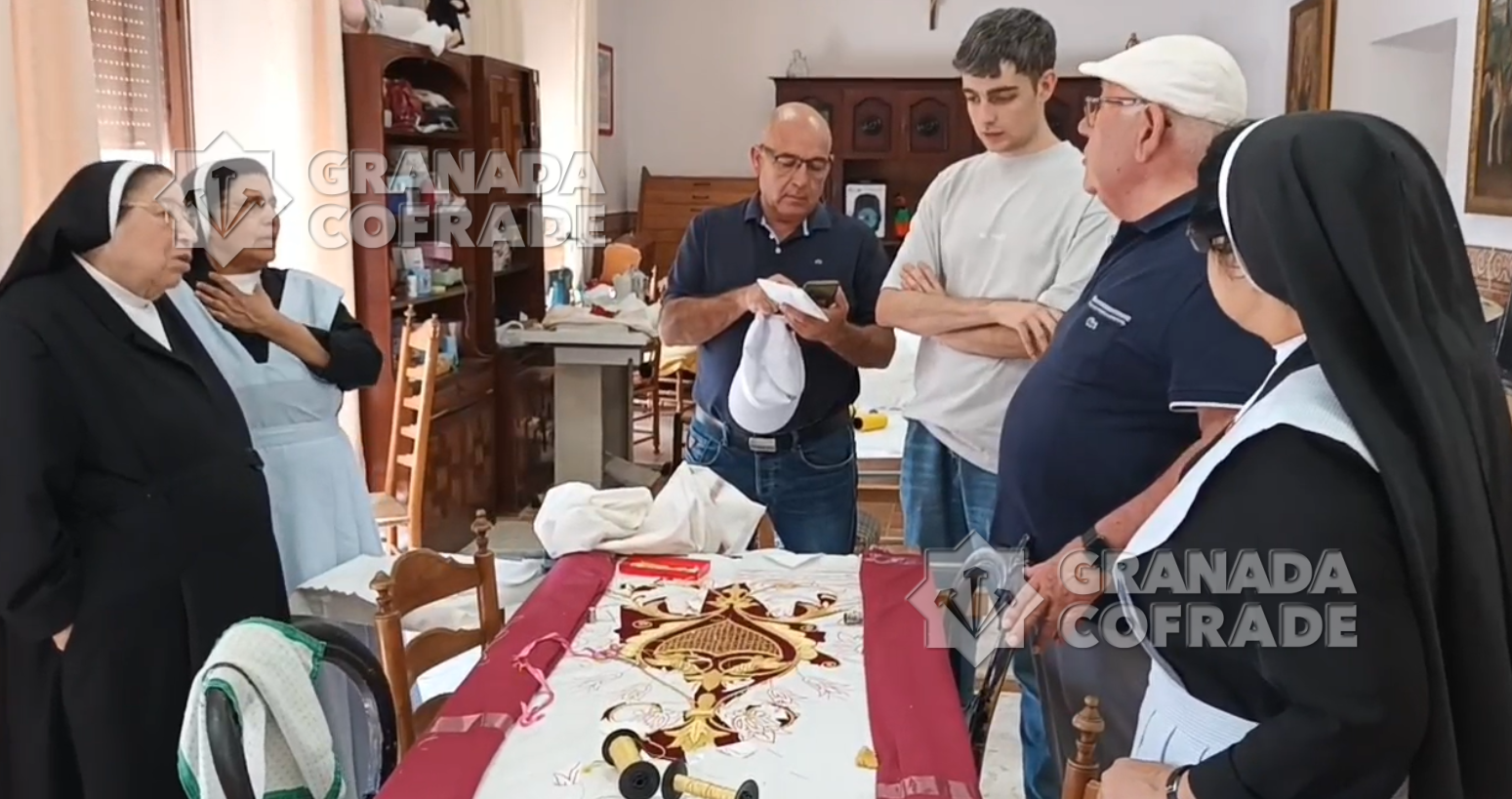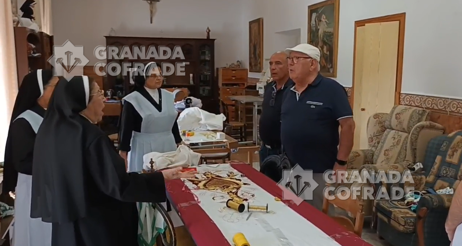 Una representación de la Hermandad de Nuestro Padre Jesús Nazareno de Algarinejo junto con el párroco de este municipio del poniente granadino, Francisco Javier Huete, han visitado hoy el convento de las Comendadoras de Santiago donde se está elaborando la nueva túnica del Señor. Han podido comprobar el avanzado estado de los trabajos que las hermanas llevan realizando desde hace tiempo. La nueva túnica surgió del deseo de los devotos de sustituir la antiguo túnica por su estado de deterioro, y decidieron que la nueva tuviera el mismo diseño. Los trabajos han podido sufragarse gracias a la aportación de los vecinos de Algarinejo.