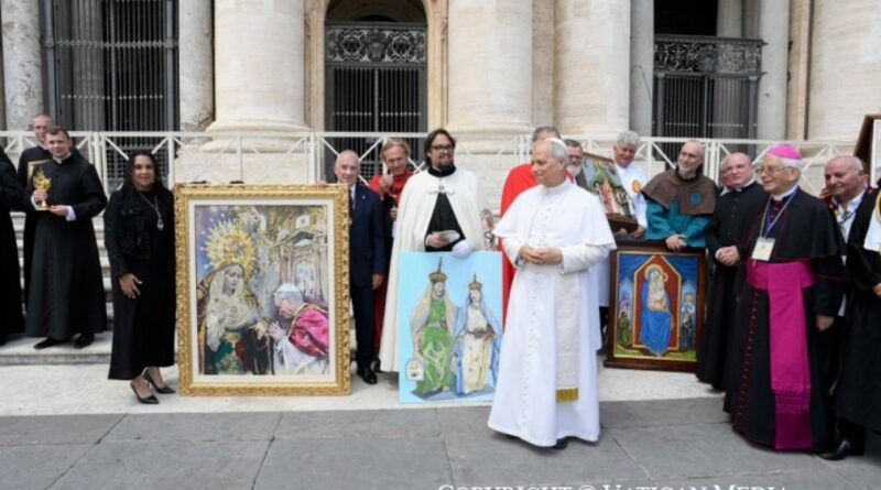 Su Santidad el Papa León XIV bendijo ayer miércoles el cuadro de la Virgen del Mayor Dolor en el que él está representado, obra de Manuel Obregón. Fue en el transcurso de una Audiencia General celebrada en la plaza de San Pedro, del Vaticano, en la que el Santo Padre mandó un saludo a los asistentes españoles y posteriormente a la audiencia saludó a la hermana mayor de la cofradía de los Escolapios, Fátima Sánchez Valenzuela, y al presidente de la Federación de Cofradías, Armando Ortiz. Estaban acompañado por Umberto Angeloni, director del Foro Paneuropeo de Hermandades y Cofradías y miembro de la Comisión Pastoral del Pontificio Consejo para la Promoción de la Nueva Evangelización y de representantes de otras ciudades de Portugal, Reino Unido, Italia o Suiza, cuyos cuadros también bendijo el Santo Padre.