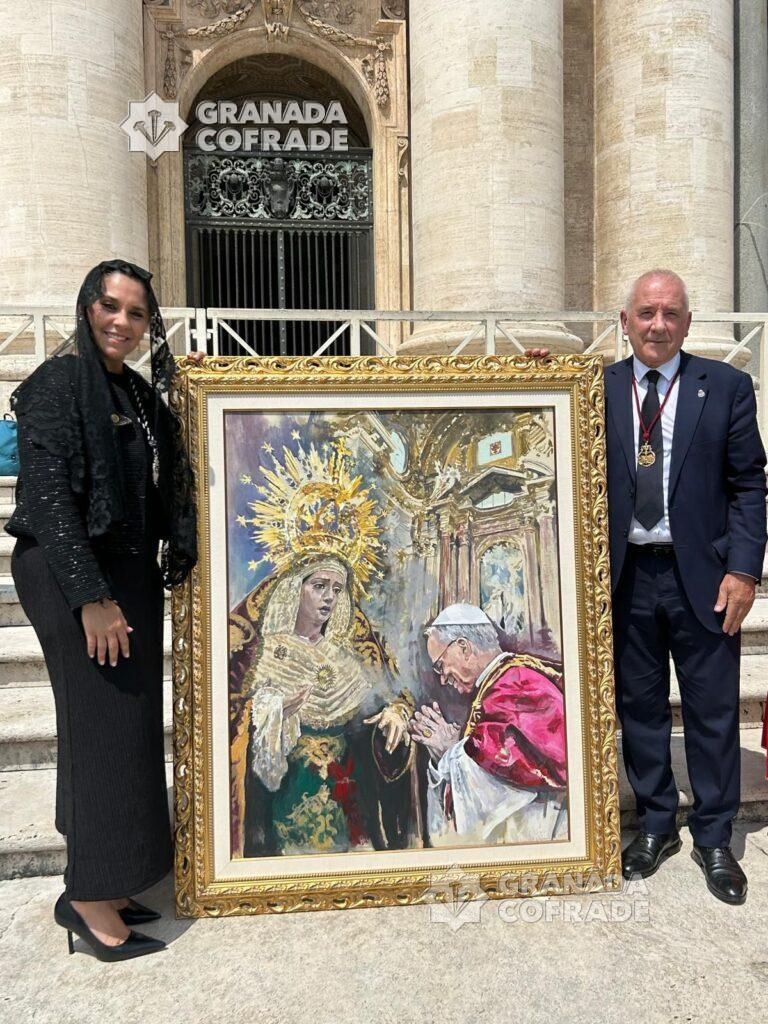 “Nos ha dado las gracias por estar allí y se ha interesado por el autor del cuadro», ha referido a GRANADA COFRADE el presidente Armando Ortiz, y la hermana mayor ha indicado que «se ha detenido ante el cuadro, lo ha bendecido y ha estado unos instantes con nosotros». El cuadro regresa a Granada y, con toda probabilidad a la exposición que estos fines de semana se puede visitar en el convento de San Bernardo con motivo del XXV aniversario de la realización de la Virgen del Mayor Dolor y de su peregrinación a Roma en el año 2000.