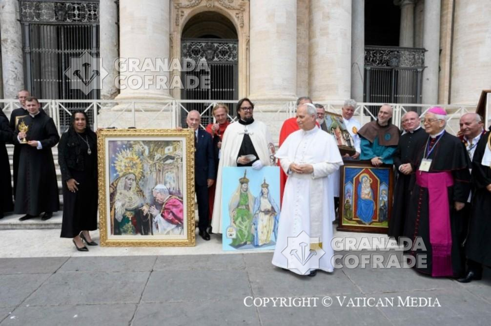 “Nos ha dado las gracias por estar allí y se ha interesado por el autor del cuadro», ha referido a GRANADA COFRADE el presidente Armando Ortiz, y la hermana mayor ha indicado que «se ha detenido ante el cuadro, lo ha bendecido y ha estado unos instantes con nosotros». El cuadro regresa a Granada y, con toda probabilidad a la exposición que estos fines de semana se puede visitar en el convento de San Bernardo con motivo del XXV aniversario de la realización de la Virgen del Mayor Dolor y de su peregrinación a Roma en el año 2000.
