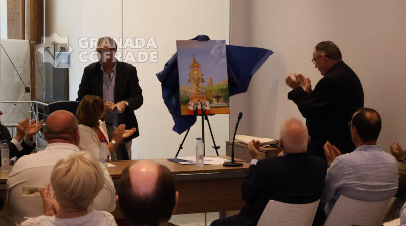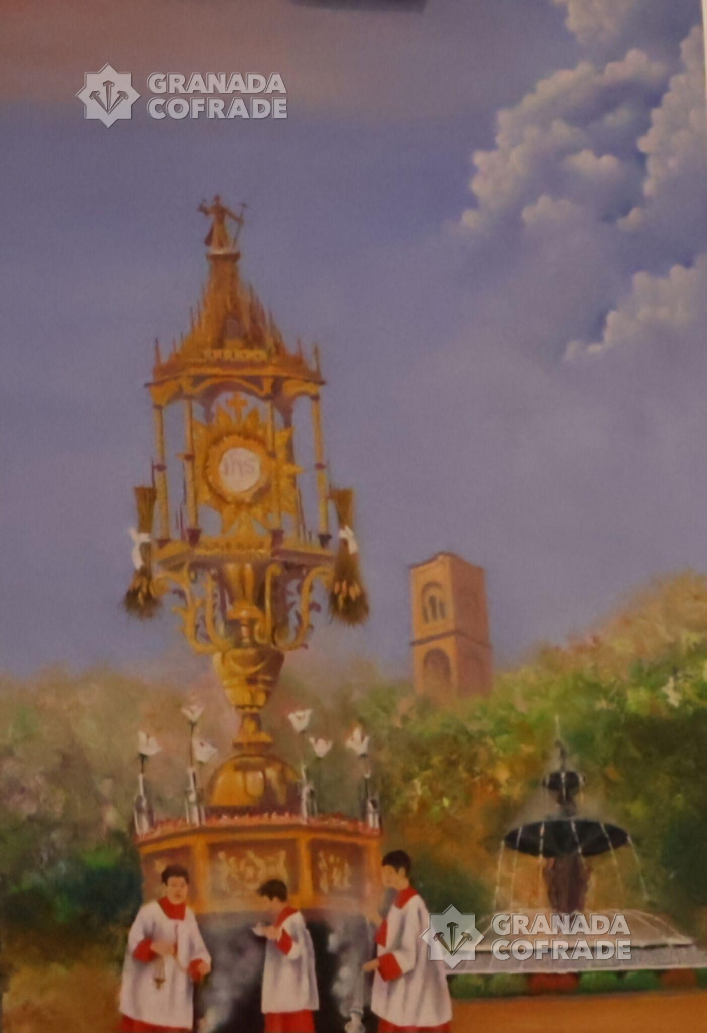 «Es una composición con la fuente de las Granadas de la cabecera del Paseo del Salón. En primer plano nuestra identitaria y preciosa Custodia del Santísimo Corpus Christi y a sus plantas tres monaguillos, con naveta y dos con incensario, elevan al cielo azul con el humo las súplicas y las plegarias, envuelve a la fuente y la Custodia la masa arbórea del Paseo y sobresale al fondo la cinco veces centenaria torre de nuestra Catedral». Con estas palabras describió el sacerdote, consiliario y Delegado Episcopal para las Hermandades de Granada, José Gabriel Martín, el cartel editado por la Asociación de Ex hermanos mayores «Corpus Christi», por tercer año consecutivo. Su autor es el antiguo hermano mayor «por dos mandatos elegido», Ángel Córcoles, miembro de la Asociación «y cuyos trabajos siempre tienen una finalidad solidaria entregando el producto de su venta a Cáritas Parroquial», señaló el presentador del cartel.