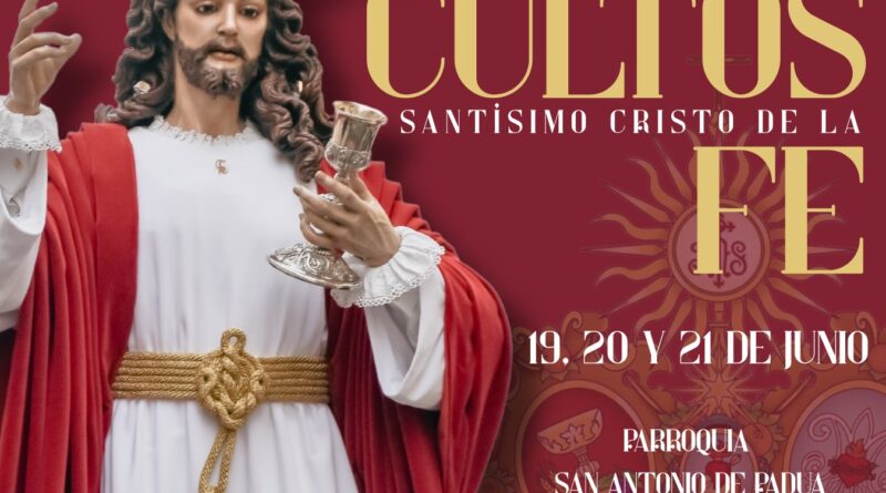 Como establecen las Reglas de la Hermandad de la Santa Cena Sacramental y María Santísima del Amor ofrece cultos en honor del Santísimo Cristo de la Fe, durante las jornadas del 19, 20 y 21 de junio . Los dos primeros días dará comienzo a las siete de la tarde con la Adoración al Santísimo Sacramento y a las siete y media, Eucaristía.El sábado día 21, a las siete y media será la celebración de la Santa Misa y a las ocho y cuarto de la noche la Exaltación Ecuarística a cargo del hermano de la corporación, Carlos Medina González-Viedma.