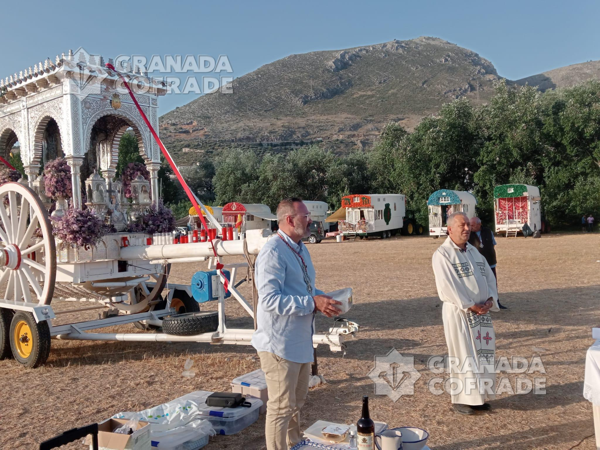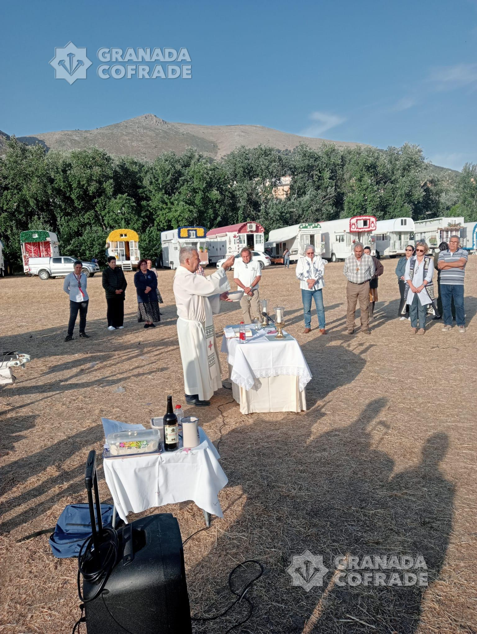 El párroco de Santa Catalina de Siena, de Loja, Juan Carlos Burgueño, ha presidido esta mañana la Eucaristía de la hermandad del Rocío de Granada, en su primera acampada. Anoche llegó hasta el lugar fijado. Las cincuenta y cinco carretas granadinas formaron en círculo y en el centro quedó la Carreta del Simpecado a la que no dejaron de acudir peregrinos durante las primeras horas de la noche para rezar ante él. Esta mañana, a las ocho se ha celebrado la Eucaristía en la que ha intervenido un coro improvisado por varios romeros y a la que ha asistido un grupo de rocieros de la hermandad de Granada.