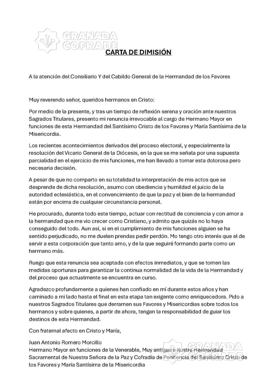 Reproducimos a continuación la carta de dimisión de Juan Antonio Romera trasladada a los hermanos de la cofradía del Viernes Santo granadino.
