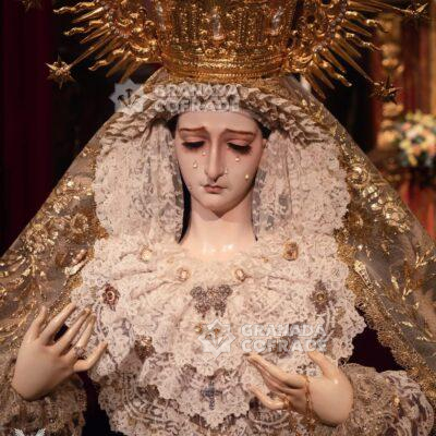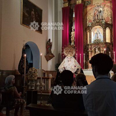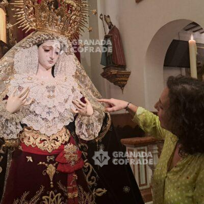 Nuestra Señora del Amor y el Trabajo volvió a reencontrarse en la jornada de ayer con los fieles de San Lázaro y de los Pajaritos, así como con cientos de devotos de toda Granada que, a pesar de las altas temperaturas y de lo inusual de las fechas, acudieron puntuales a la cita con la titular mariana de la Hermandad Ferroviaria. En total, han sido 46 días los que han transcurrido desde que la imagen fuera retirada del culto para su restauración el pasado 18 de mayo. Un tiempo que ha permitido volver a contemplar a la Virgen del Amor y el Trabajo tal y como fue concebida por su autor allá por 1770.