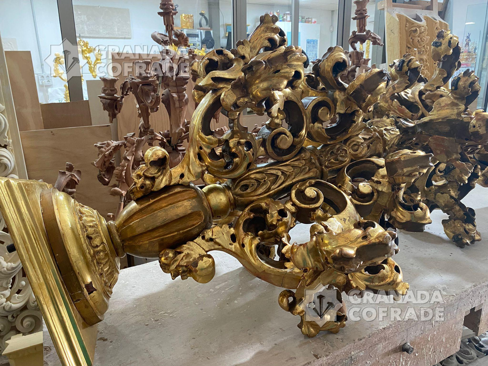 El taller de dorado y restauración de Abel Velarde (Alcalá de Guadaíra, Sevilla) ha arrancado la tercera y última fase de restauración de los guardabrisas del paso de Jesús