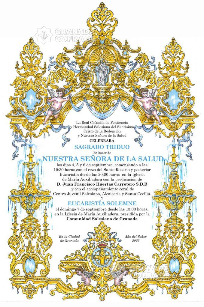 Convoca la cofradía del Santísimo Cristo de la Redención  el triduo septembrino en honor de su Titular mariana Nuestra Deñora de la Salud. Se inició en la jornada de ayer jueves y continuará hoy viernes y mañana sábado, 6 de septiembre. Cada día da comienzo a las 20:00 horas, precedido del rezo del Santo Rosario a las 19:30 horas. Las jornadas del triduo se desarrollan en la sede canónoca de la iglesia salesiana de Maria Auxiliadora, del Zaidi. El Ejercicio del triduo está presidido por Juan Francisco Huertas Carretero SDB y acompaña el Centro Juvenil Salesiano, Alcaicería y Santa Cecilia.