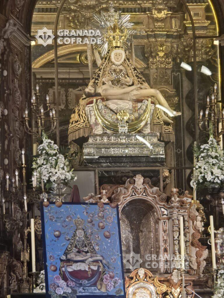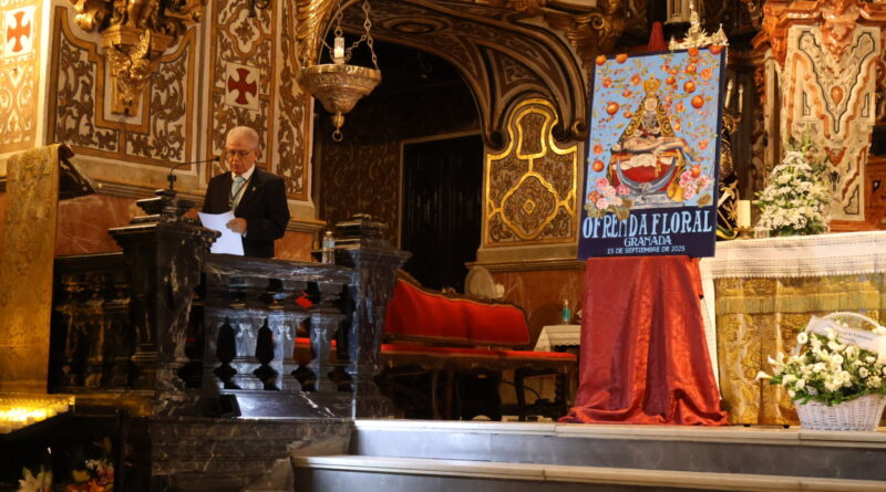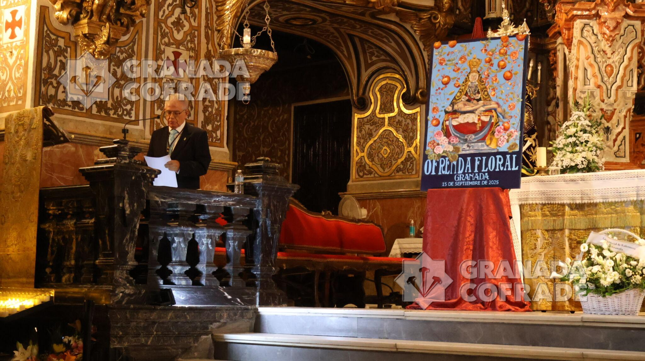 Anoche fue dado a conocer el cartel de la ofrenda floral a la Patrona de Granada, Fue en el transcurso de un acto presidido por la Patrona, en su basílica y ante la asistencia de unos cincuenta hermanos y granadinos. Un cartel «que huye de los típicos tópicos de la Alhambra o los azulejos con los que uno que es de fuera de Granada acostumbra a contemplar. He representado a la Virgen con geranios a sus pies en recuerdo de una anécdota ocurrida en la primera ofrenda floral cuando una señora los trajo recogidos de una de sus macetas» relató el autor del cartel, Jesús Medina Cózar.