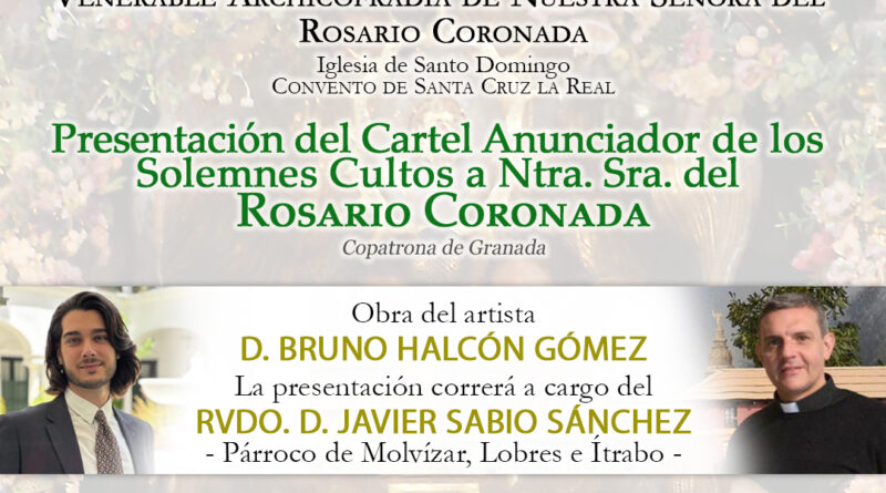 El próximo lunes 22 de septiembre, será la presentación del cartel anunciador de los Solemnes Cultos a Nuestra Señora del Rosario Coronada. A las 21:00 horas comenzará el acto en el que se dará a conocer el cartel, que tendrá como escenario la Sala capitular del Camarín de la Santísima Virgen. El cartel estará protagonizado por una obra del artista hispalense Bruno Halcón Gómez, y será presentado por el hermano de la Archicofradía y sacerdote, Javier Sabio Sánchez.