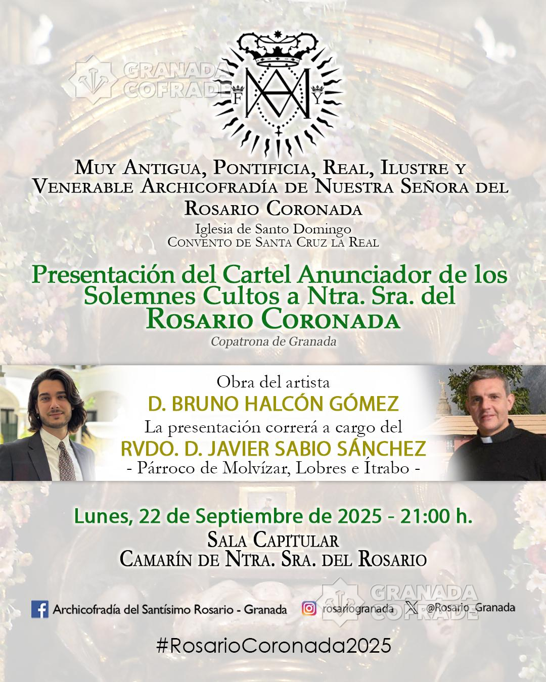 El próximo lunes 22 de septiembre, será la presentación del cartel anunciador de los Solemnes Cultos a Nuestra Señora del Rosario Coronada. A las 21:00 horas comenzará el acto en el que se dará a conocer el cartel, que tendrá como escenario la Sala capitular del Camarín de la Santísima Virgen. El cartel estará protagonizado por una obra del artista hispalense Bruno Halcón Gómez, y será presentado por el hermano de la Archicofradía y sacerdote, Javier Sabio Sánchez.