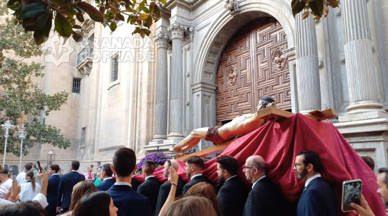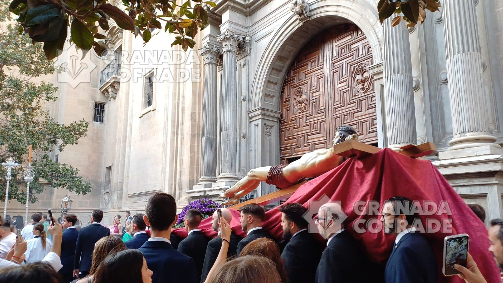 El cortejo discurrió muy ágil bajando por la calle San José a los Grifos y desde ahí a la Cuesta de San Gregorio para, por Calderería Vieja llegar a la calle Elvira y cruzar la Gran Vía procedente de calle Almireceros hasta la calle Oficios. El cortejo se abría por la cruz parroquial y ciriales e inmediatamente detrás la imagen del Crucificado custodiado por cuatro faroles de plata. Le seguía una impresionante multitud de devotos y cofrades que iba aumentando conforme bajaba la venerada imagen. Entró en plaza de Alonso Cano dándose la coincidencia del final de una celebración matrimonial y en plaza de las Pasiegas se preparaba un concierto que estrechaba el paso de la comitiva hasta el interior de la Catedral.