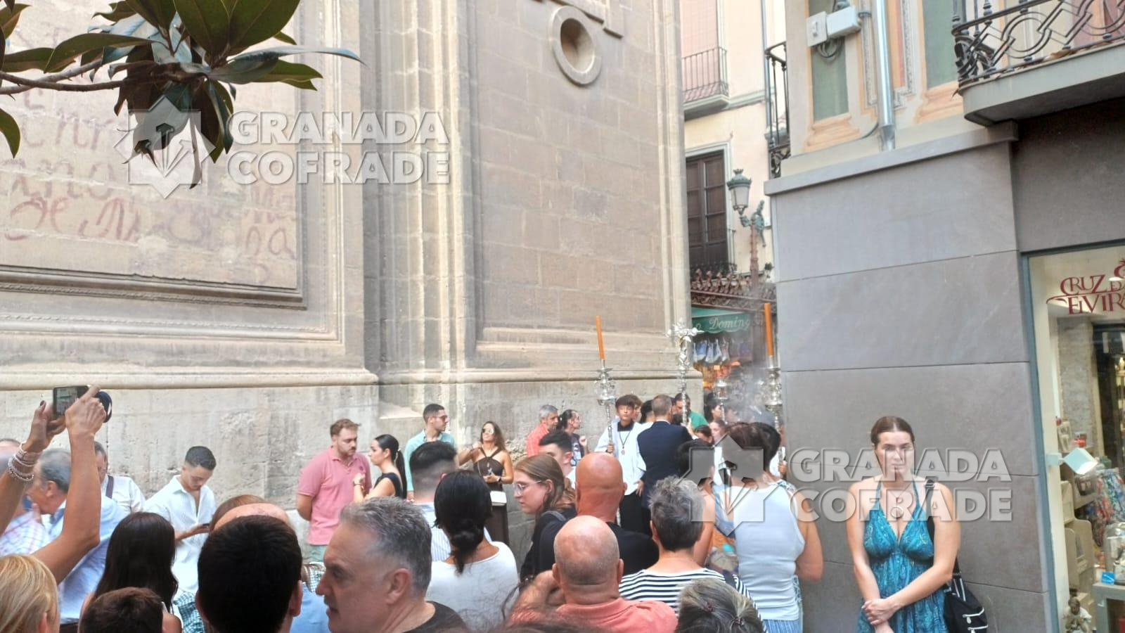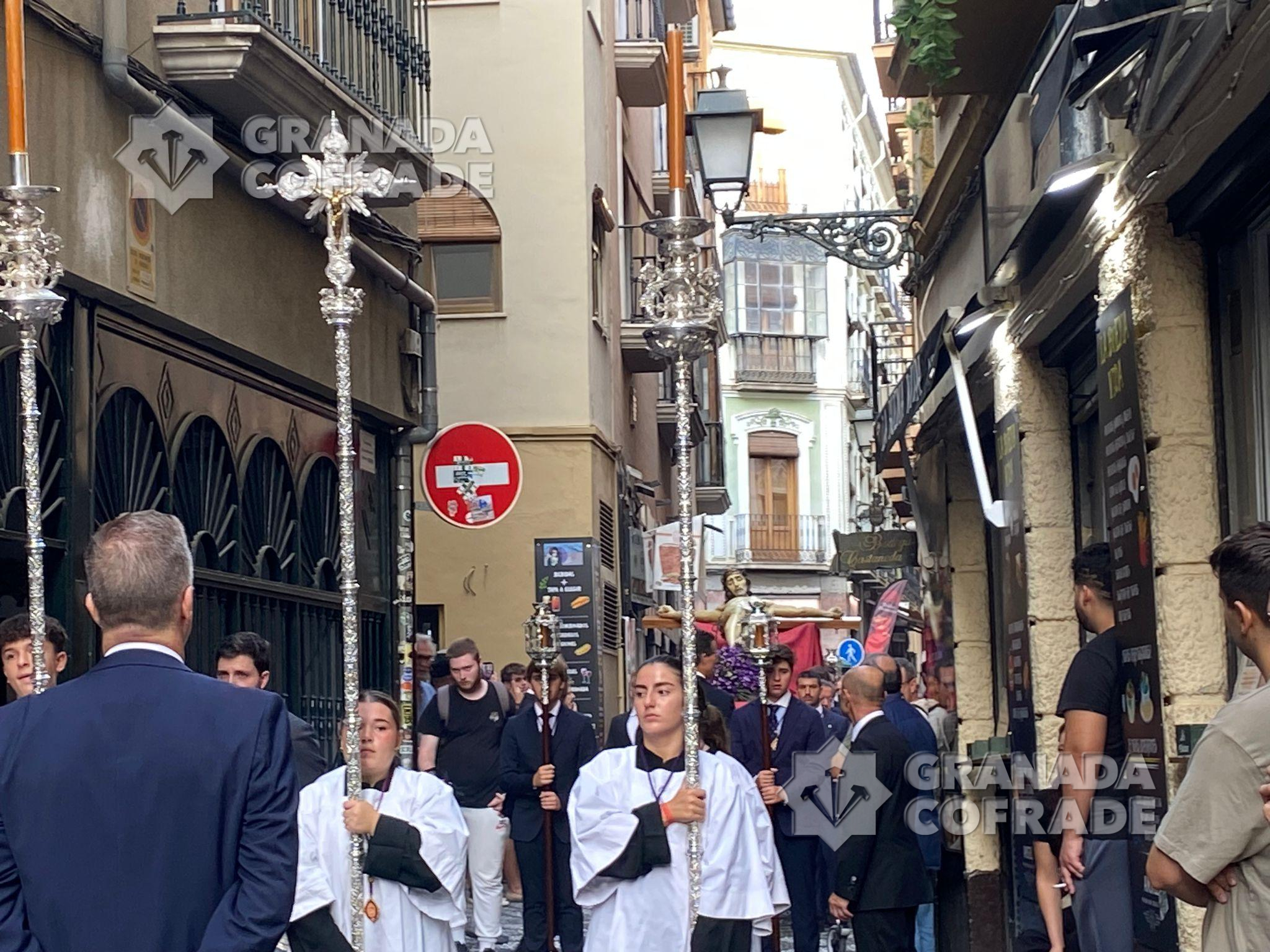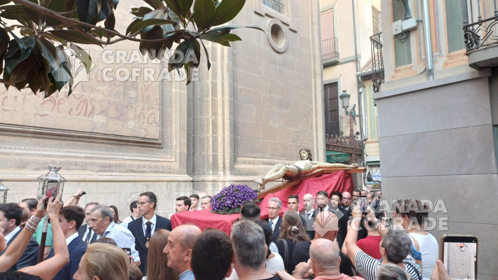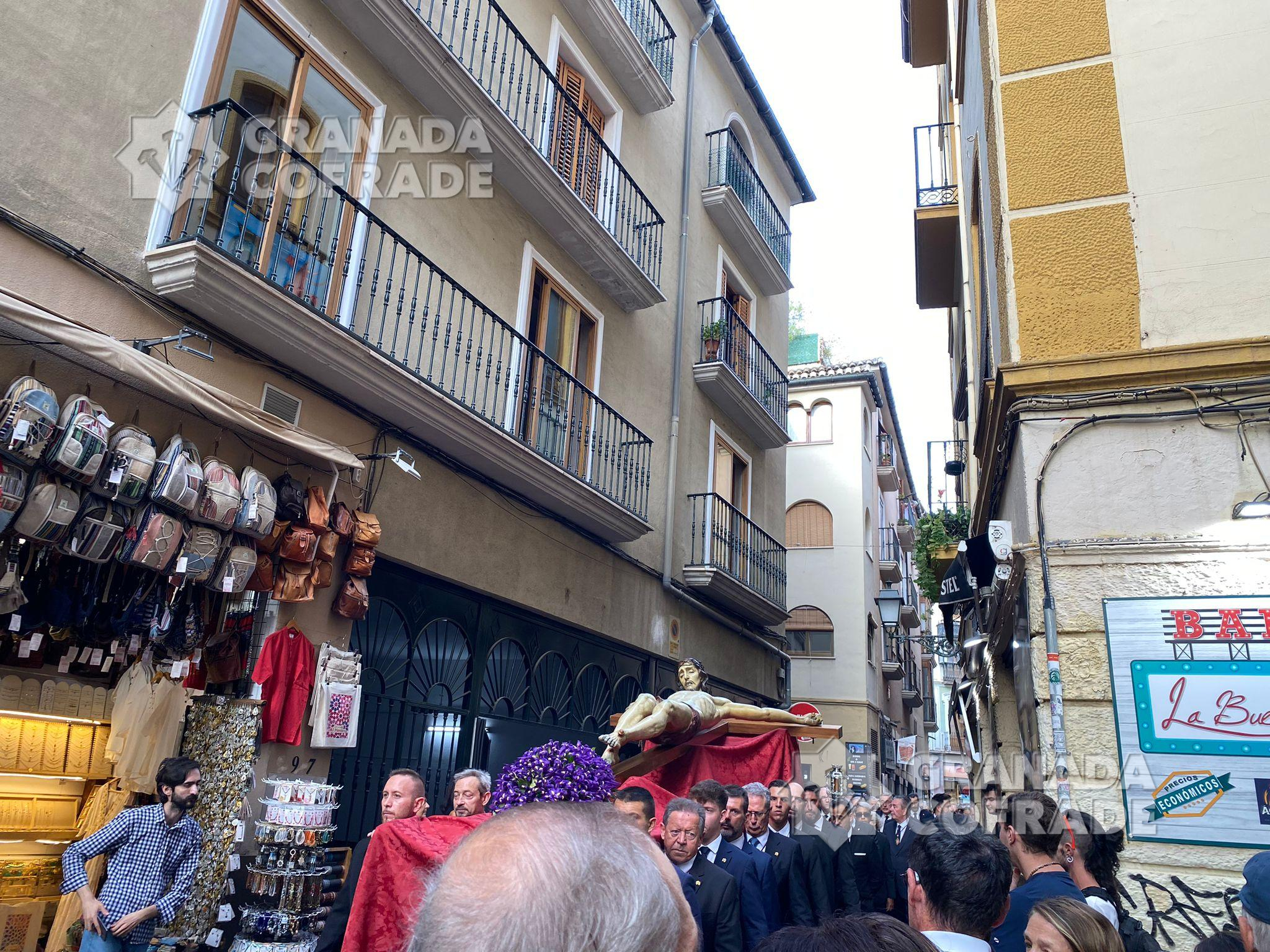 El cortejo discurrió muy ágil bajando por la calle San José a los Grifos y desde ahí a la Cuesta de San Gregorio para, por Calderería Vieja llegar a la calle Elvira y cruzar la Gran Vía procedente de calle Almireceros hasta la calle Oficios. El cortejo se abría por la cruz parroquial y ciriales e inmediatamente detrás la imagen del Crucificado custodiado por cuatro faroles de plata. Le seguía una impresionante multitud de devotos y cofrades que iba aumentando conforme bajaba la venerada imagen. Entró en plaza de Alonso Cano dándose la coincidencia del final de una celebración matrimonial y en plaza de las Pasiegas se preparaba un concierto que estrechaba el paso de la comitiva hasta el interior de la Catedral.