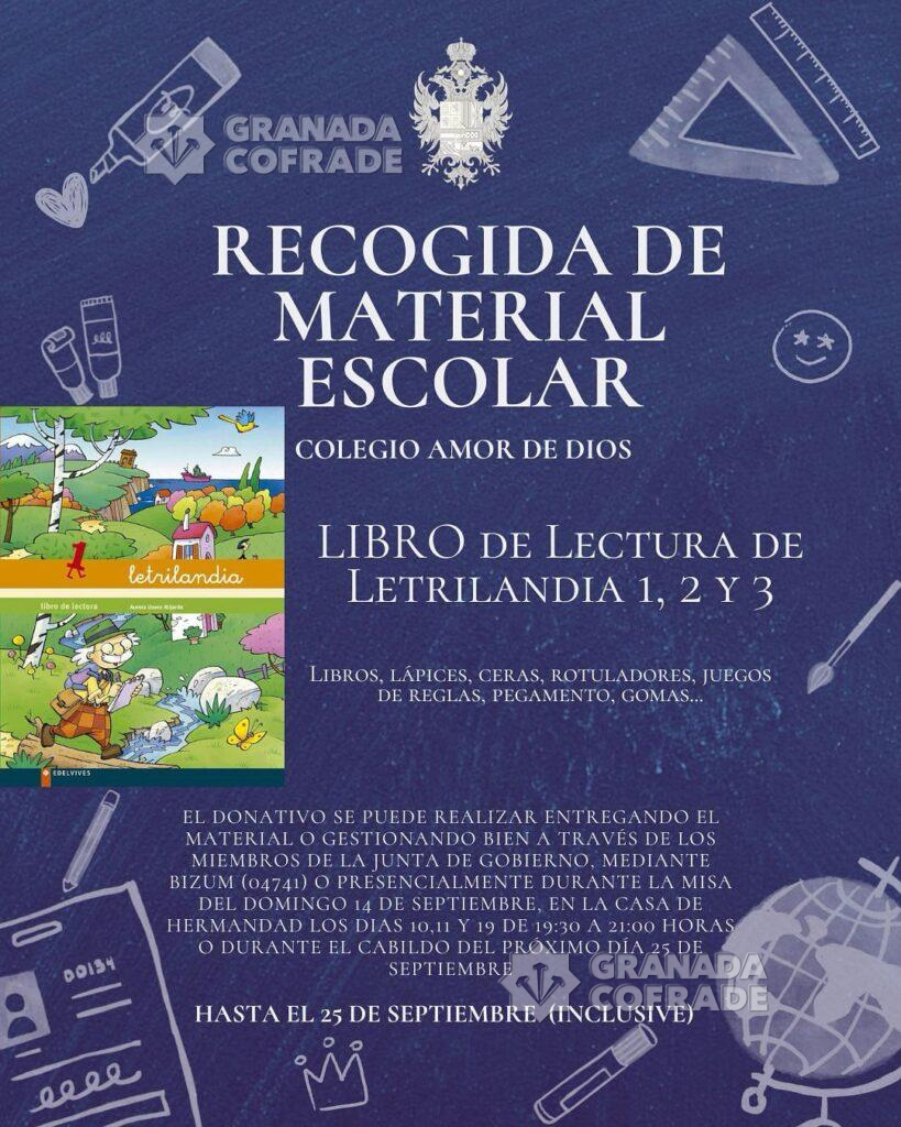 La Vocalía de Caridad de la Hermandad de Nuestro Padre Jesús de la Paciencia ha puesto en marcha un año más la Campaña de Recogida de Material Escolar que este año nuevamente será destinado al Colegio Amor de Dios de la zona norte de la ciudad. Se necesita todo tipo de material (bolígrafos, gomas, lápices ,libretas, rotuladores, tijeras, pegamento). También les han pedido estos libros Letrilandia Libro de lectura 1, 2 y 3.