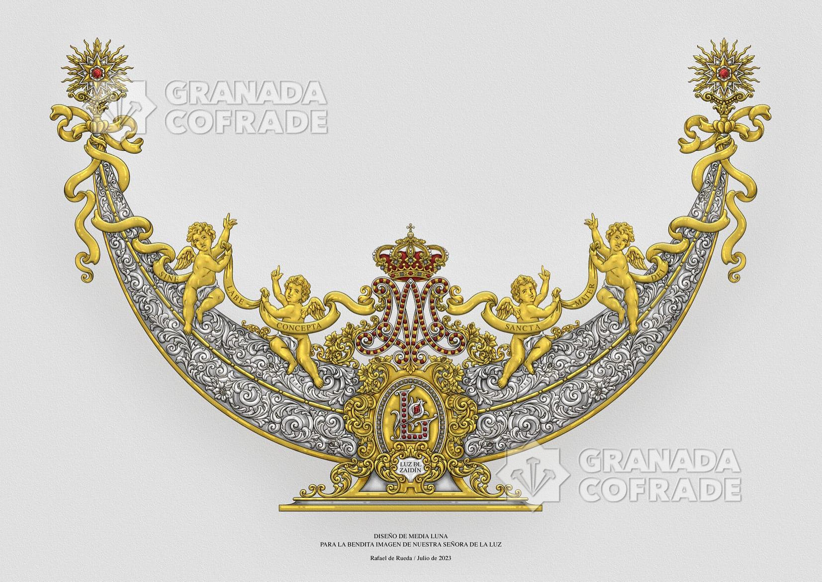 De esta cartela nace la media luna en plata propiamente dicha profusamente labrada a base de roleos, rematada por dos estrellas doradas con detalles de plata y rubíes centrales. Sobre la media luna se despliegan cuatro ángeles dorados que portan una filacteria, también dorada, con la inscripción “Sine Labe Concepta Sancta Mater Dei” (Sin Pecado Concebida Santa Madre de Dios). Esta filacteria o lacería envuelve la media luna con dos nudos en sus extremos que aportan al diseño gran movimiento y dinamismo. Como detalle, estos ángeles señalan a la Virgen como refuerzo conceptual del significado propio de la media luna.