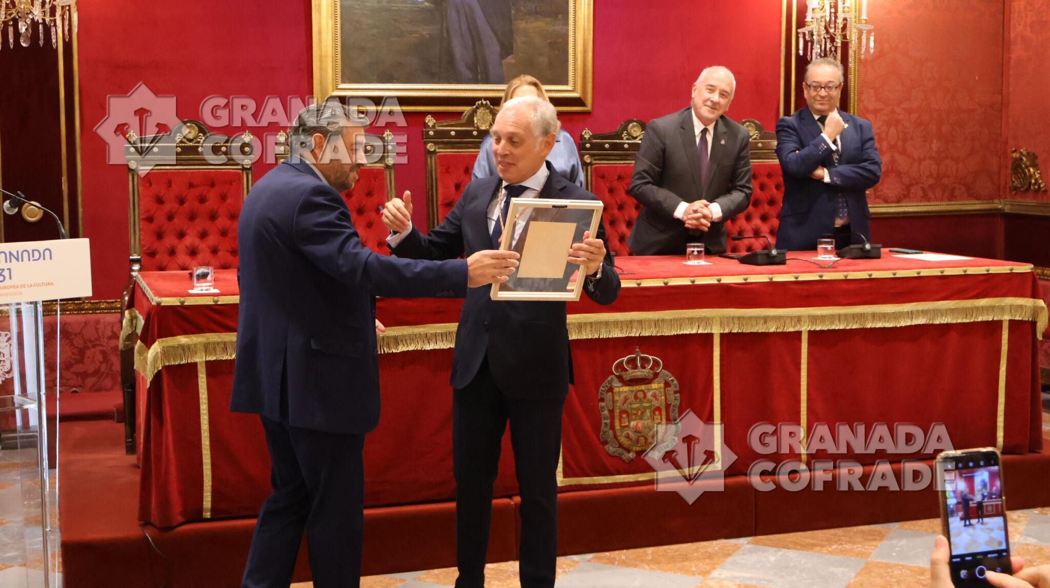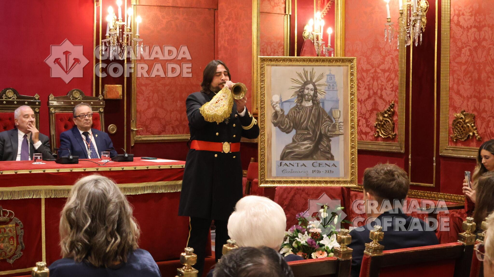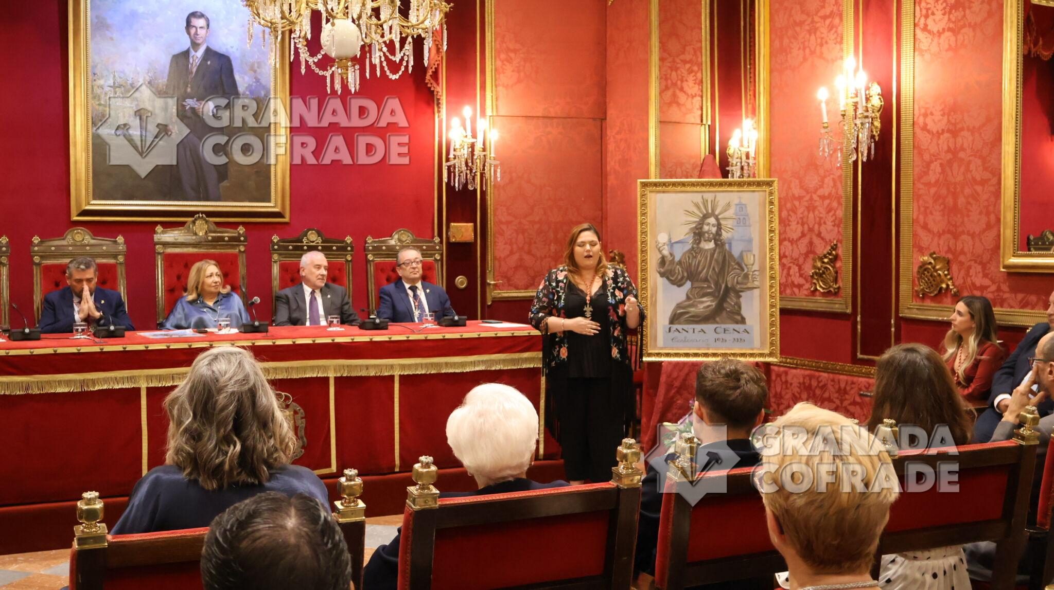 Francisco Barroso abrió ayer la caja de las sorpresas de un cartel «realizado al óleo sobre lienzo y que recuerda el Art-decó de los años cuarenta, reinterpretando la portada de la publicación de 1944 «Acuarelas Granadinas» de José Gómez Sánchez-Reina que fuera su hermano mayor y prócer de esta hermandad del Domingo de Ramos. Una presentación realizada en el Salón de Plenos del Ayuntamiento de Granada en la que destacó los sentimientos que levanta la obra, las características del autor del cartel y las distintas expresiones que puede encontrar el hermano de esta cofradía a punto de ser centenaria. «El Cáliz ahí está y la Sagrada Forma en la que Juan Díaz Losada convierte en un altar que llega hasta nuestros corazones, en una luz que es fruto de la minuciosidad de sus detalles y de la delicadeza de sus pinceladas y abajo la leyenda: Santa Cena, Centenario, 1926-2026». La hermana número 1 de la cofradía, Carmen Torres, y el propio presentador del cartel fueron los encargados de destaparlo a los ojos del público.