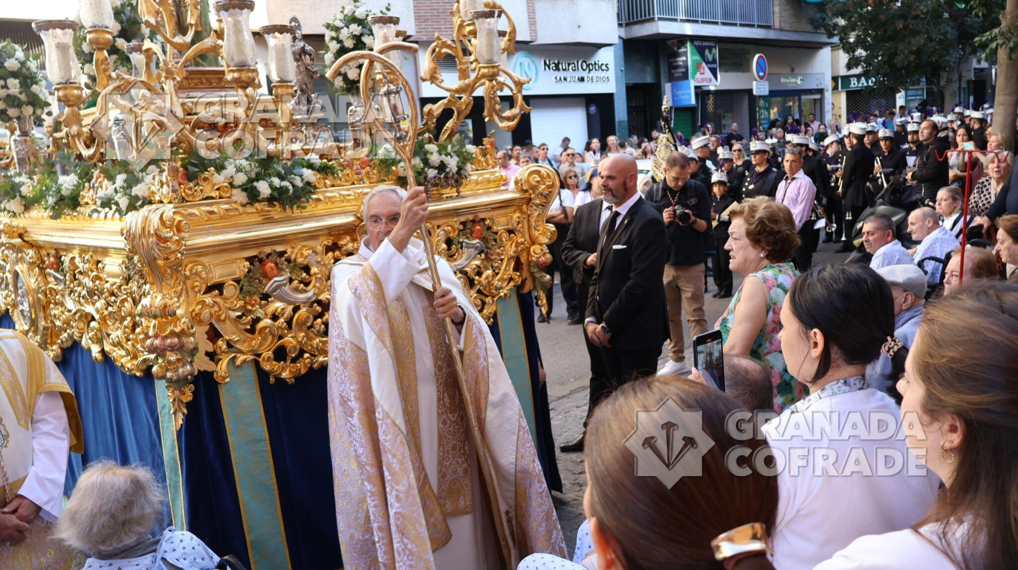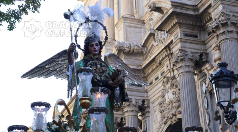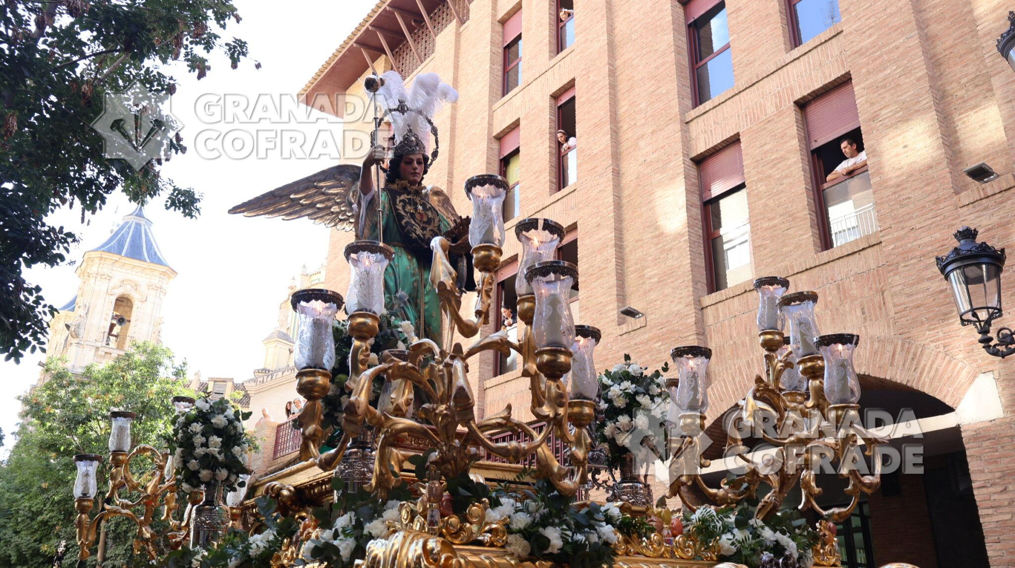 El paso procesional de San Rafael estrenaba nueva fase del bordado de los faldones con granadas bordadas en oro y el escudo de la Orden Hospitalaria e iba adornado con claveles blancos, principalmente, lentisco y eucalipto tanto los frisos como sus jarras. Era portado por costaleras a las órdenes de Curro Quiles y José Carlos Torres, y el acompañamiento musical por la Agrupación del Dulce Nombre de Jesús. El recorrido procesional siguió por la calle San Juan de Dios hasta Nueva del Santísimo y Navarrete para pasar por el interior del barrio y regresar al templo basilical donde se celebró el tercer día de novena al Hermano Mayor de la Orden Hospitalaria.