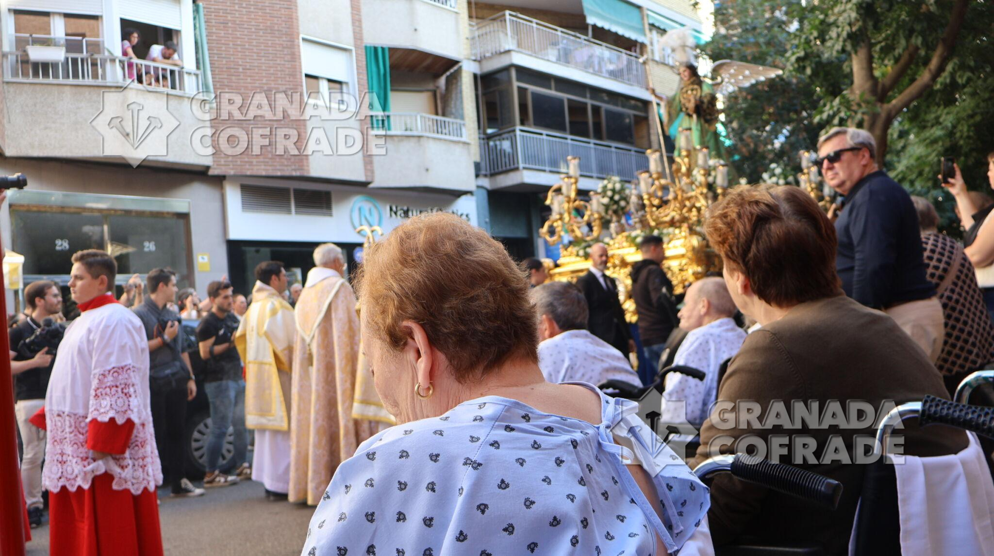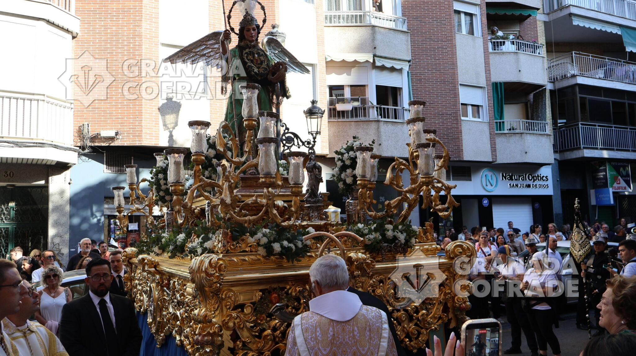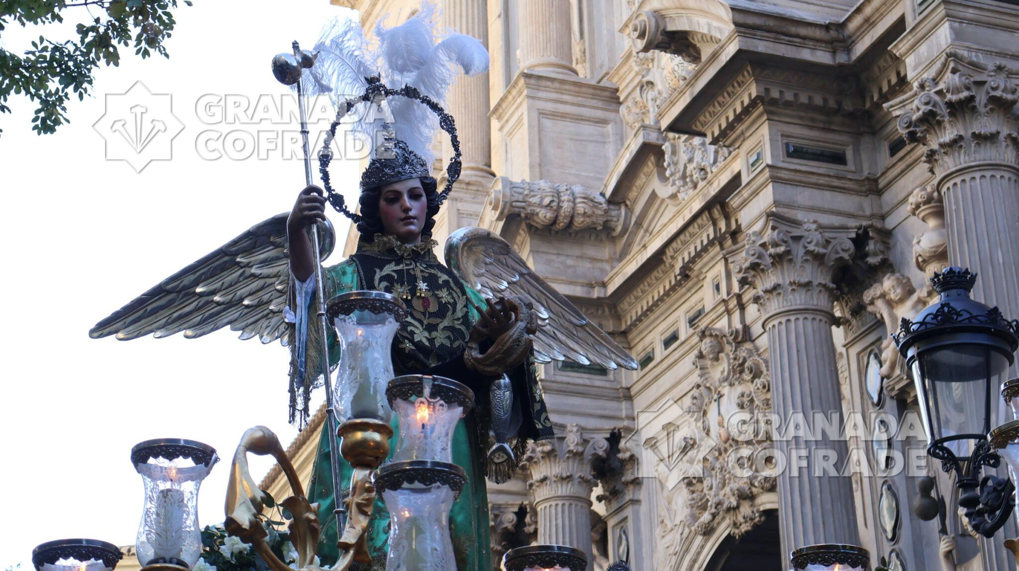 El paso procesional de San Rafael estrenaba nueva fase del bordado de los faldones con granadas bordadas en oro y el escudo de la Orden Hospitalaria e iba adornado con claveles blancos, principalmente, lentisco y eucalipto tanto los frisos como sus jarras. Era portado por costaleras a las órdenes de Curro Quiles y José Carlos Torres, y el acompañamiento musical por la Agrupación del Dulce Nombre de Jesús. El recorrido procesional siguió por la calle San Juan de Dios hasta Nueva del Santísimo y Navarrete para pasar por el interior del barrio y regresar al templo basilical donde se celebró el tercer día de novena al Hermano Mayor de la Orden Hospitalaria.