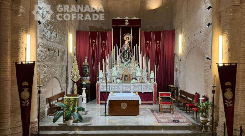 La imagen de Nuestra Señora de los Reyes lucirá ataviada por su vestidor, Jorge Heredia, sobre el altar dispuesto por la priostía en el presbiterio del templo sede de la cofradía del Martes Santo granadino.