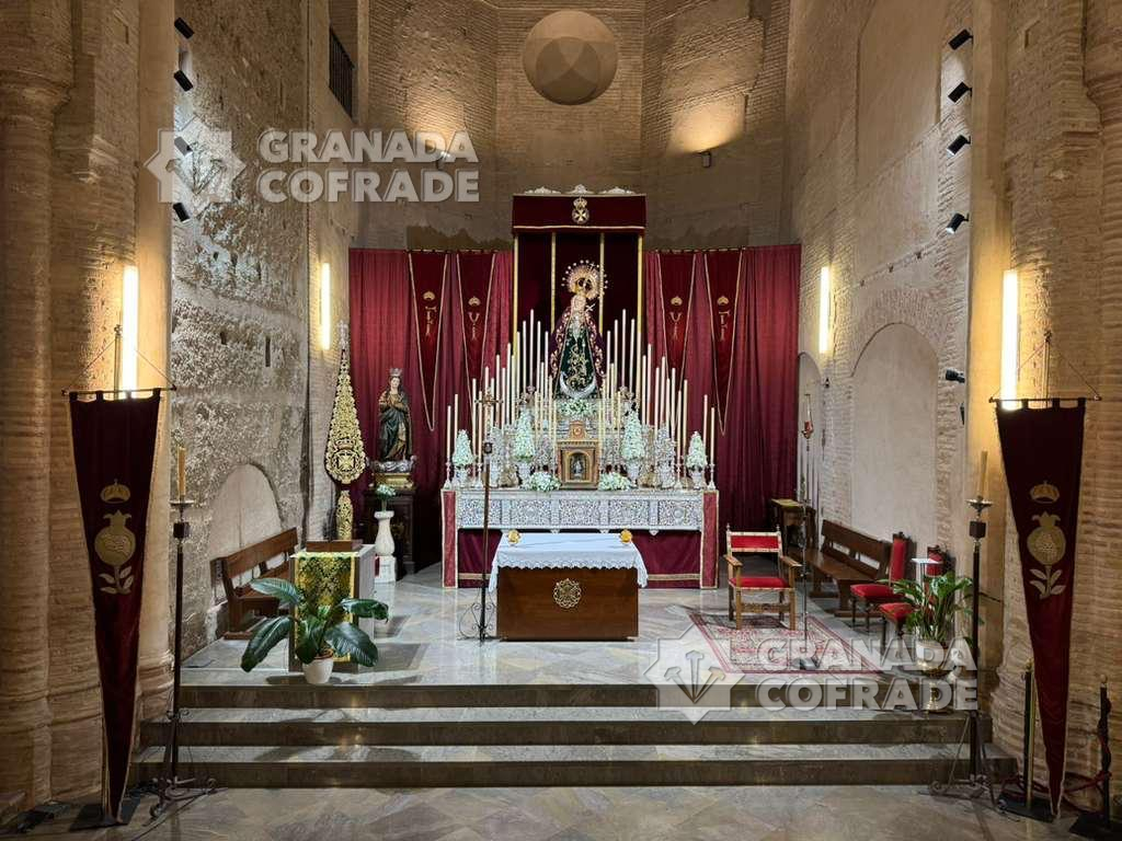 La imagen de Nuestra Señora de los Reyes lucirá ataviada por su vestidor, Jorge Heredia, sobre el altar dispuesto por la priostía en el presbiterio del templo sede de la cofradía del Martes Santo granadino.