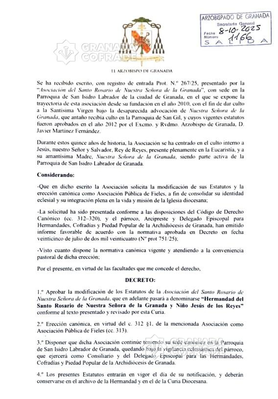 Desde ayer Granada tiene una nueva hermandad, en este caso de gloria. Se trata de la del Rosario de Nuestra Señora de la Granada que en adelante pasará a denominarse «Hermandad del Santo Rosario de Nuestra Señora de la Granada y Niño Jesús de los Reyes». El decreto de erección canónica en la parroquia de San Isidro Labrador ha sido firmado por el prelado granadino monseñor Gil Tamayo y en el mismo, además de la reforma estatutaria, se exhorta a los miembros de la Hermandad a fomentar integridad y las buenas costumbres, el espíritu de conversión personal y vida cristiana más profunda en los miembros de la hermandad, que promuevan el culto público y lleven a cabo iniciativas de compromisos de evangelización que animen de espíritu cristiano el orden temporal, además asuman con espiritu misionero los compromisos apostólicos, sociales y cristianos que en el campo familiar, profesional y social debe desarrollar un católico, consciente, dentro de la pastoral diocesana parroquial”.