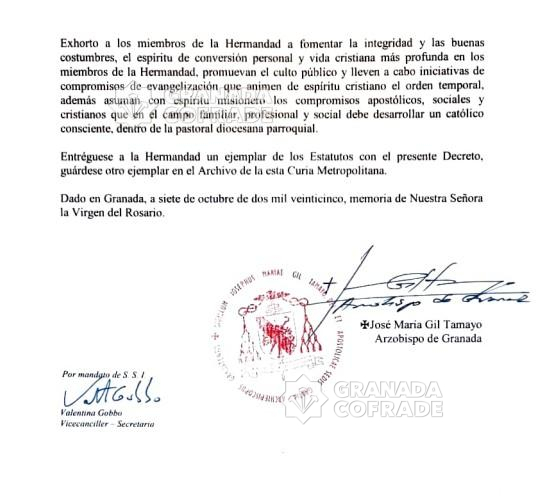 El Arzobispado decreta la erección canónica de la hermandad del Rosario de Nuestra Señora de la Granada