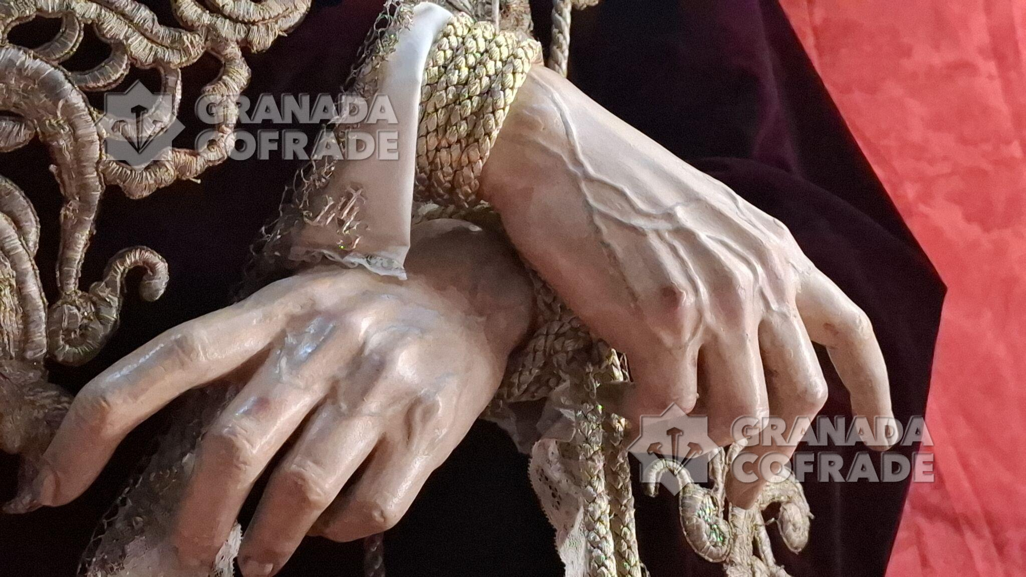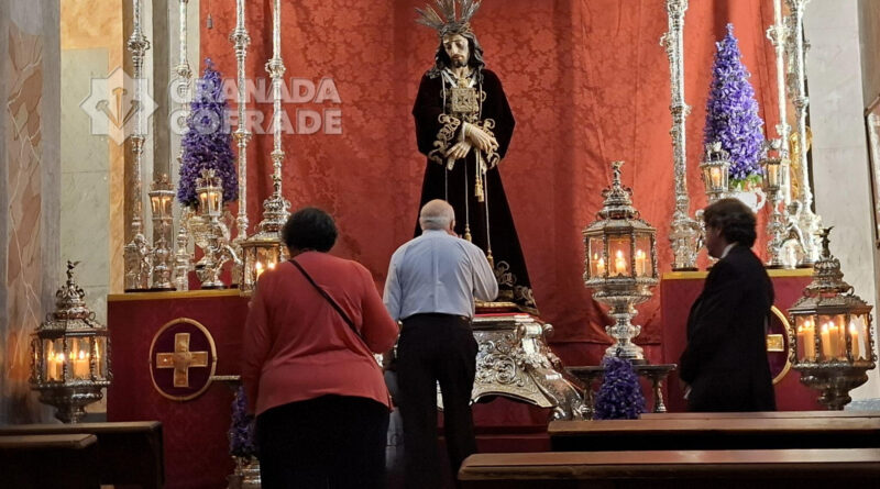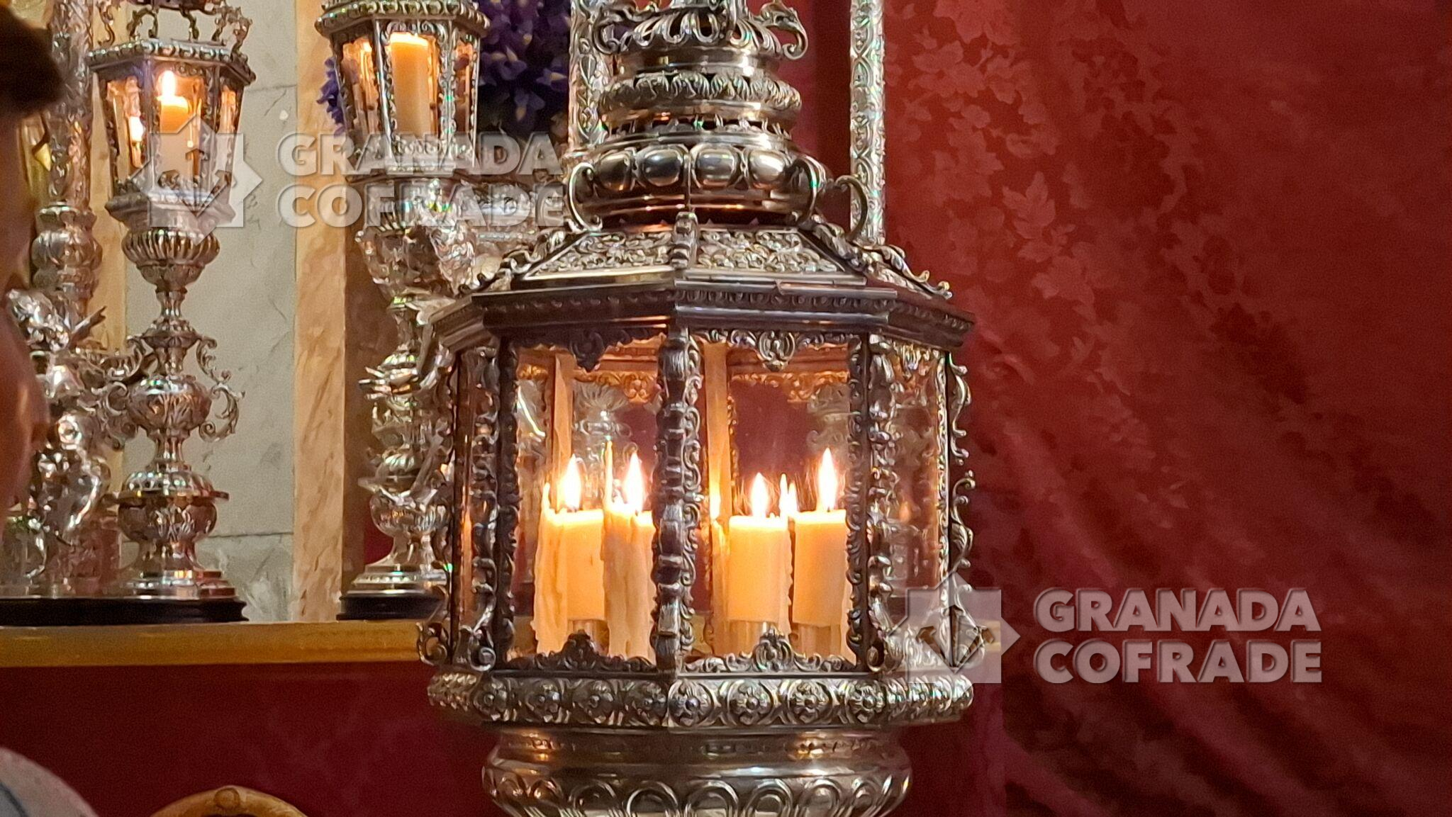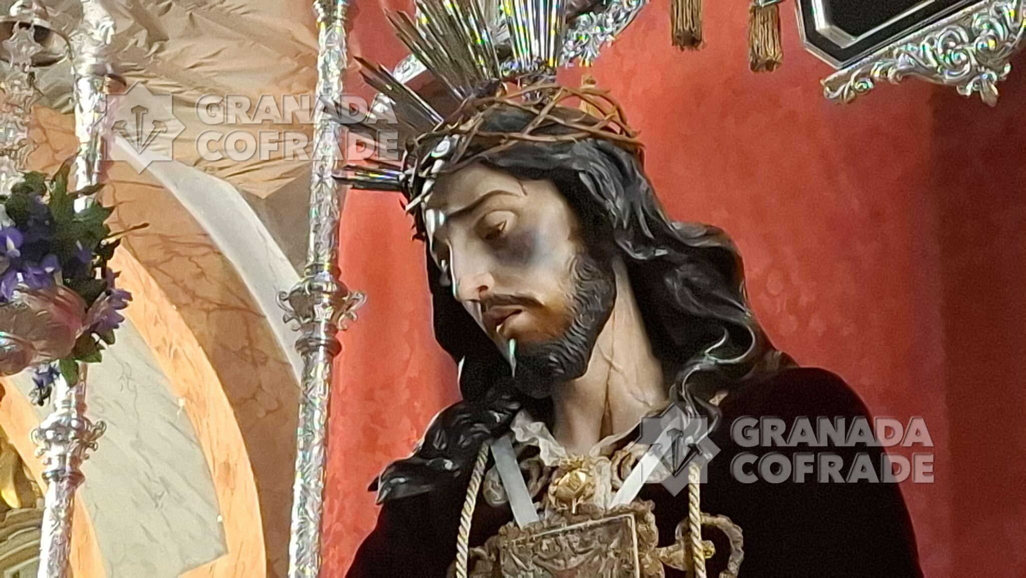 Jesús del Rescate se presentaba sobre la peana de plata de ley, obra de Navas Parejo y flanqueado por los faroles de orfebrería del paso procesional. Dos jarras de iris morado eran el principal adorno del altar de cultos junto con unos pebeteros que pendían de las columnas laterales en el mismo tipo de flor. Durante la jornada fueron muchos los granadinos que se adentraron en el templo para venerar al Señor y orar ante Él. Ya por la noche concluía la celebración del día con la Eucaristía en su honor.