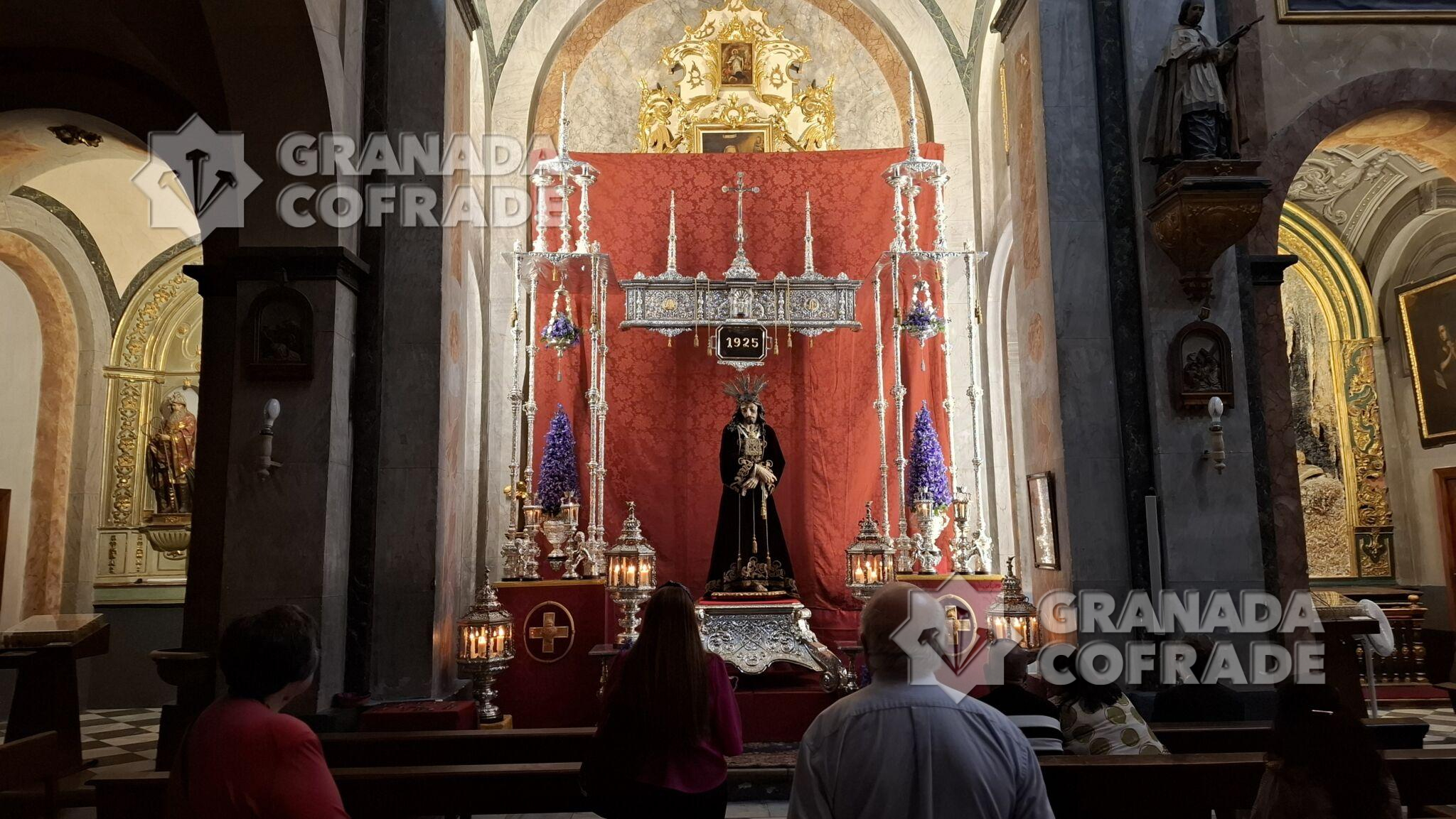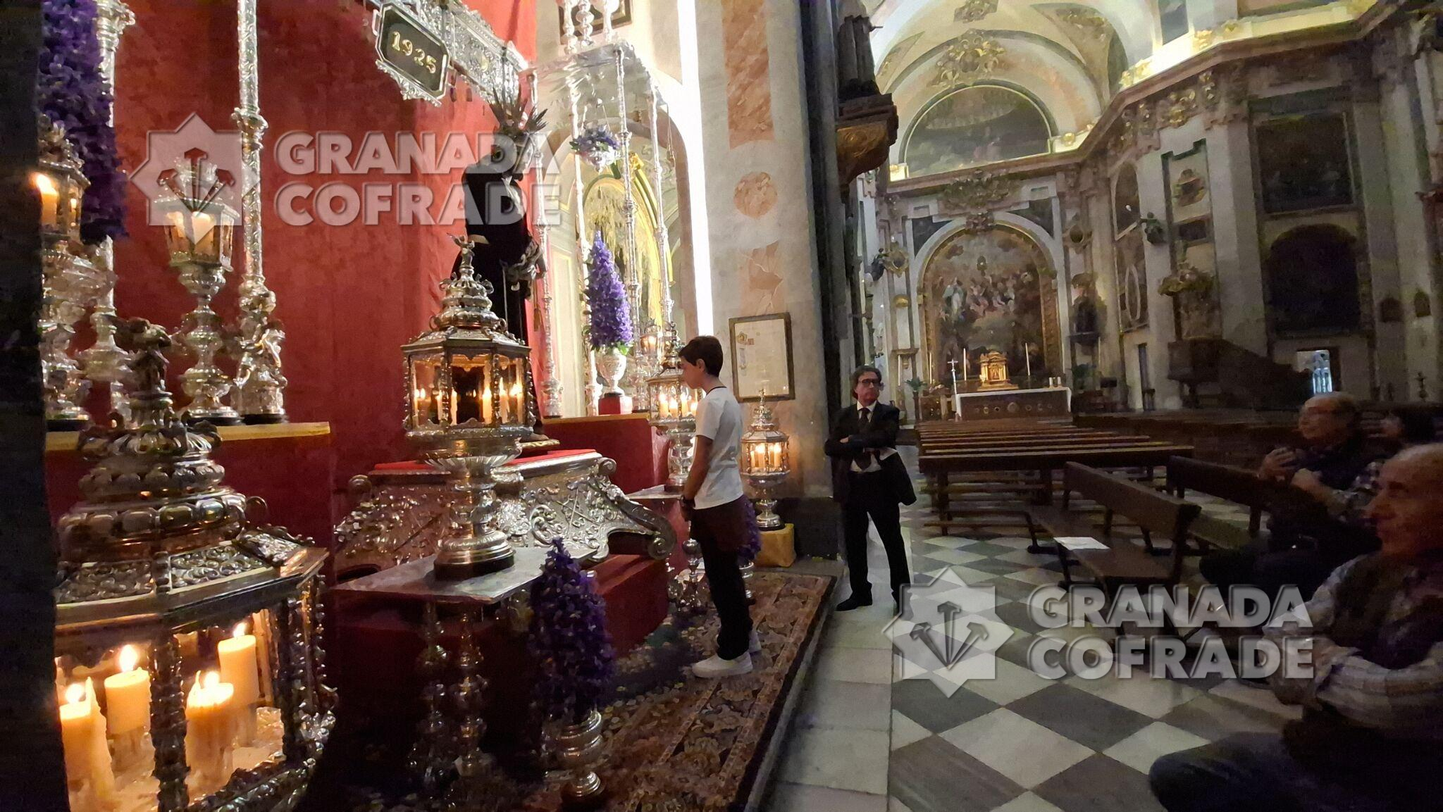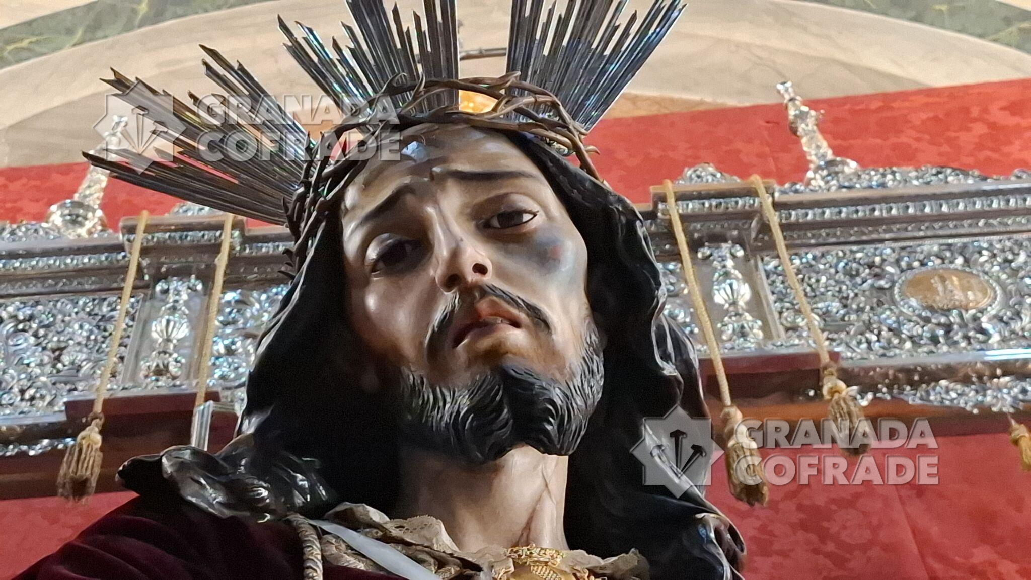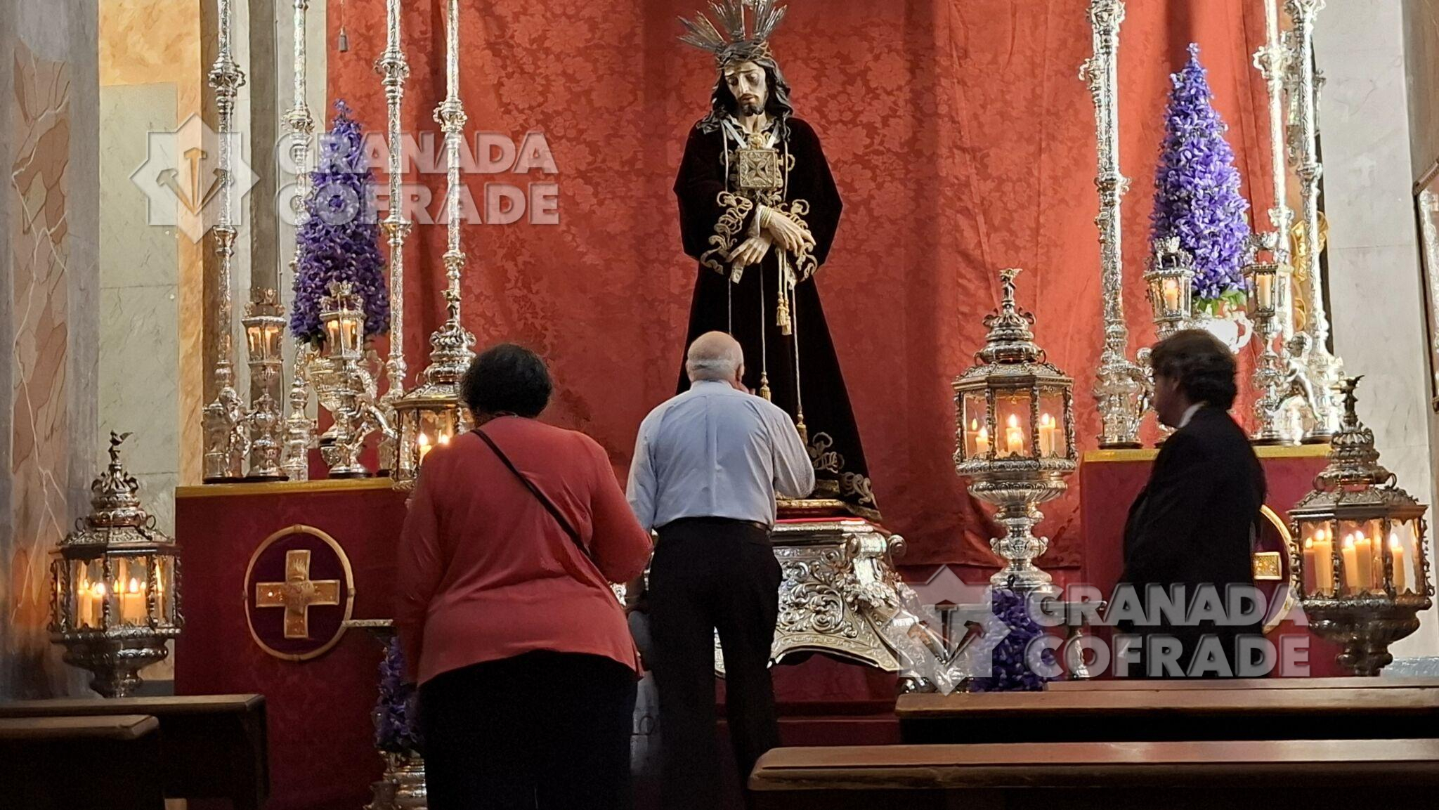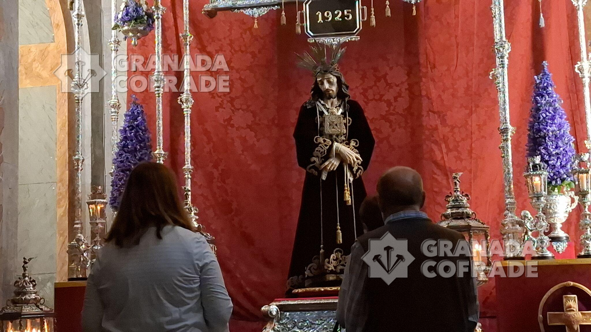 Jesús del Rescate se presentaba sobre la peana de plata de ley, obra de Navas Parejo y flanqueado por los faroles de orfebrería del paso procesional. Dos jarras de iris morado eran el principal adorno del altar de cultos junto con unos pebeteros que pendían de las columnas laterales en el mismo tipo de flor. Durante la jornada fueron muchos los granadinos que se adentraron en el templo para venerar al Señor y orar ante Él. Ya por la noche concluía la celebración del día con la Eucaristía en su honor.