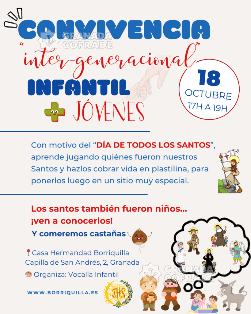 La cofradía de la Entrada de Jesús en Jerusalén convoca la primera convivencia infantil junto a los jóvenes por el Día de Todos los Santos. Bajo el lema “Los santos también fueron niños”, la hermandad celebrará una tarde de fe, creatividad y convivencia intergeneracional, iniciando así su curso cofrade «con energías renovadas y una actividad muy especial: una Convivencia Infantil y Juvenil que se celebrará el próximo sábado 18 de octubre, de 17:00 a 19:00 horas, en la Casa de Hermandad (C/ Capilla de San Andrés, nº2 – Granada)», cuentan desde la junta de gobierno.