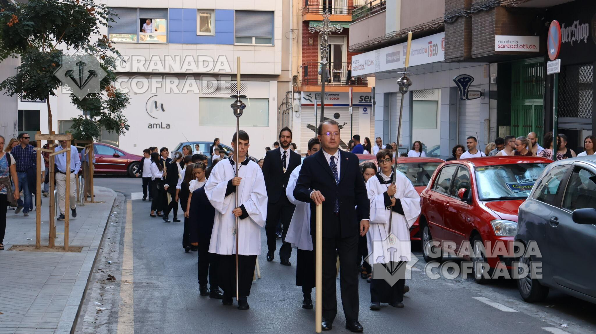 El cortejo contó con la presencia de largas filas de hermanos pertenecientes a distintos niveles de enseñanza del colegio de Santo Tomás de Villanueva y el acompañamiento del prior general de la Orden de Agustinos Recoletos, fray Miguel Ángel Hernández, además del Padre Vicario General, Fr. José María Martín, el P. Secretario General, Fr. Luciano Audisio y por la Comunidad del Corpus Christi (Hospitalicos), Fr. Francisco Ariza y el Hermano Mayor de la Archicofradía, Eduardo de la Plaza. Tras el paso procesional, mandado por David Barranco, estaba el prior de la Comunidad de Santo Tomás de Villanueva, Director Espiritual y Párroco de Santo Tomás de Villanueva, Fray Ángel Antonio García Cuadrado. Cerraba el cortejo la banda de música de Los Ángeles, dirigida por Manuel Elvira.