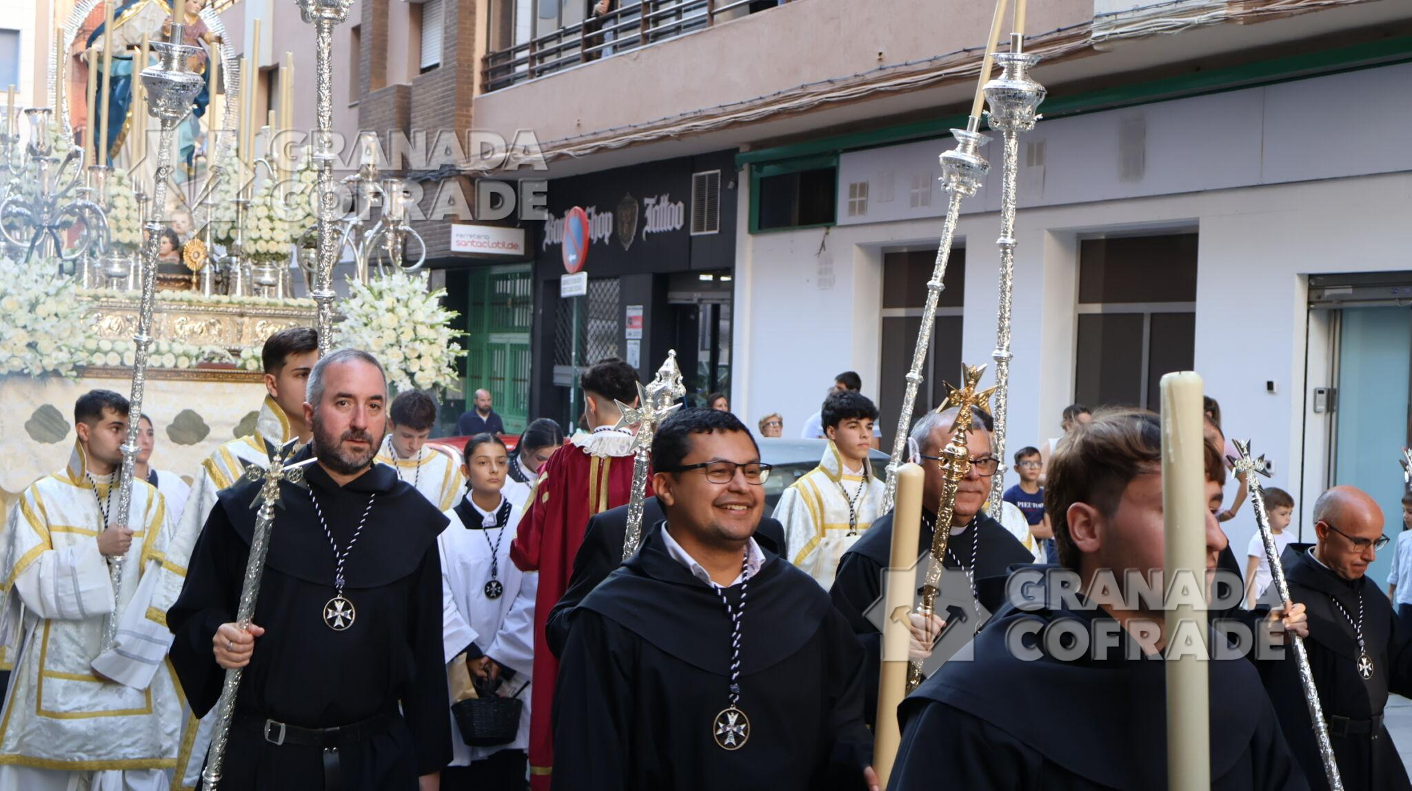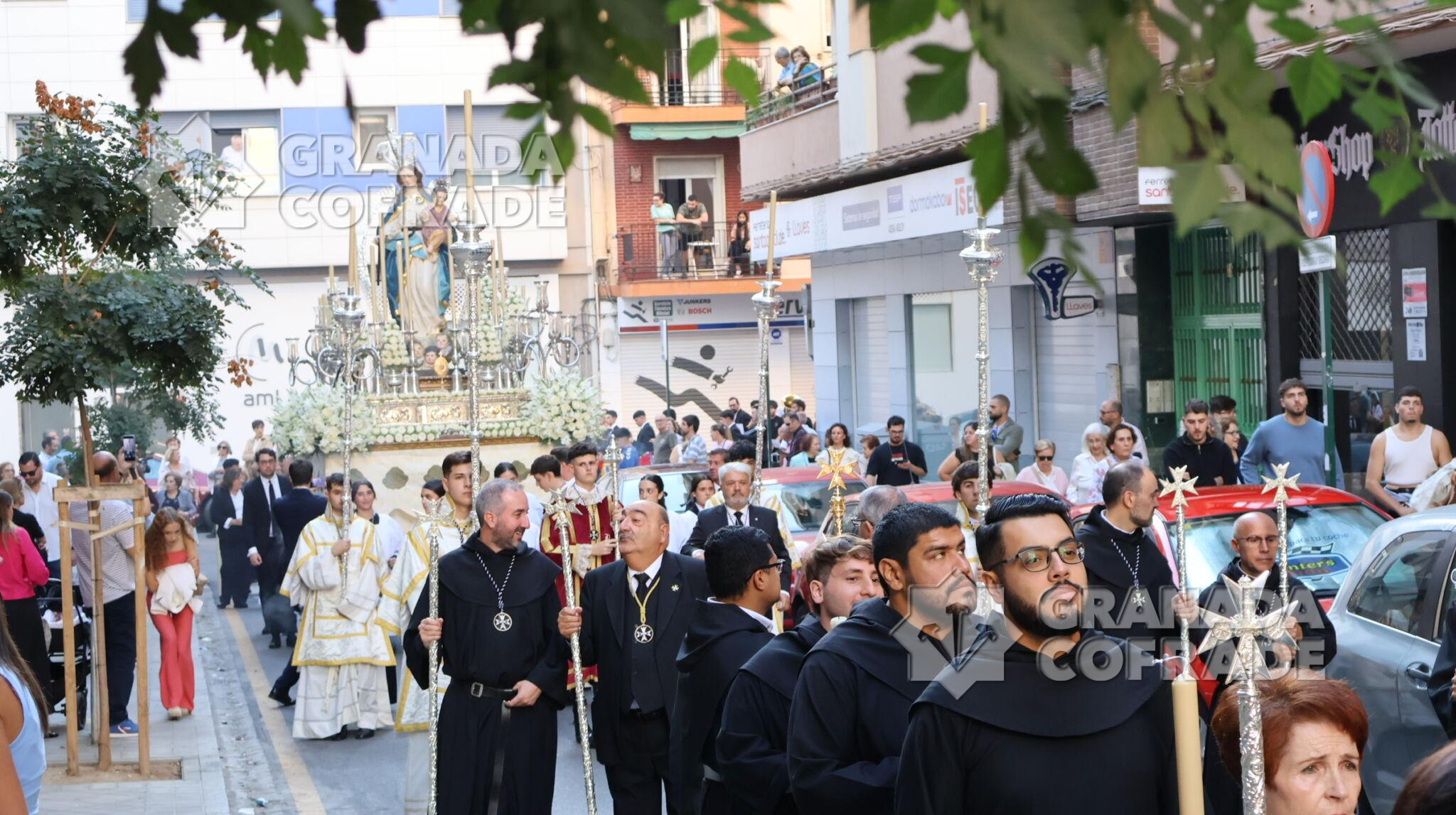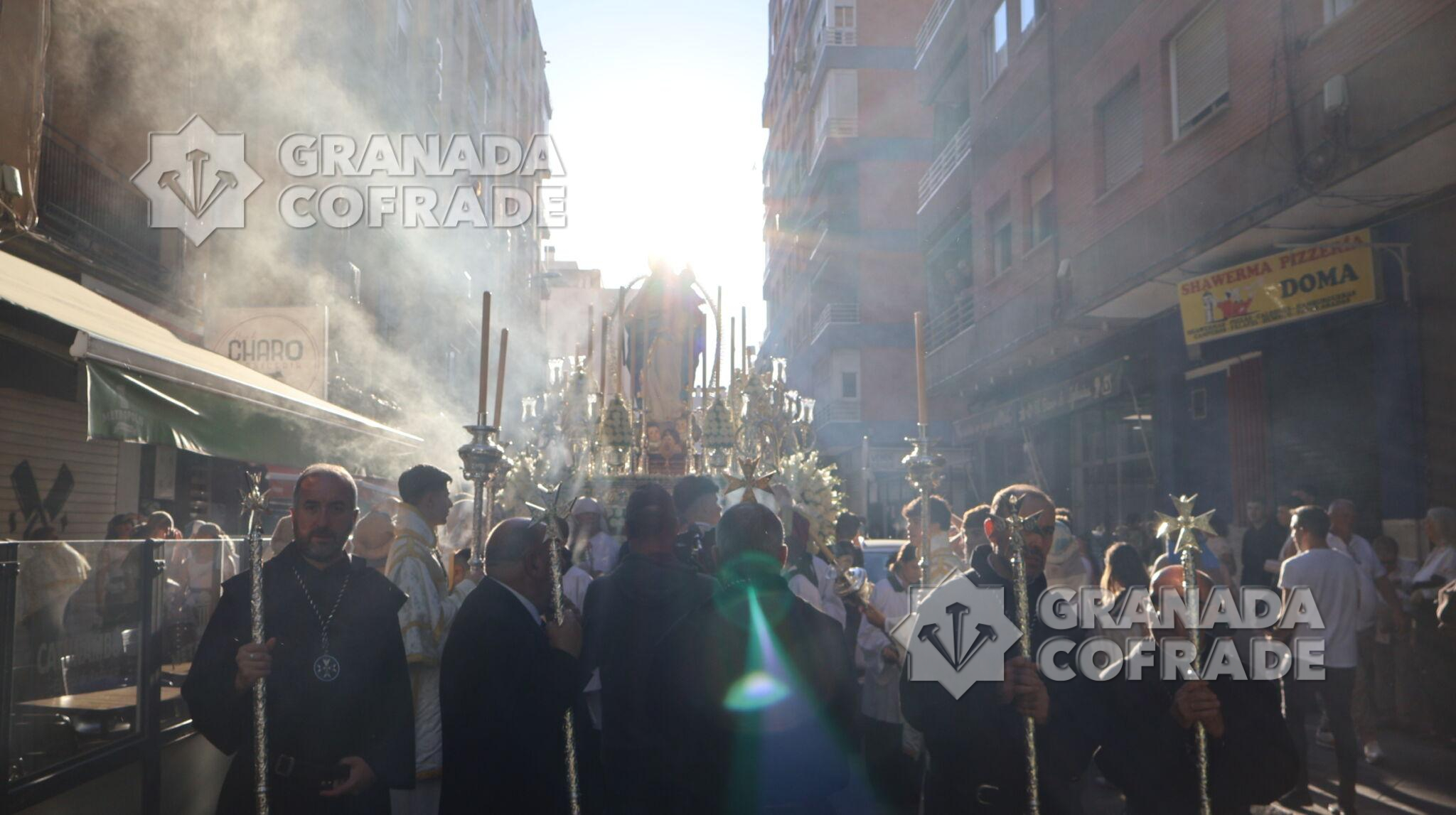 La procesión de Nuestra Señora de la Consolación y Correa de San Agustín, de la Archicofradía de su nombre, recorrió ayer las calles que separan el barrio de La Rosaleda del centro de la capital hasta llegar por Martínez de la Rosa y Gran Capitán hasta la parroquia de Santa María Magdalena para realizar en este lugar la estación de gloria de esta corporación letífica agustina.