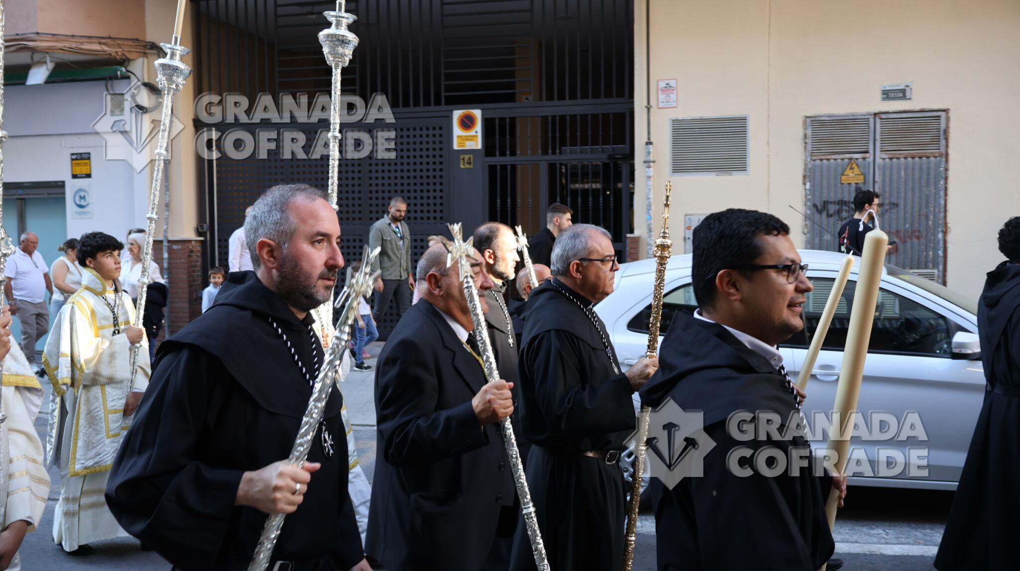 El cortejo contó con la presencia de largas filas de hermanos pertenecientes a distintos niveles de enseñanza del colegio de Santo Tomás de Villanueva y el acompañamiento del prior general de la Orden de Agustinos Recoletos, fray Miguel Ángel Hernández, además del Padre Vicario General, Fr. José María Martín, el P. Secretario General, Fr. Luciano Audisio y por la Comunidad del Corpus Christi (Hospitalicos), Fr. Francisco Ariza y el Hermano Mayor de la Archicofradía, Eduardo de la Plaza. Tras el paso procesional, mandado por David Barranco, estaba el prior de la Comunidad de Santo Tomás de Villanueva, Director Espiritual y Párroco de Santo Tomás de Villanueva, Fray Ángel Antonio García Cuadrado. Cerraba el cortejo la banda de música de Los Ángeles, dirigida por Manuel Elvira.